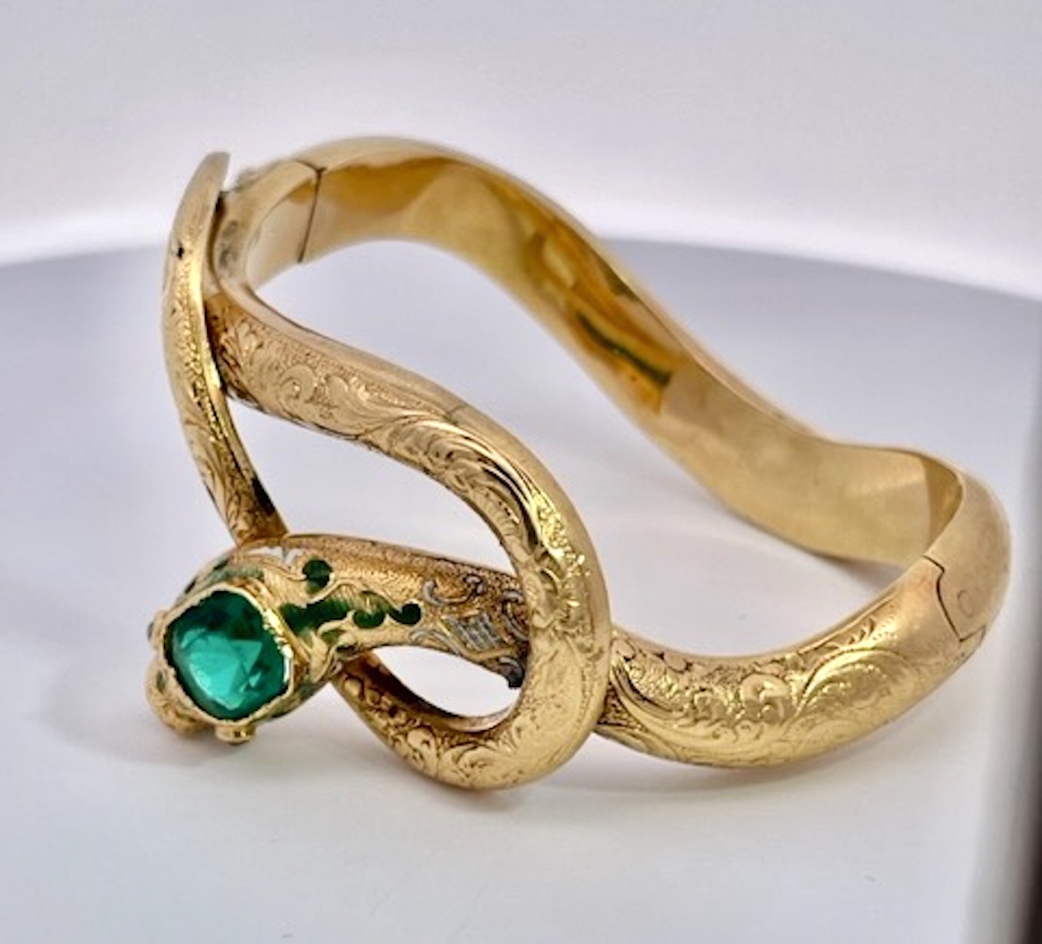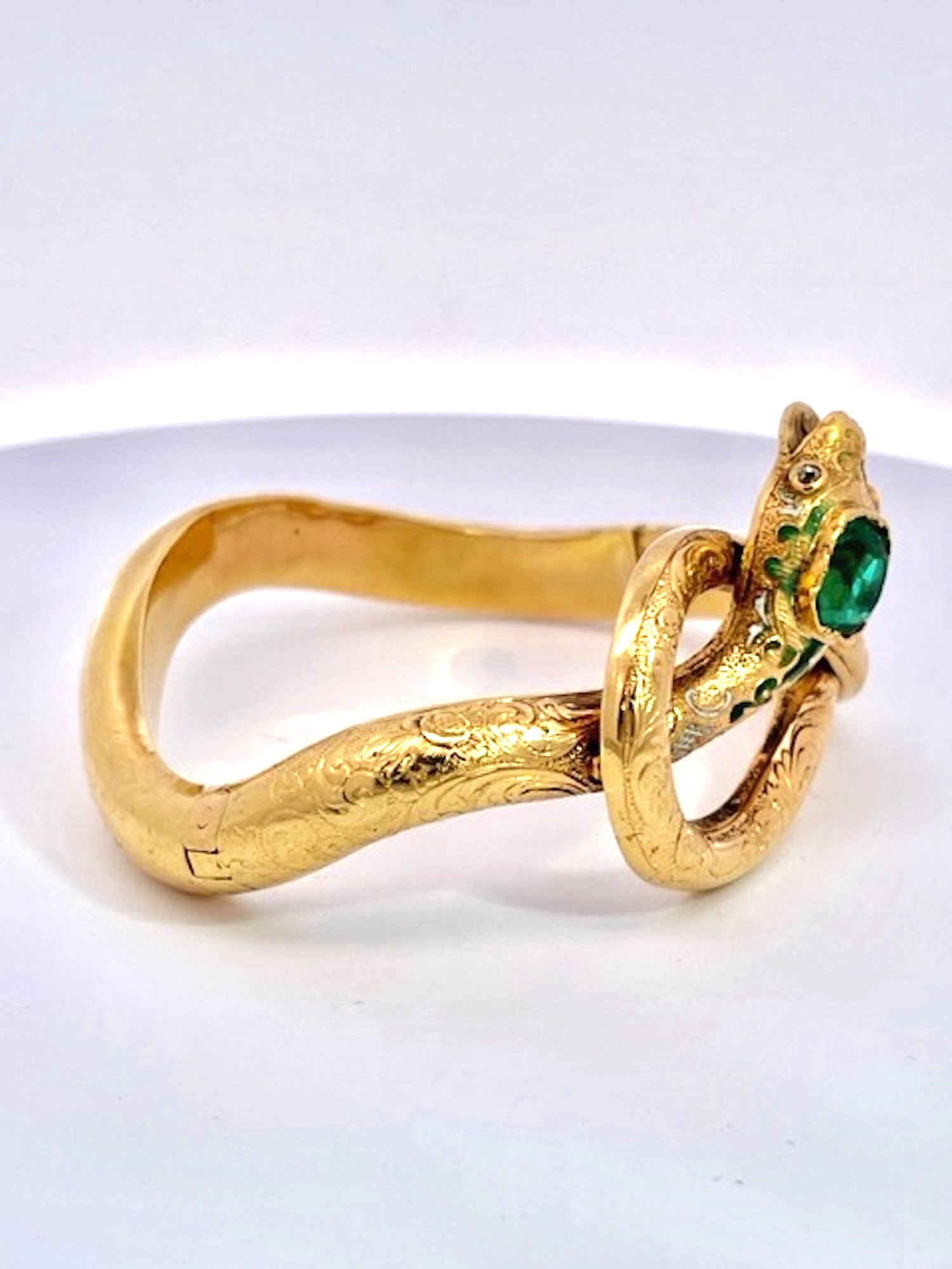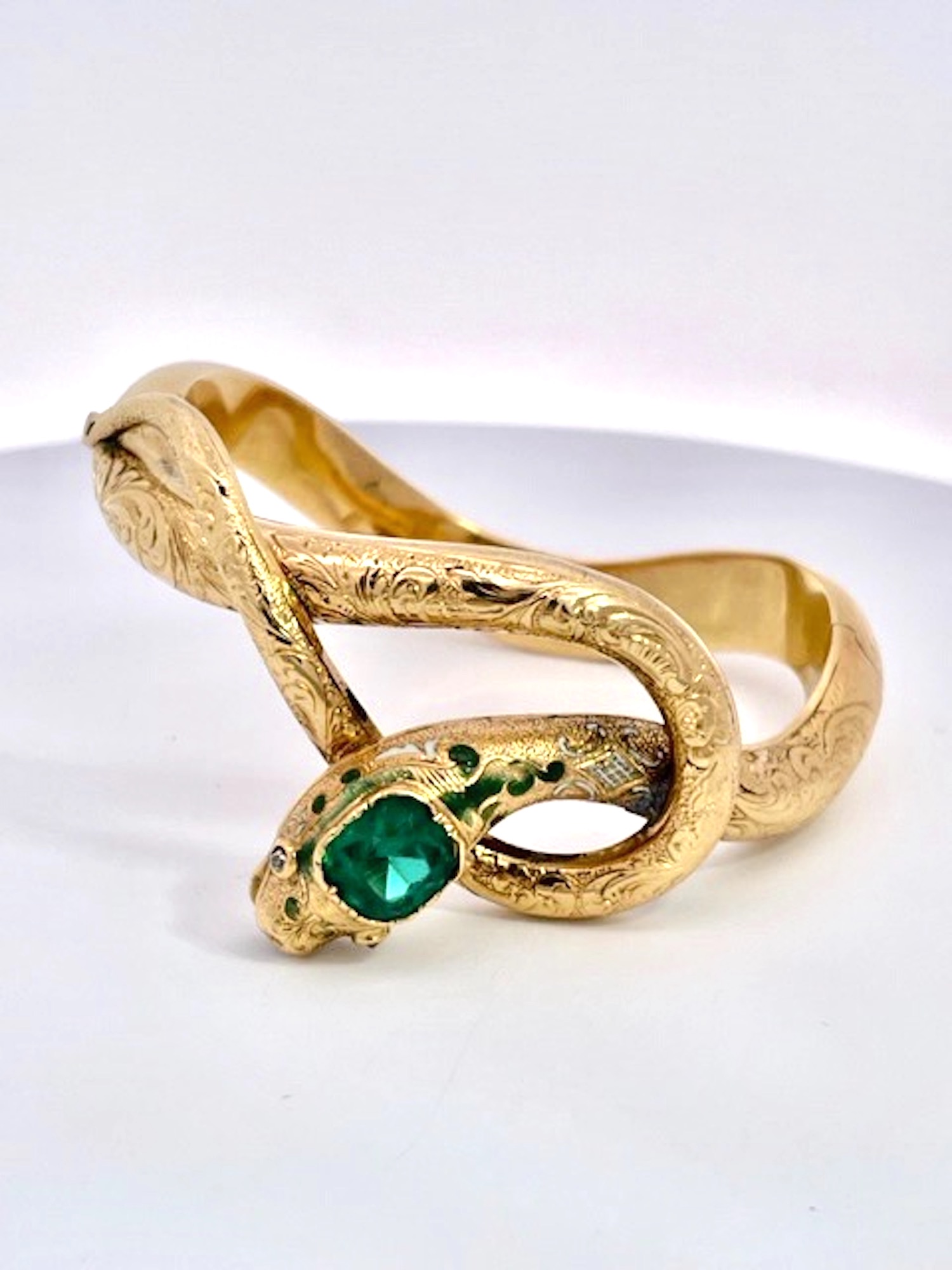 Here we go again with another magnificent snake bracelet. By now you all know that I love snake jewelry and I am always on the lookout for great special snakes. This snake bracelet comes out of France is is from the turn of the century approximately 1900 to 1910 and has a full etches or chased front. At one time there was green enamel around the head but that has faded but it does not distract from the beauty of this piece. The Emerald Head is synthetic the rest is gorgeous. This weighs 20.38 grams and has two Garnet eyes. The back is smooth no etchings and this really packs a punch as this is unusual to find a snake bracelet with Emeralds.