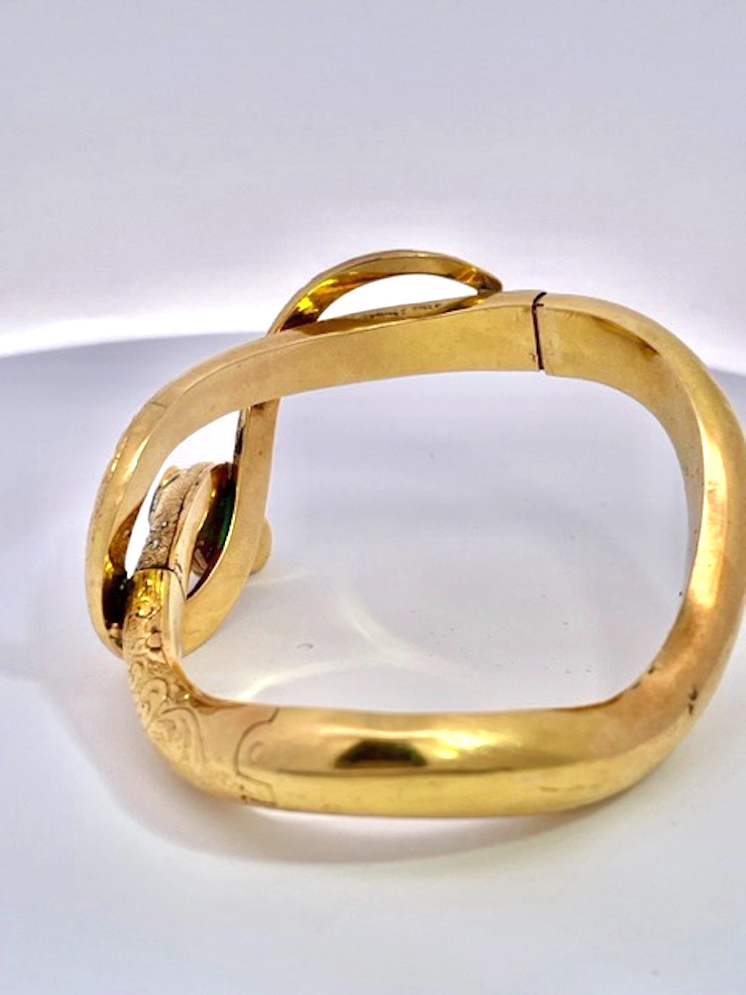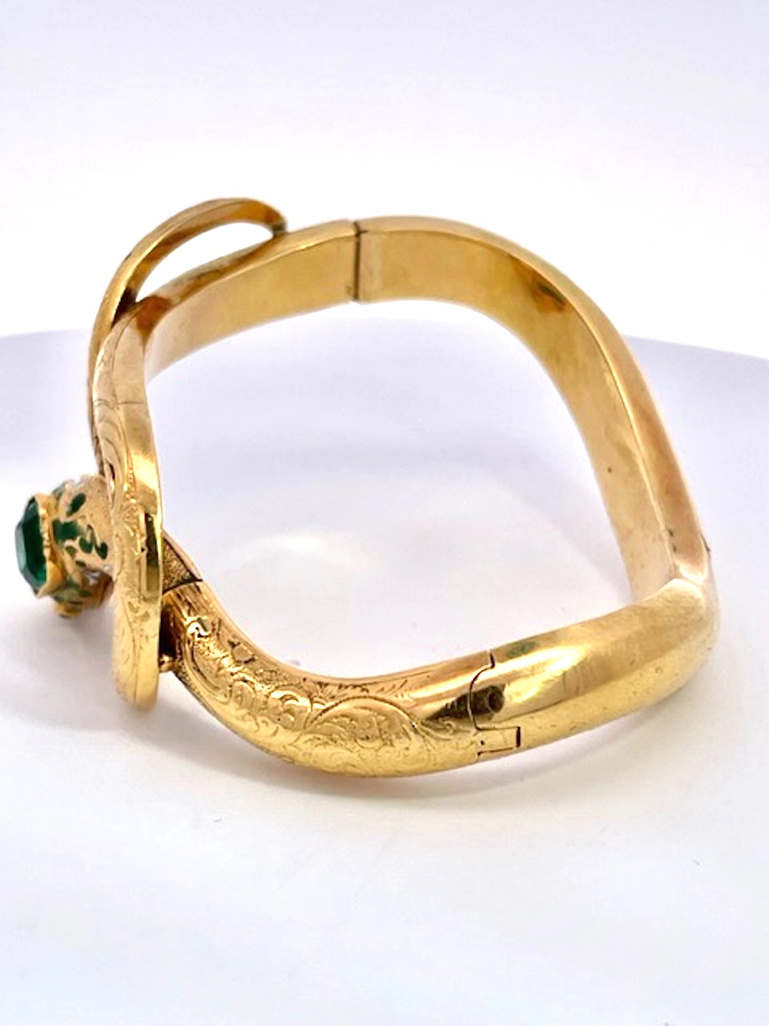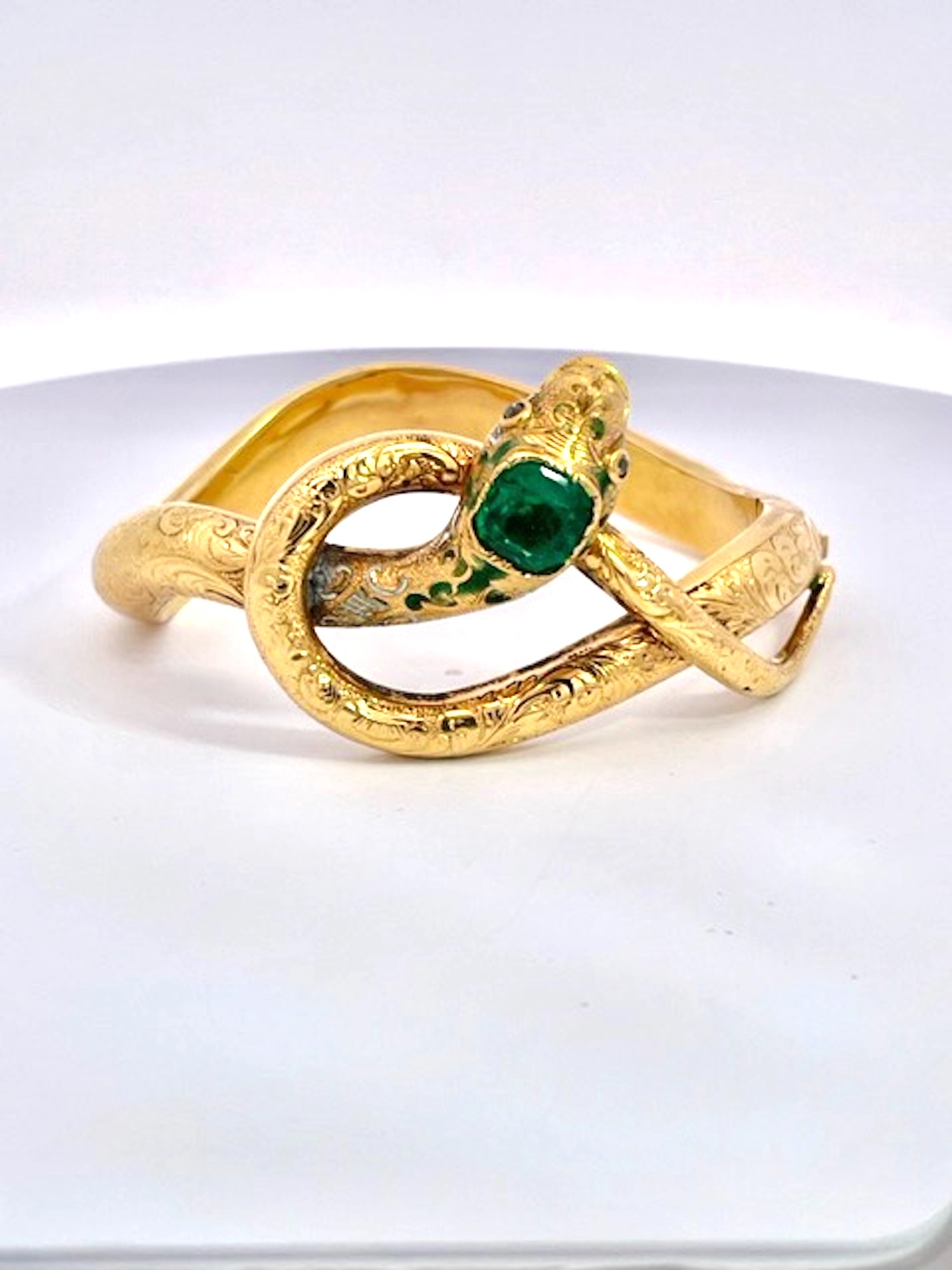 Here we go again with another magnificent snake bracelet. By now you all know that I love snake jewelry and I am always on the lookout for great special snakes. This snake bracelet comes out of France is is from the turn of the century approximately 1900 to 1910 and has a full etches or chased front. At one time there was green enamel around the head but that has faded but it does not distract from the beauty of this piece. The Emerald Head is synthetic the rest is gorgeous. This weighs 20.38 grams and has two Garnet eyes. The back is smooth no etchings and this really packs a punch as this is unusual to find a snake bracelet with Emeralds.