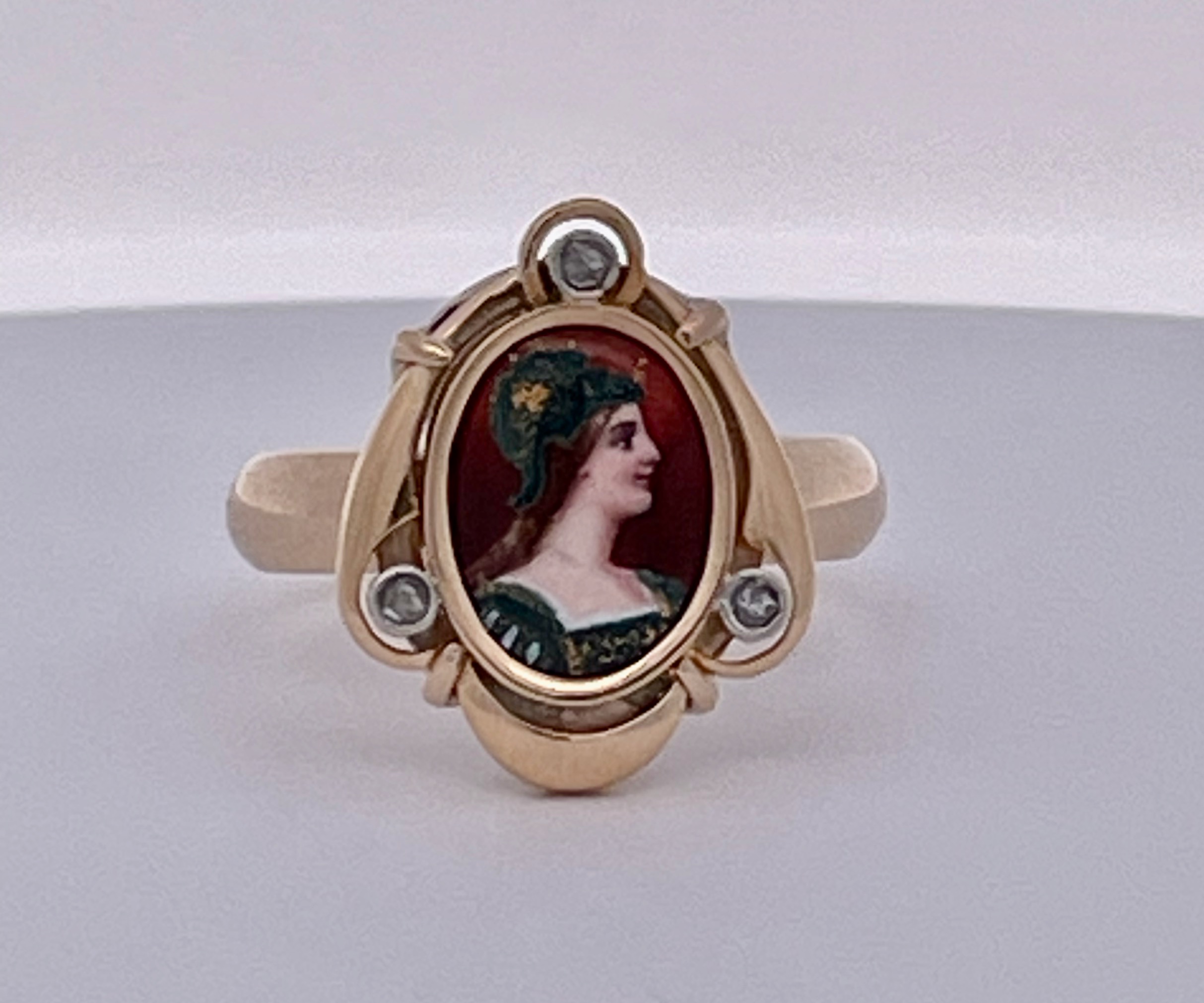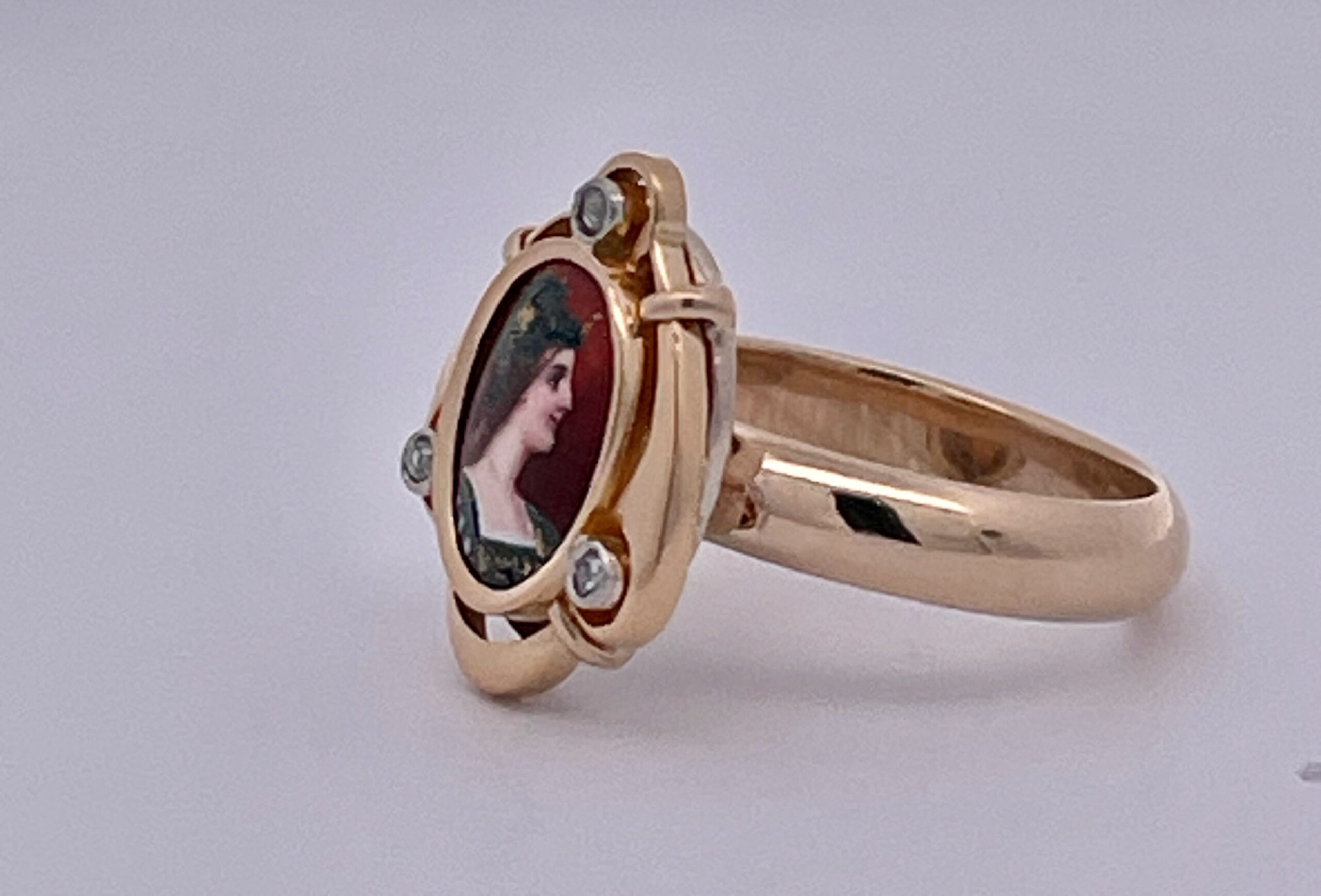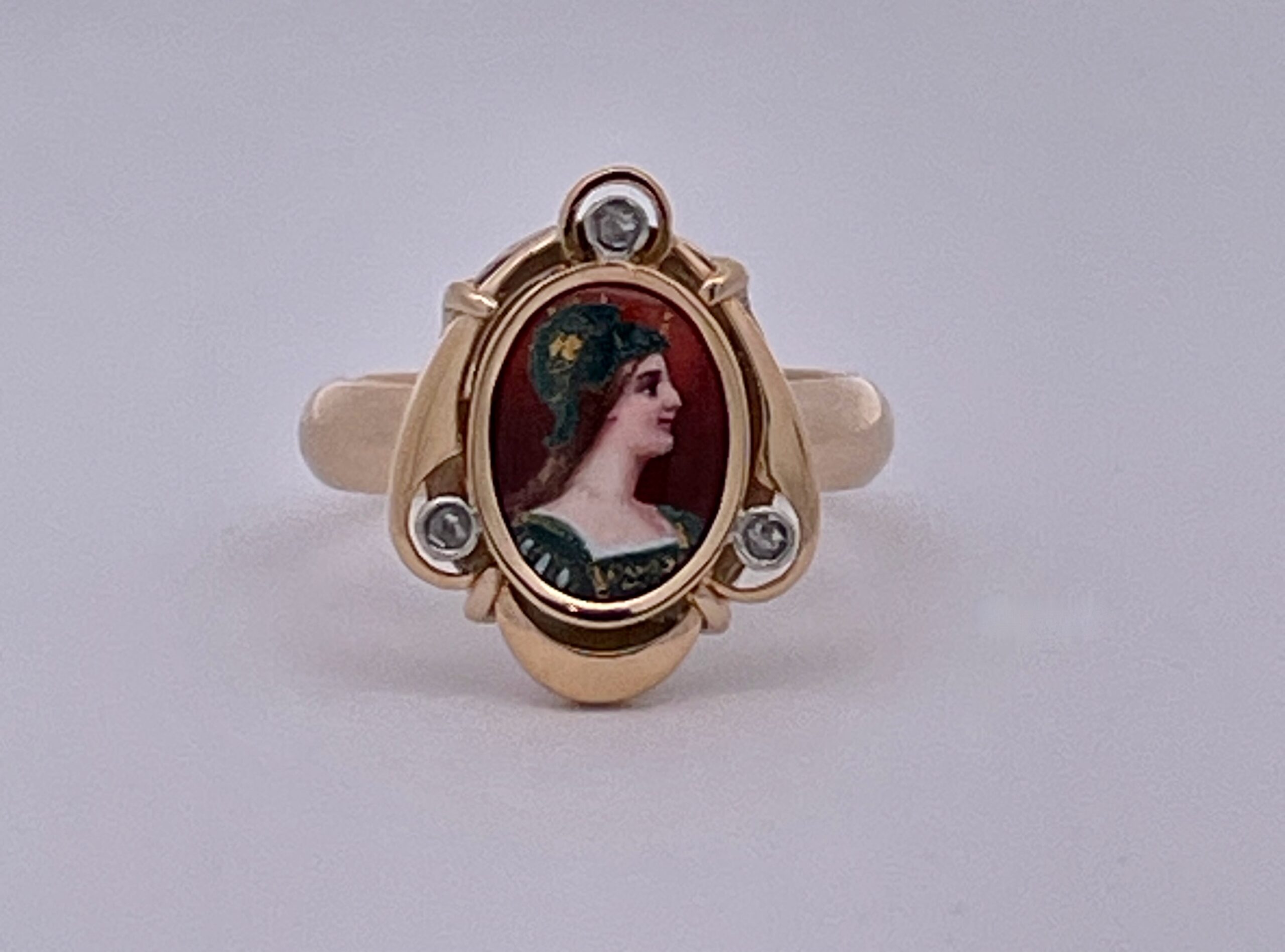 This lovely ring with a detailed enamel portrait of Athena is detailed with 3 tiny Diamond in the surround. This is a small ring perfect for those ladies with smaller hands or as a pinky ring. This started life as a stick pin and I converted it to a ring as stickpins are no longer in style. This is all in 14K gold. These small portrait rings are very much in style and this is a wonderful example. The ring is set with 3 tiny Diamonds and a smooth back finish. It is sized 6.5 and weighs in at 5.70 grams. Do not wait this is waiting for you.