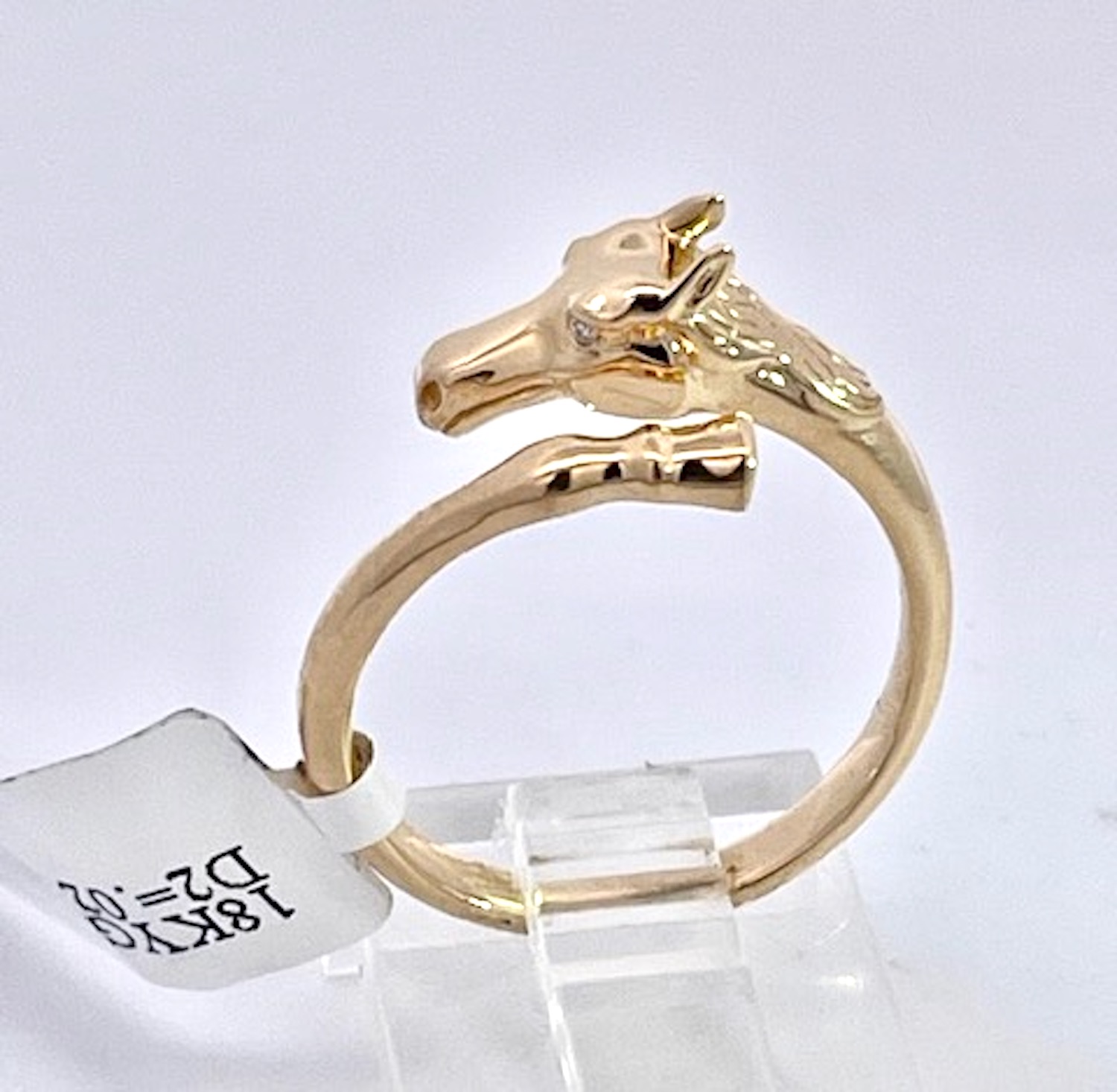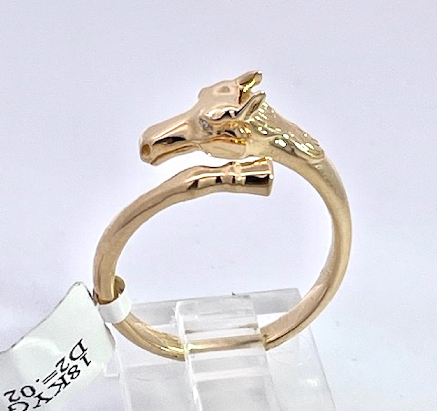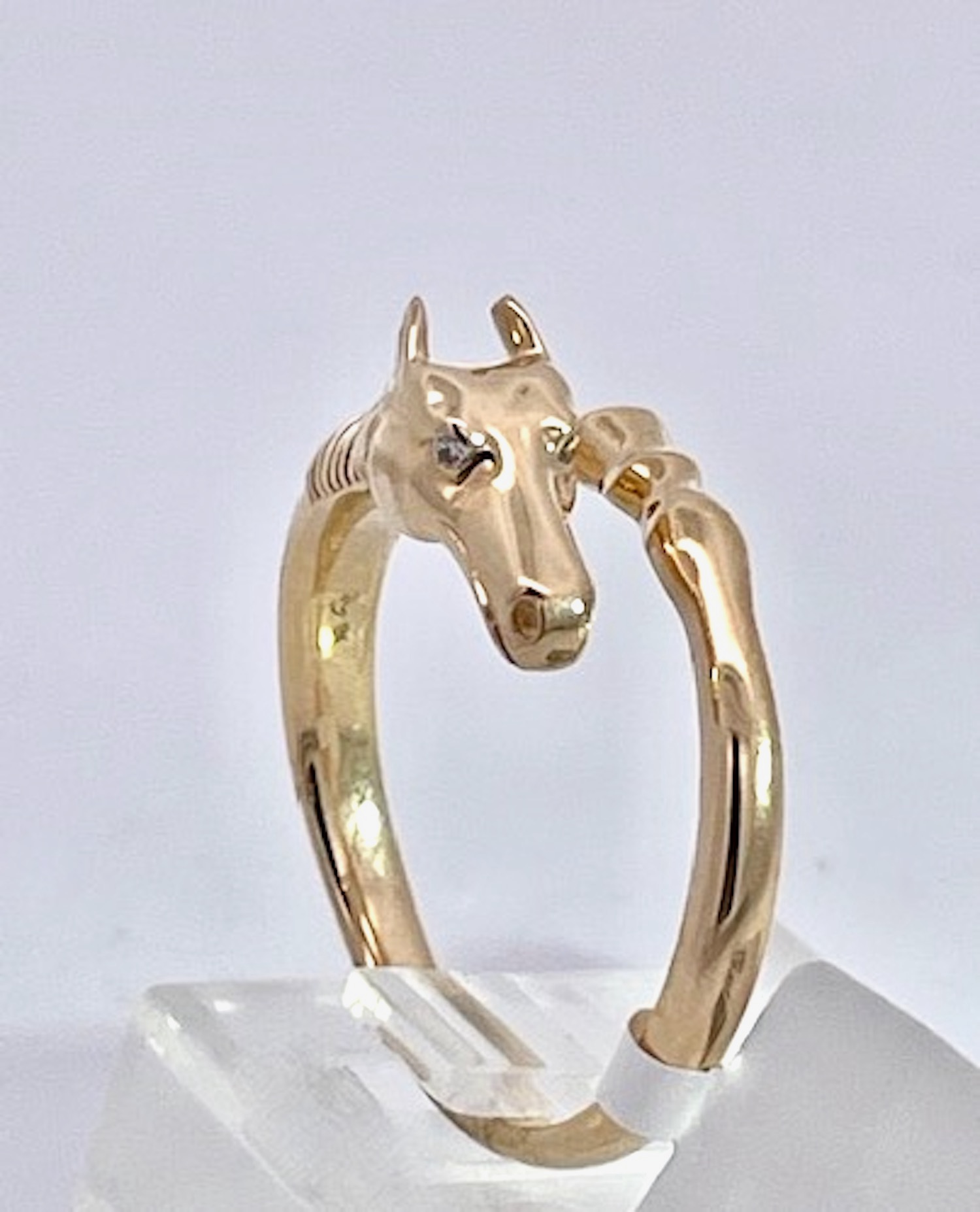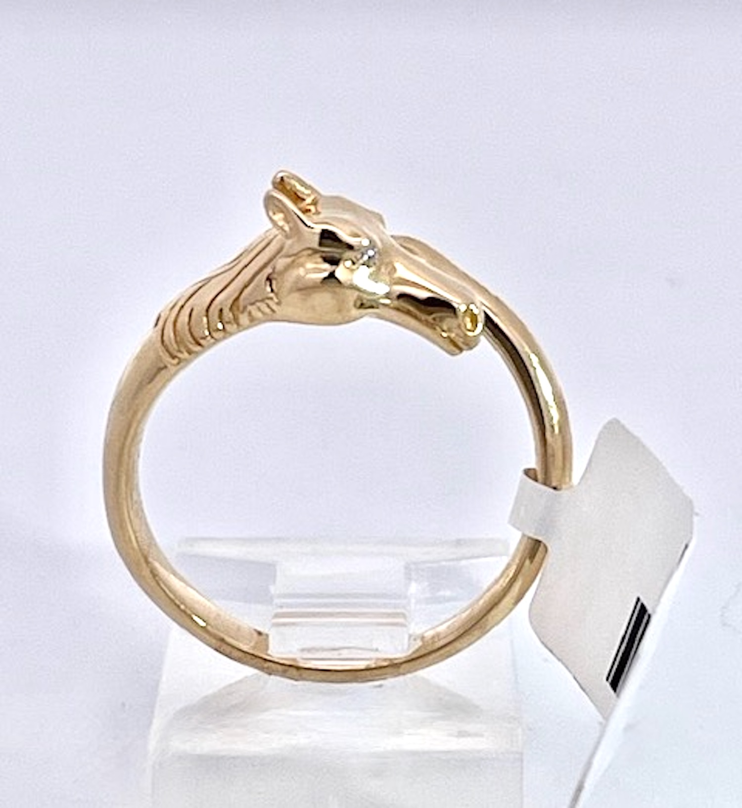 This 14K Yellow Gold ring is Doves by Doran Paloma and it is cute and special. It depicts a horse head and horse hoof is gold with tiny Diamond eyes. All horse lovers rejoice, here is your special ring. This ring is small in stature and thin it is for a smaller lady. It weighs in at 5.32 grams and a size 6.75. This ring is 1/4" wide and the band 3mm. Check out the details of this little ring it is special. You could also use this as a scarf holder that would be very smart looking.