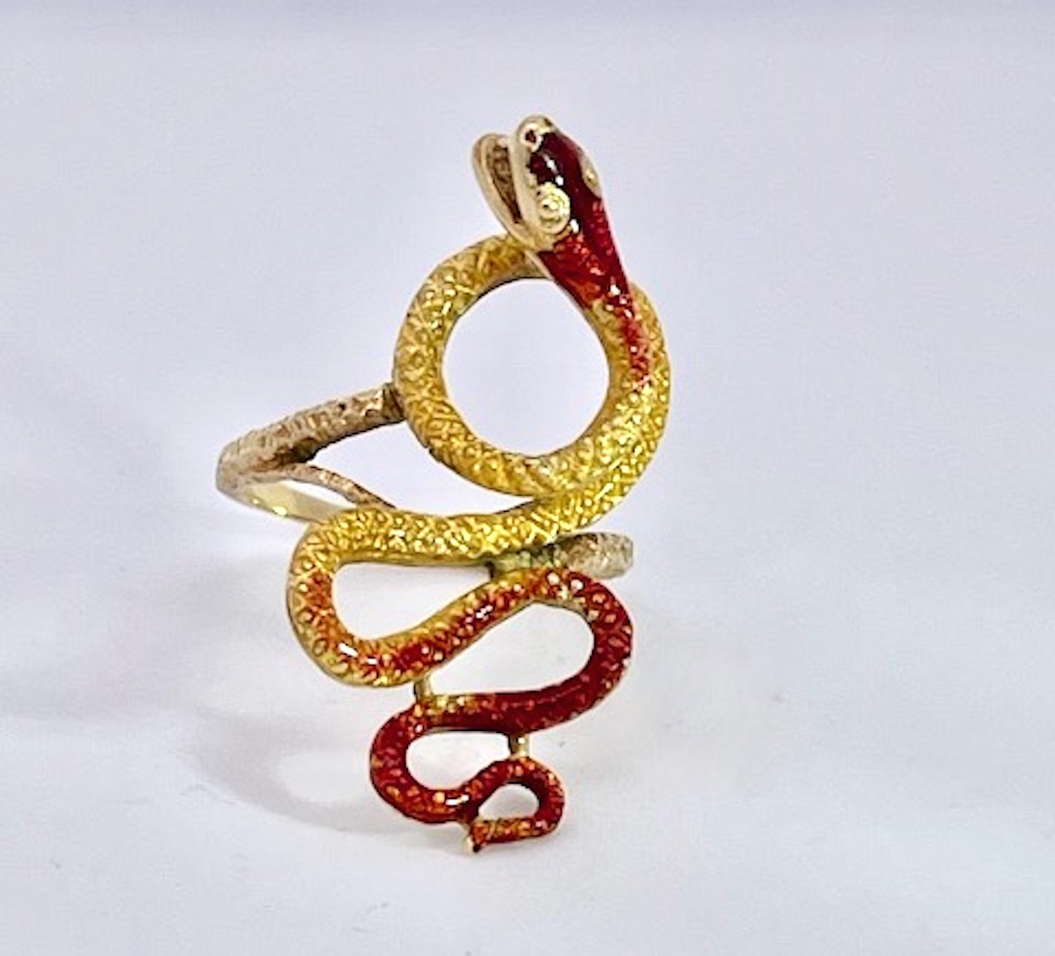 This lovely snake ring comes out of a lady's estate which she purchased in Florence in 1961. This ring is all enamel in shades of gold, yellow, orange and some brown. There is some enamel loss but little and it does not deflect from this lovely ring. The gold is 18K Yellow Gold and the snake takes on many curves. The body of this snake is etched like snakeskin and the body is thin and curving. This is a size 5 1/4 to 5 1/2 it is 1 3/4" long and 1/2" wide. This weighs in at 7.32 grams. This snake is very feminine with its curling and curving shape. Do not miss this as I do not think it will last long.