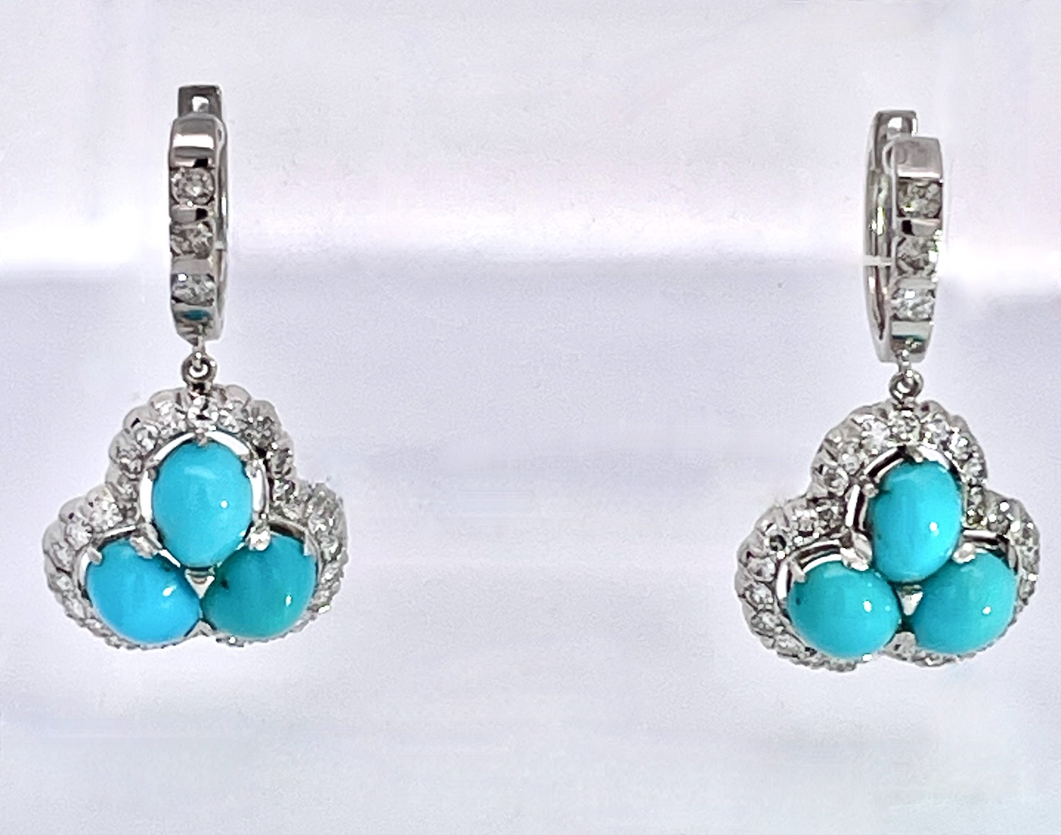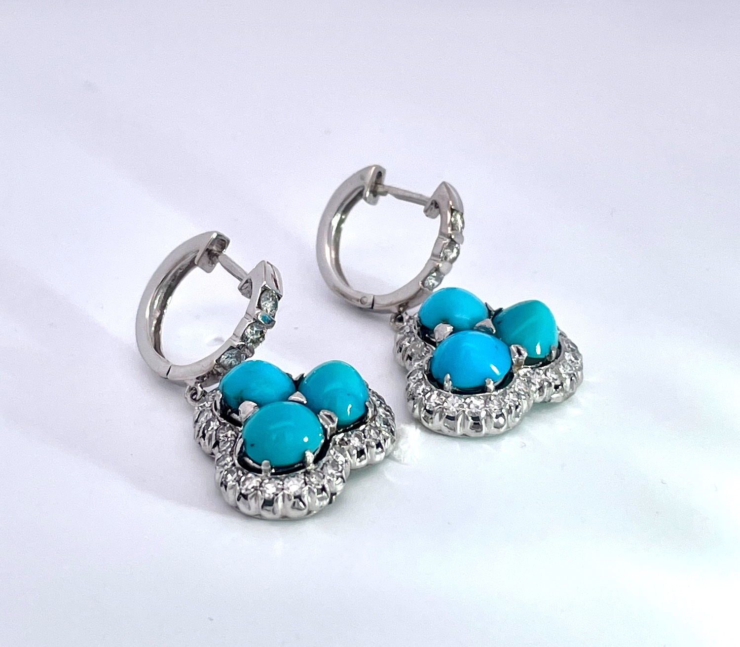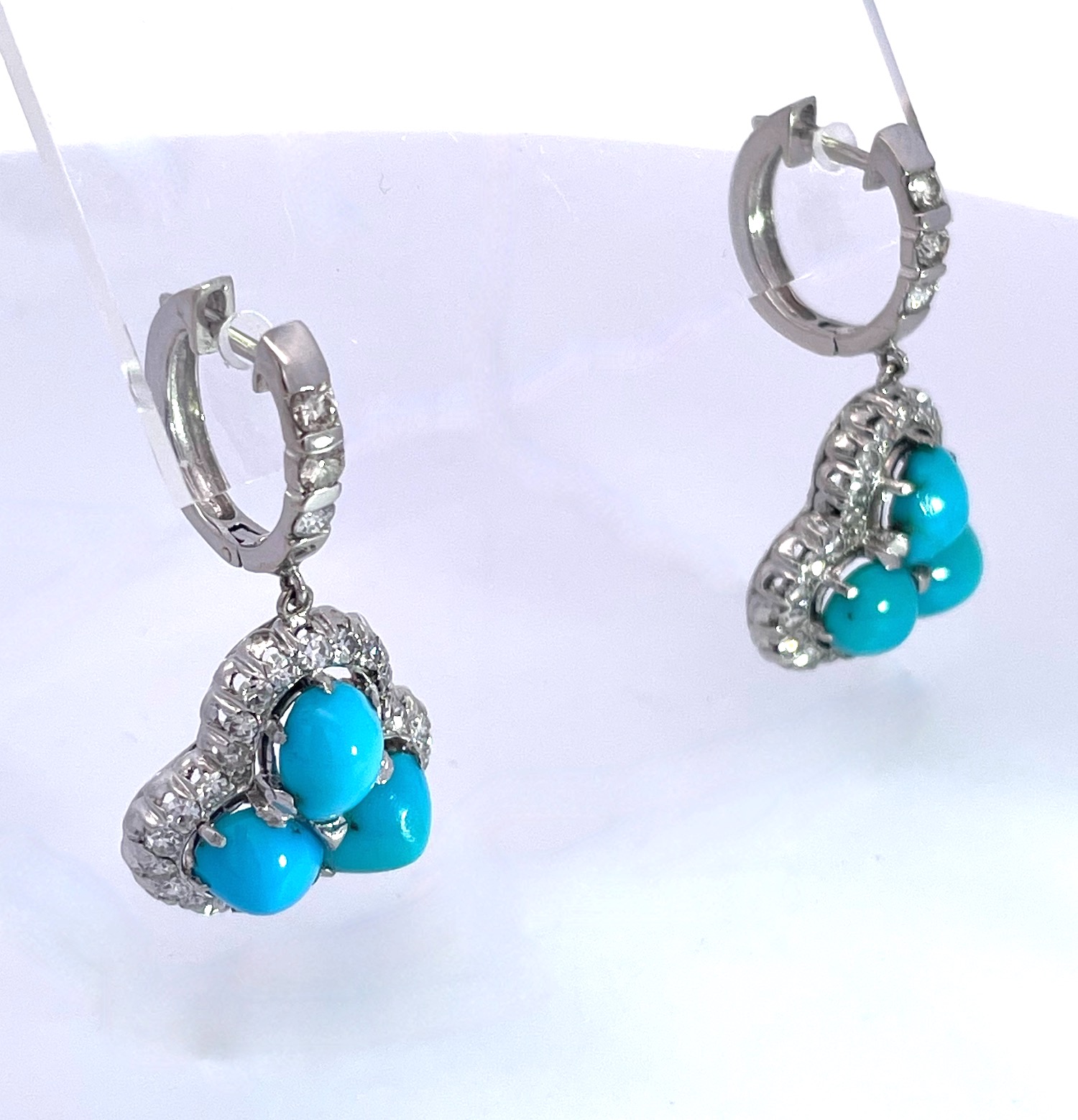 These earrings are special due to the perfect turquoise. Many people do not know that Persian Turquoise is not readily available as it comes out of Afghanistan. These earrings are so nice I was about to keep them and then I decided to list. These earrings have 3 turquoise stones on each earring with a Diamond surround and Diamonds on the loop. The Turquoise cabochons are approximately .70 each earring totals 2.10 plus carats for a total of 4.20 carats of Turquoise. There are also 50 small single cut Diamonds surround the Turquoise, and 3 small Diamonds on the loop. These weigh in at 9.88 grams and the depth is 5.7mm total length 30mm width is 1.75mm. Don't wait it may be too late.