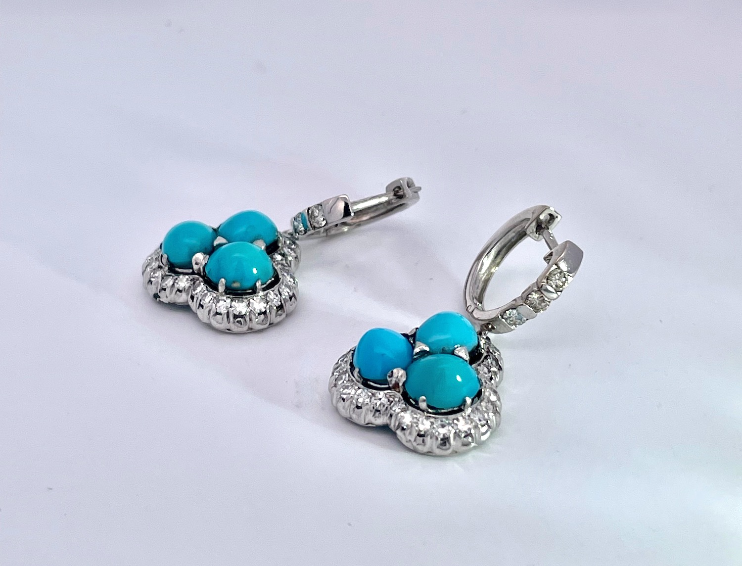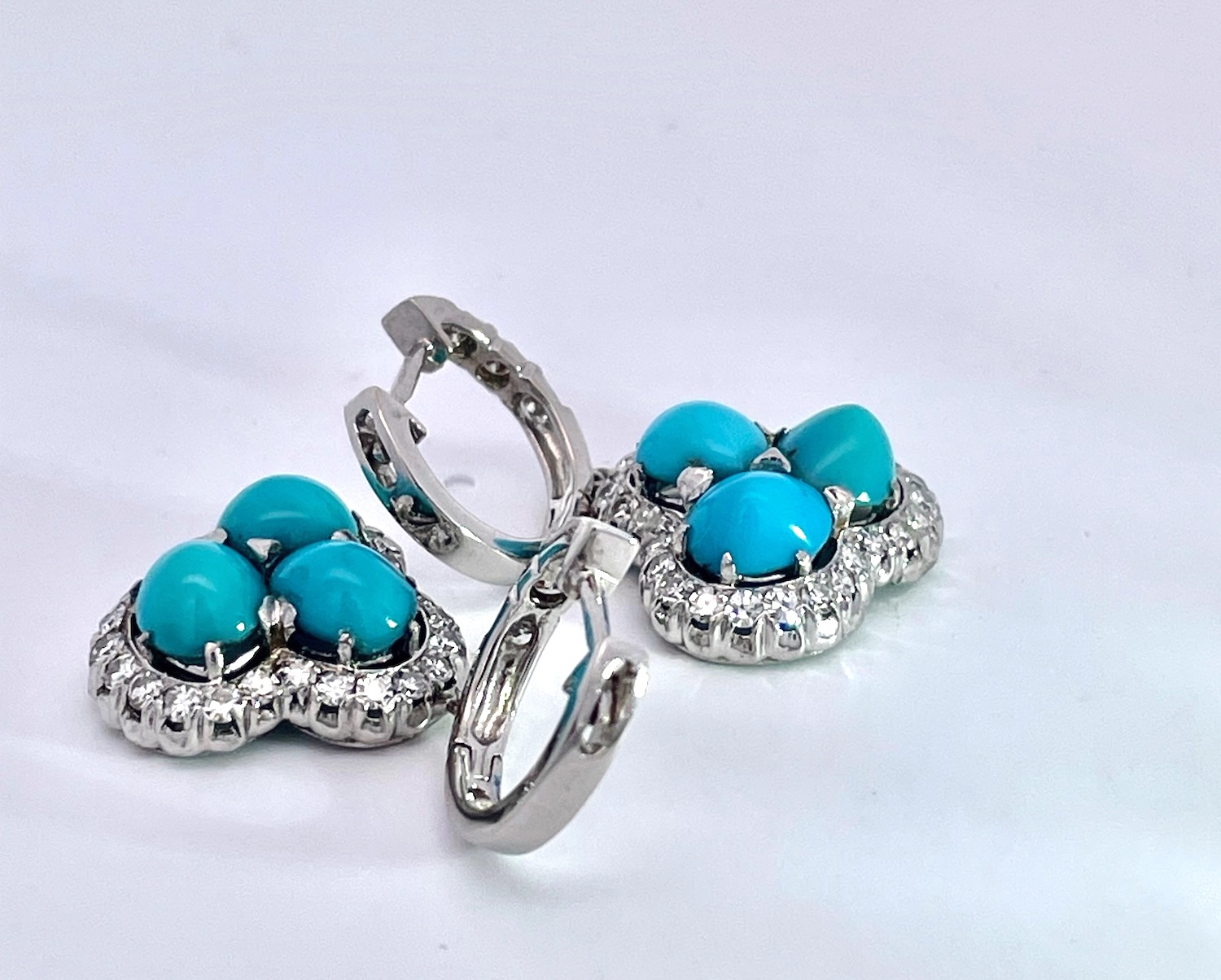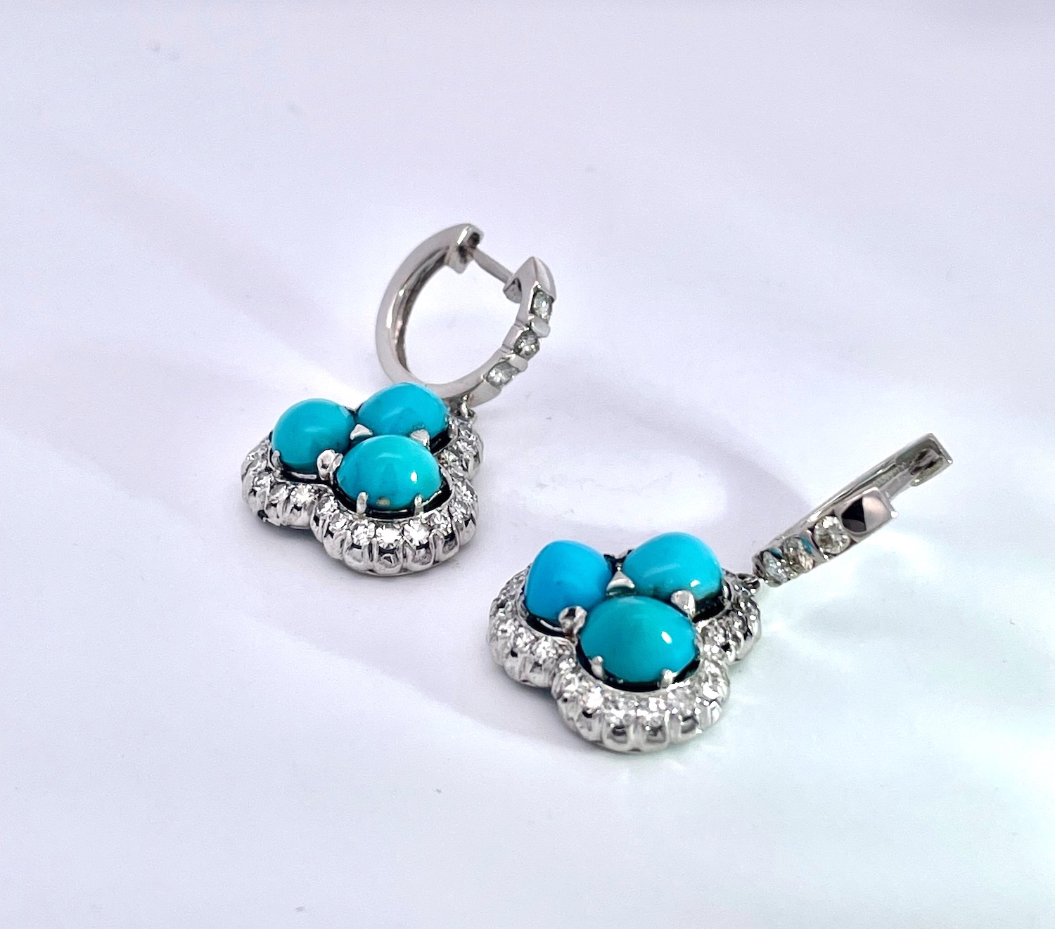 These earrings are special due to the perfect turquoise. Many people do not know that Persian Turquoise is not readily available as it comes out of Afghanistan. These earrings are so nice I was about to keep them and then I decided to list. These earrings have 3 turquoise stones on each earring with a Diamond surround and Diamonds on the loop. The Turquoise cabochons are approximately .70 each earring totals 2.10 plus carats for a total of 4.20 carats of Turquoise. There are also 50 small single cut Diamonds surround the Turquoise, and 3 small Diamonds on the loop. These weigh in at 9.88 grams and the depth is 5.7mm total length 30mm width is 1.75mm. Don't wait it may be too late.
