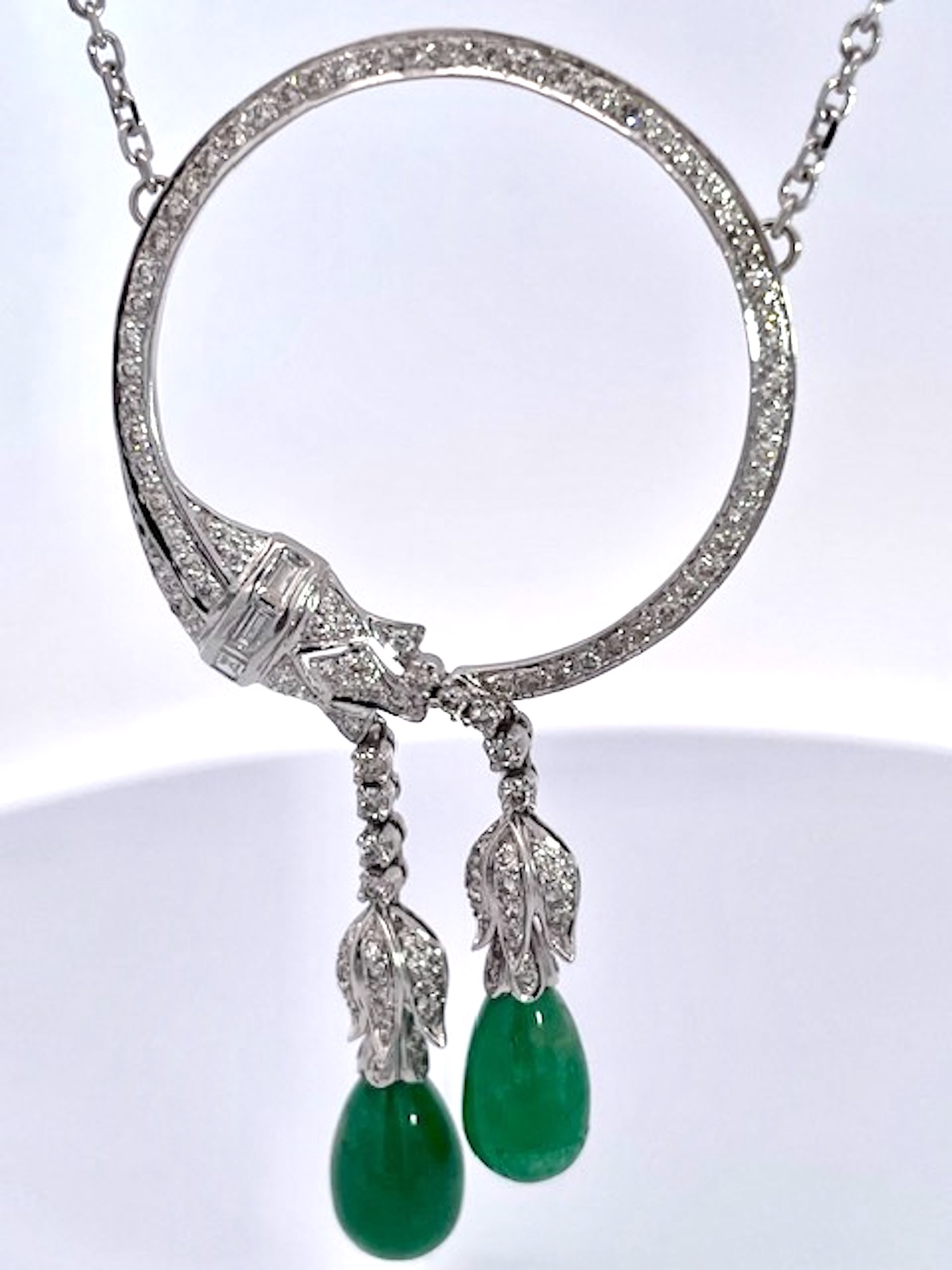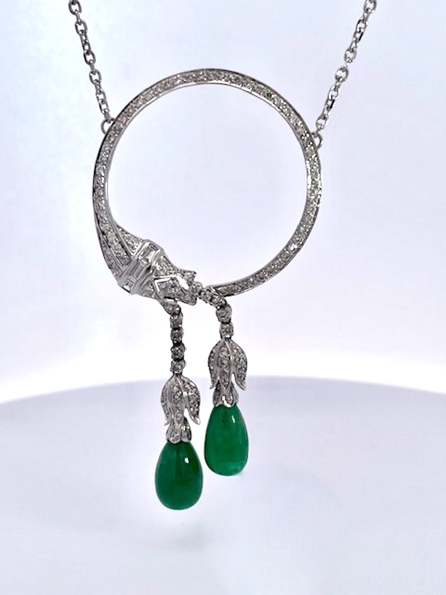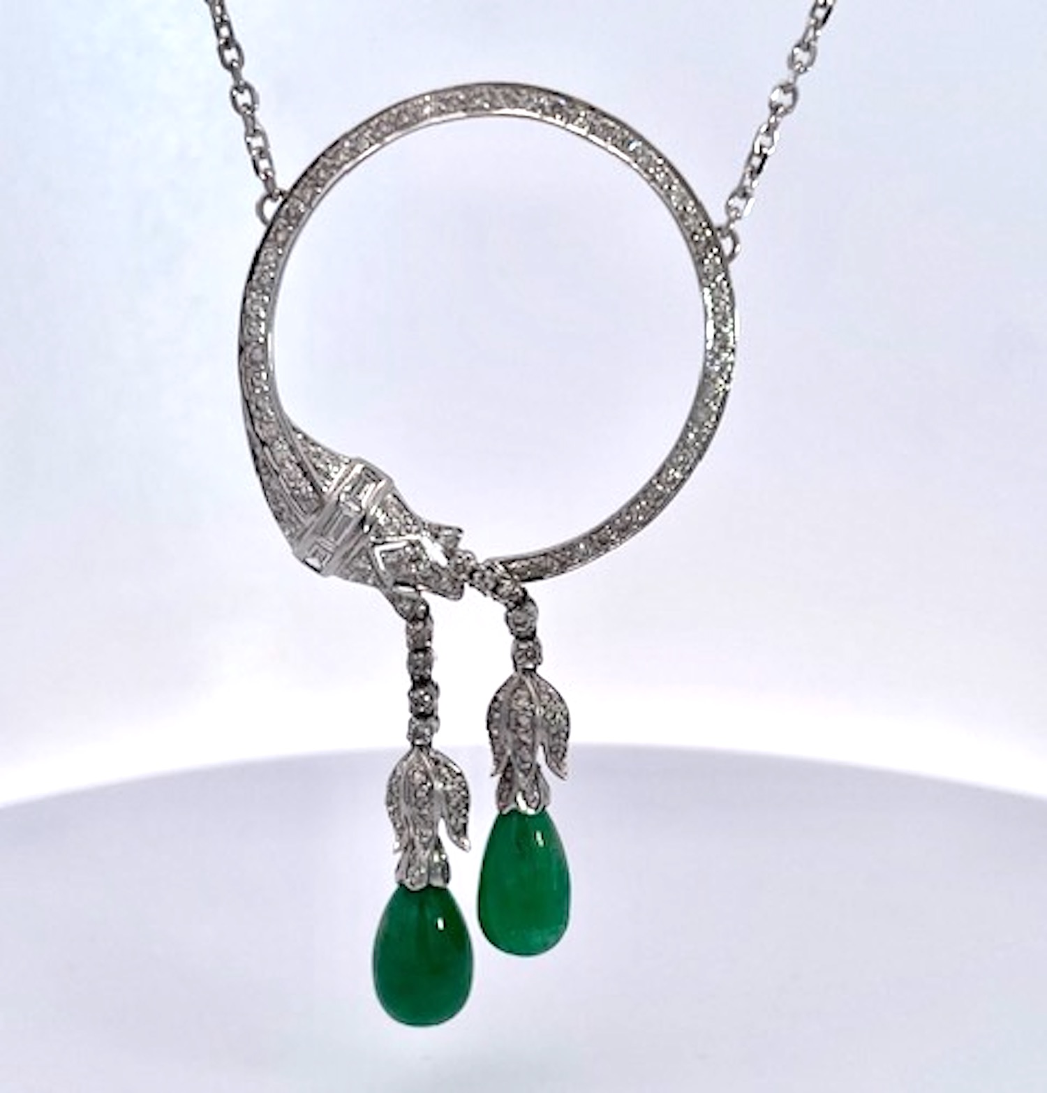18K White Gold Circle Pin Encrusted w/ Diamonds & Emerald Drops