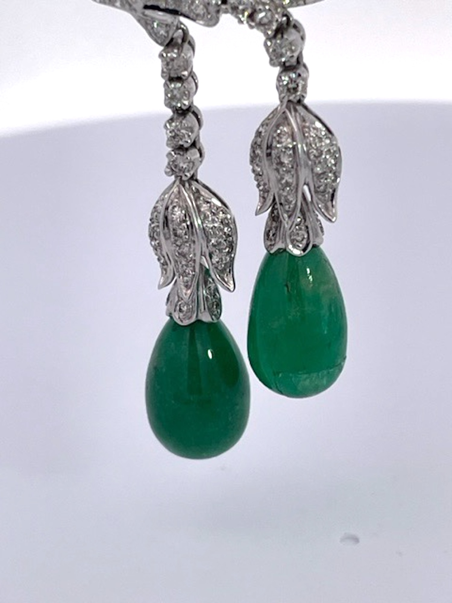 I think this necklace is super special. This started as a pin but I changed it to be a necklace just by adding the chain. This circle is encrusted with pave Diamonds and it has two drops of Emeralds on a tulip head top. Each Emerald is approximately 3 carats each. The Diamond encrusted circle is 4 cm round with 10 small Diamonds. The weight of this piece is 10.42 grams. These Emeralds are a true green and works with the Emerald Chandelier earrings just posted. I love Emeralds but they are fussy because finding matching pieces is difficult if they are not matched at the time of purchase. This piece is unique and special as you will never find another like it.
