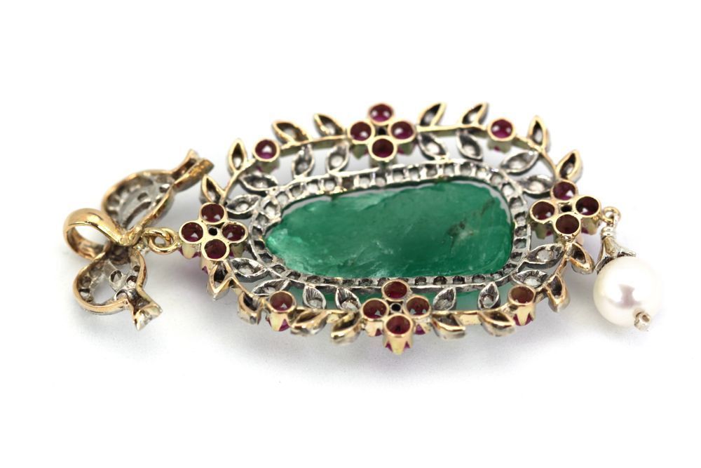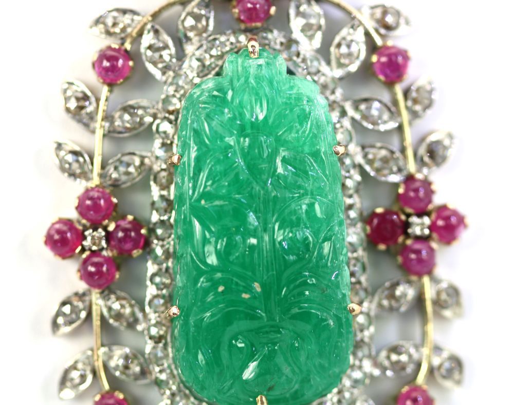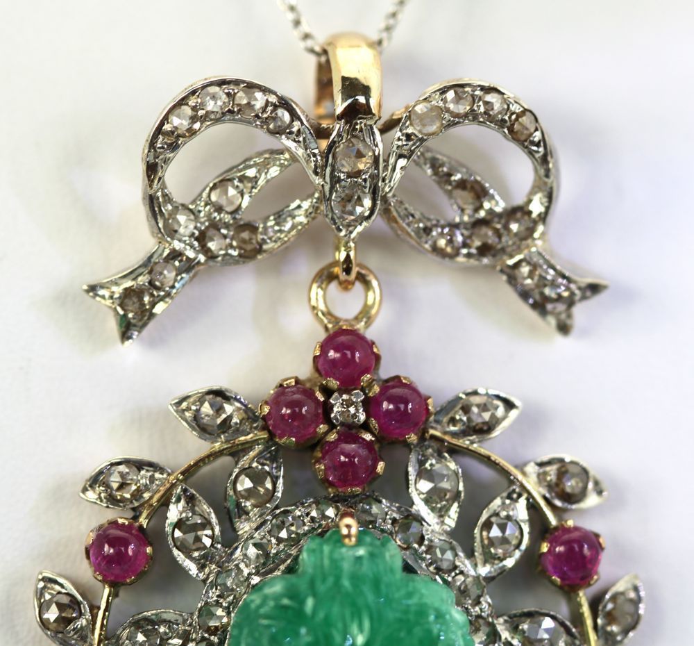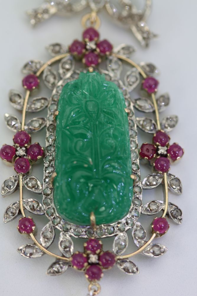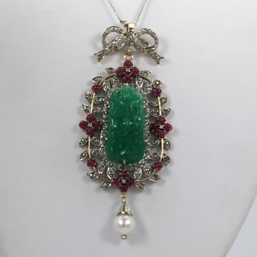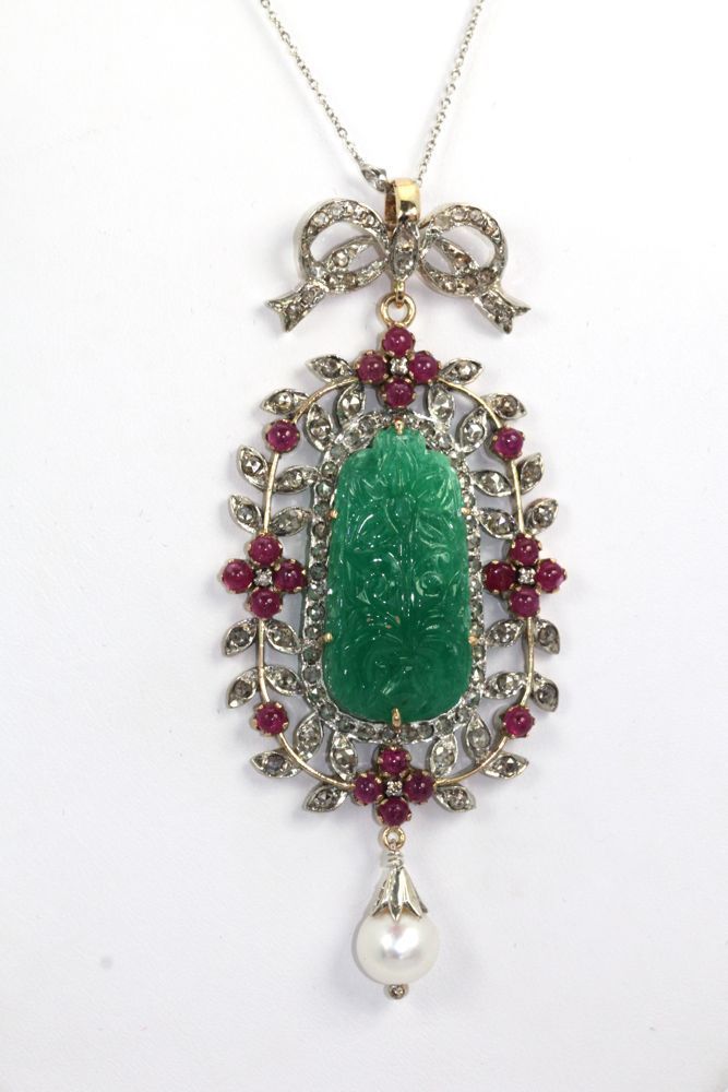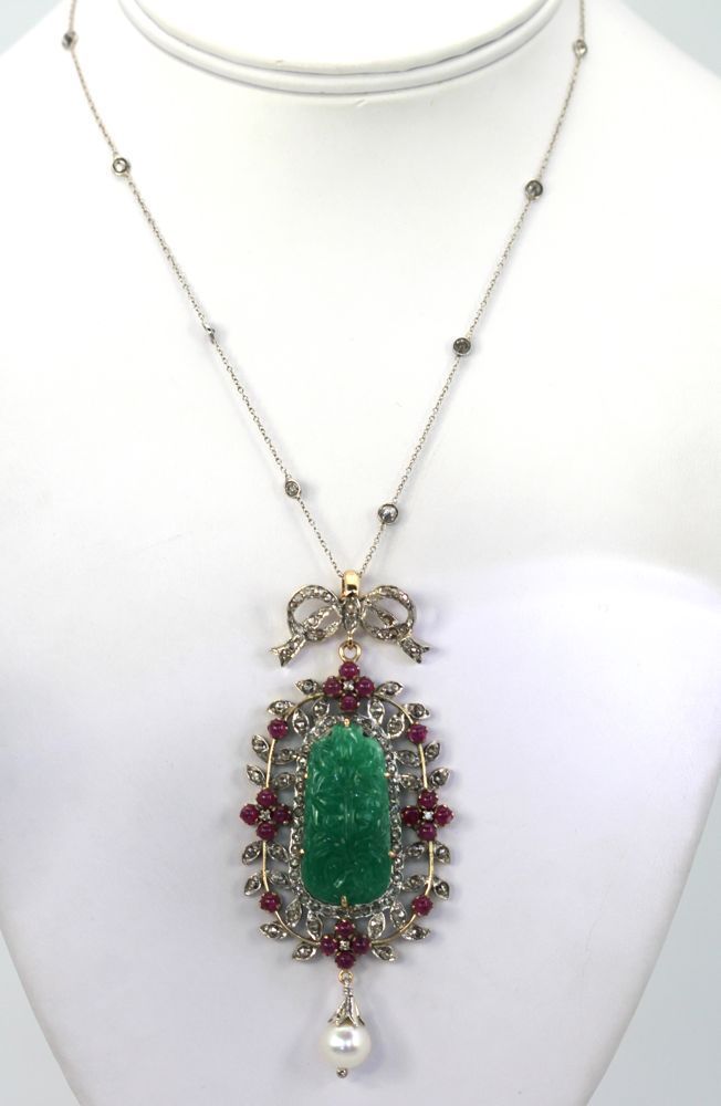This Antique Carved Chrysoprase Pendant is an amazing antique piece was made sometime between 1880 and 1920. It is both 18k gold and platinum. The center This Antique Carved Chrysoprase Pendant was made around 1900 (1880-1920) and is both 18K yellow Gold and Platinum. The center plaque is Chrysoprase commonly used during this period and is often mistaken for Jade or Emerald so beware when purchasing a carved plaque. This piece is spectacular as the carved Chrysoprase is large and with excellent color and clarity and the carving is tops. I tried to show the brilliance of the color and carving but it is hard to photograph. The center plaque measures 1 /14″ x 1/2″ alone. The pendant itself is 3 1/2″ x 1 1/4″ so you can see how special this piece is. The piece is set with twenty 20 Cabochon Rubies with an estimated weight of 2.51 Carats and one hundred 100 Rose Cut Diamonds with an estimated weight of 2.70 Carats. Last but not least the finishing touch a Pearl 8.80 mm with a luster grade of very good and a surface grade of very good. All in all a wonderful dramatic piece and very valuable, see appraisal document.