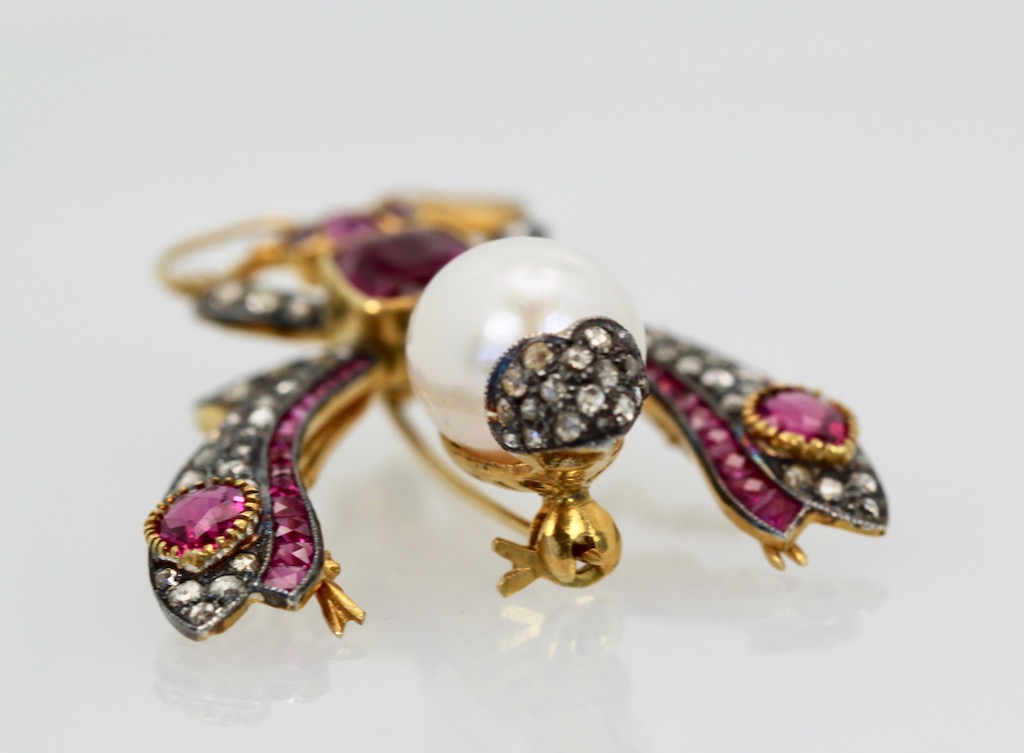 Antique Ruby Pearl Diamond Insect Brooch Pendant 18k