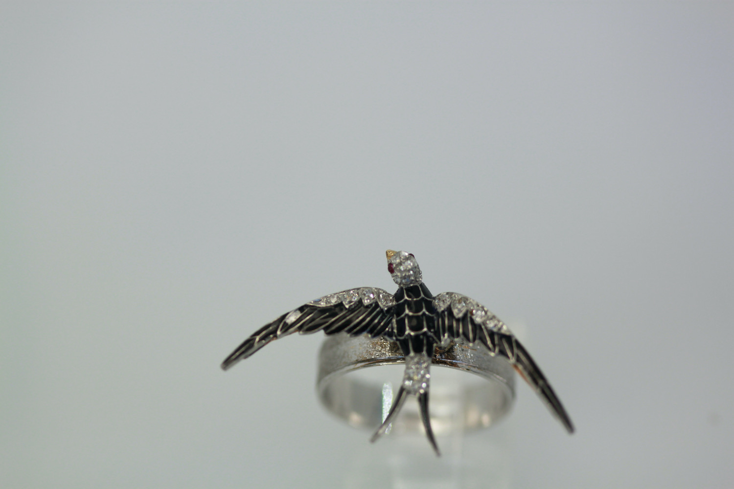 This antique Diamond Enamel Swallow started life as a brooch, which I converted to a ring. This is black enamel on 14K Yellow Gold and set with old mine cut and rose cut Diamonds. Cabochon Ruby set as eyes, no assay marks. This weighs 3.9 grams and is 3.5cm. This ring has sharp points on the wings so be careful but a dynamic ring you will never see again. Small enamel loss at one section, does not distract from the beauty of this piece. Check out this swallow it is detailed and lovely and does make a statement. People will ask you, "where did you get that", as you smile and say it is special like I am special so it was meant for me.