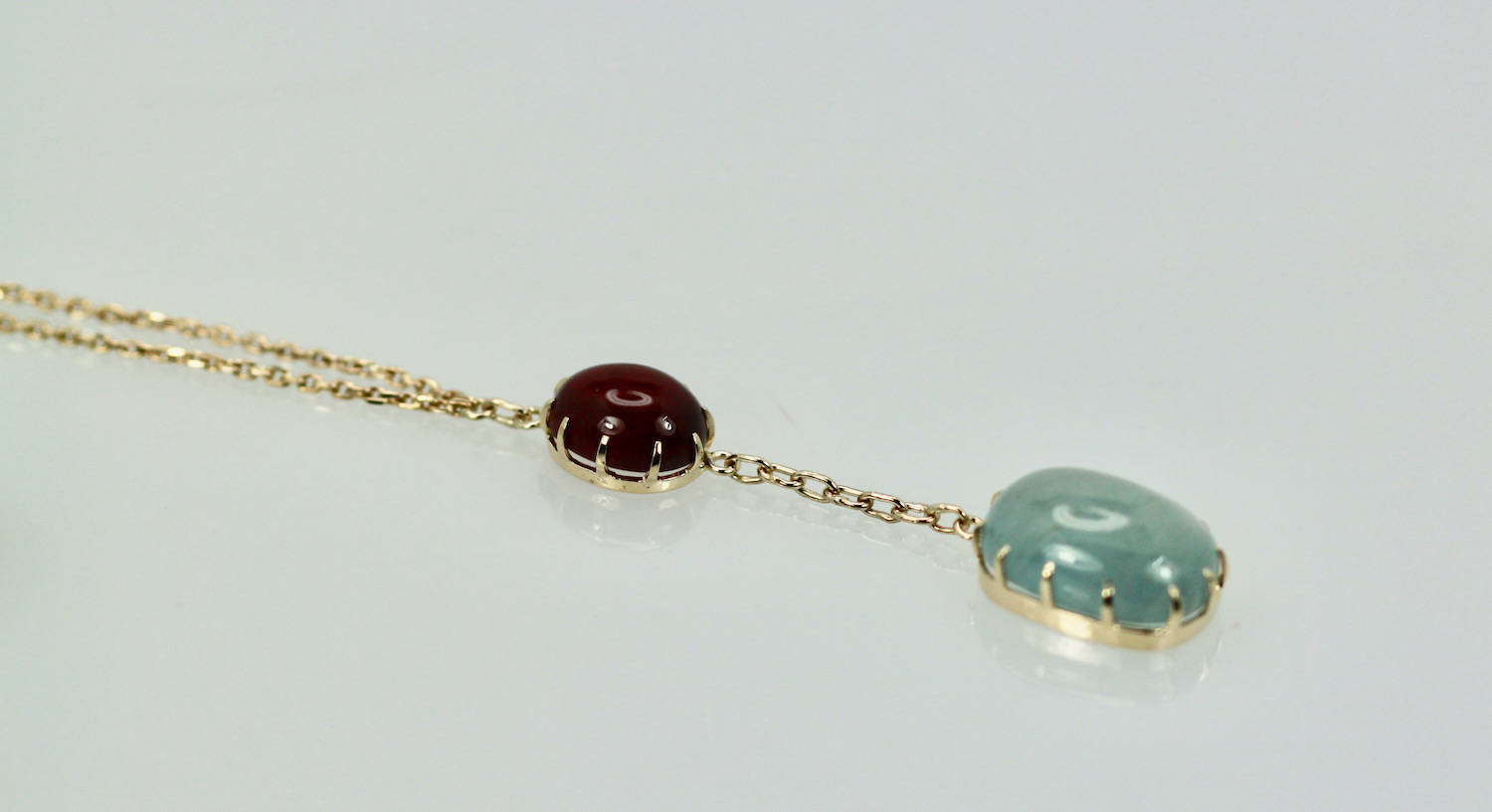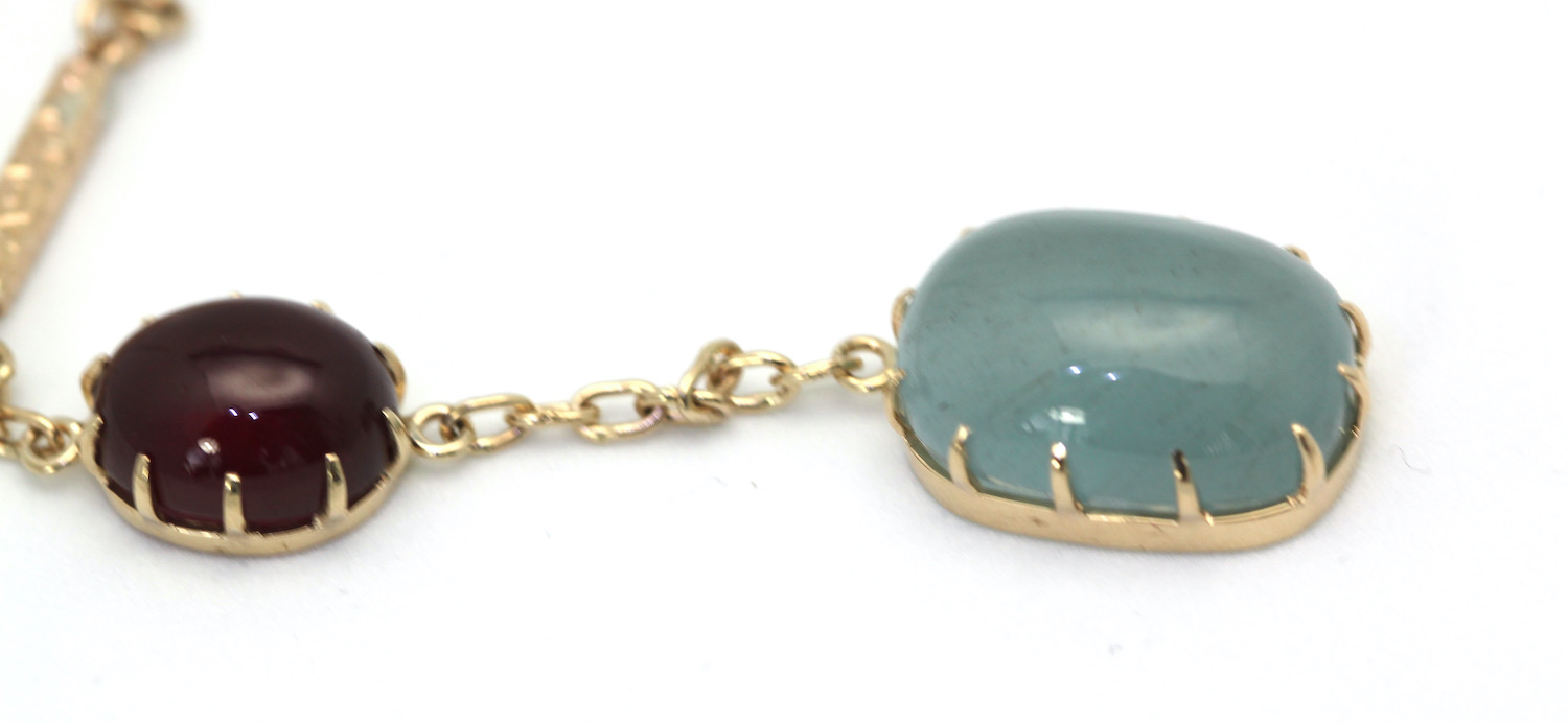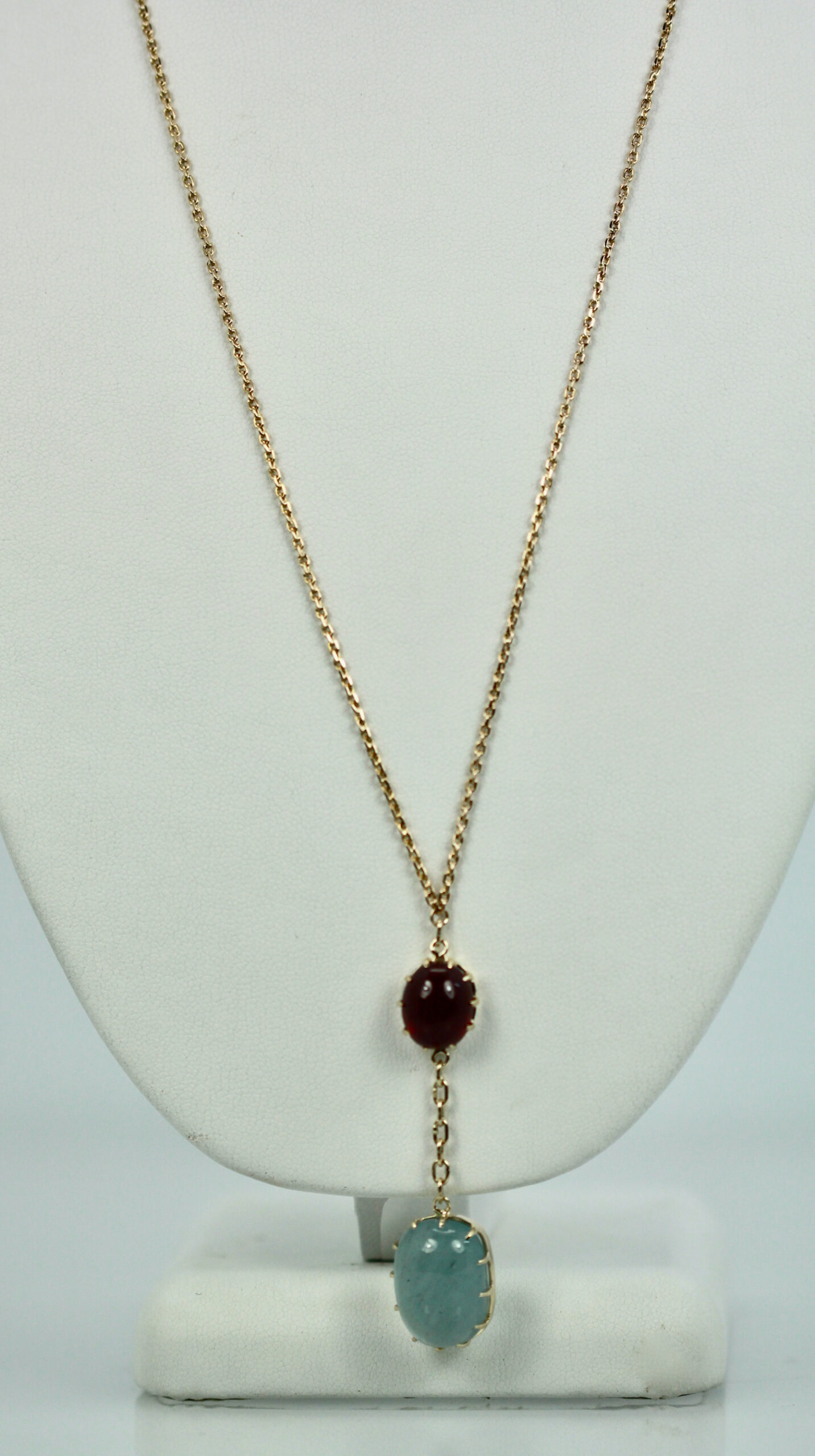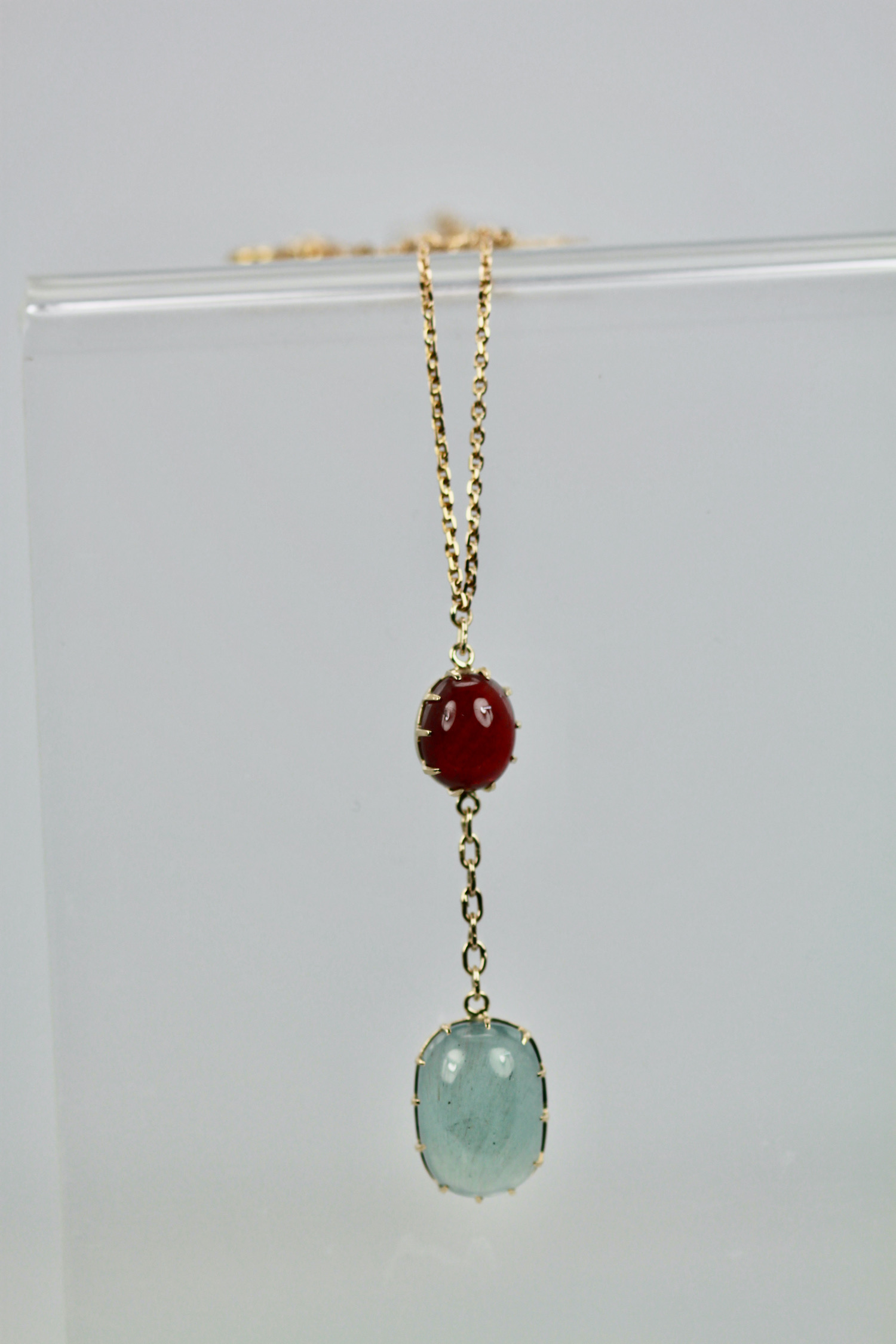 SKU: N/AAquamarine Cabochon Lariat Necklace 15.40 TCW Gold Chain w/Ruby Cabochon 14K Handmade.