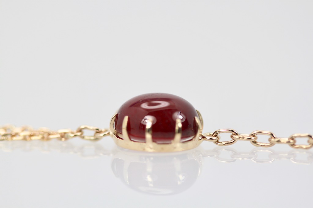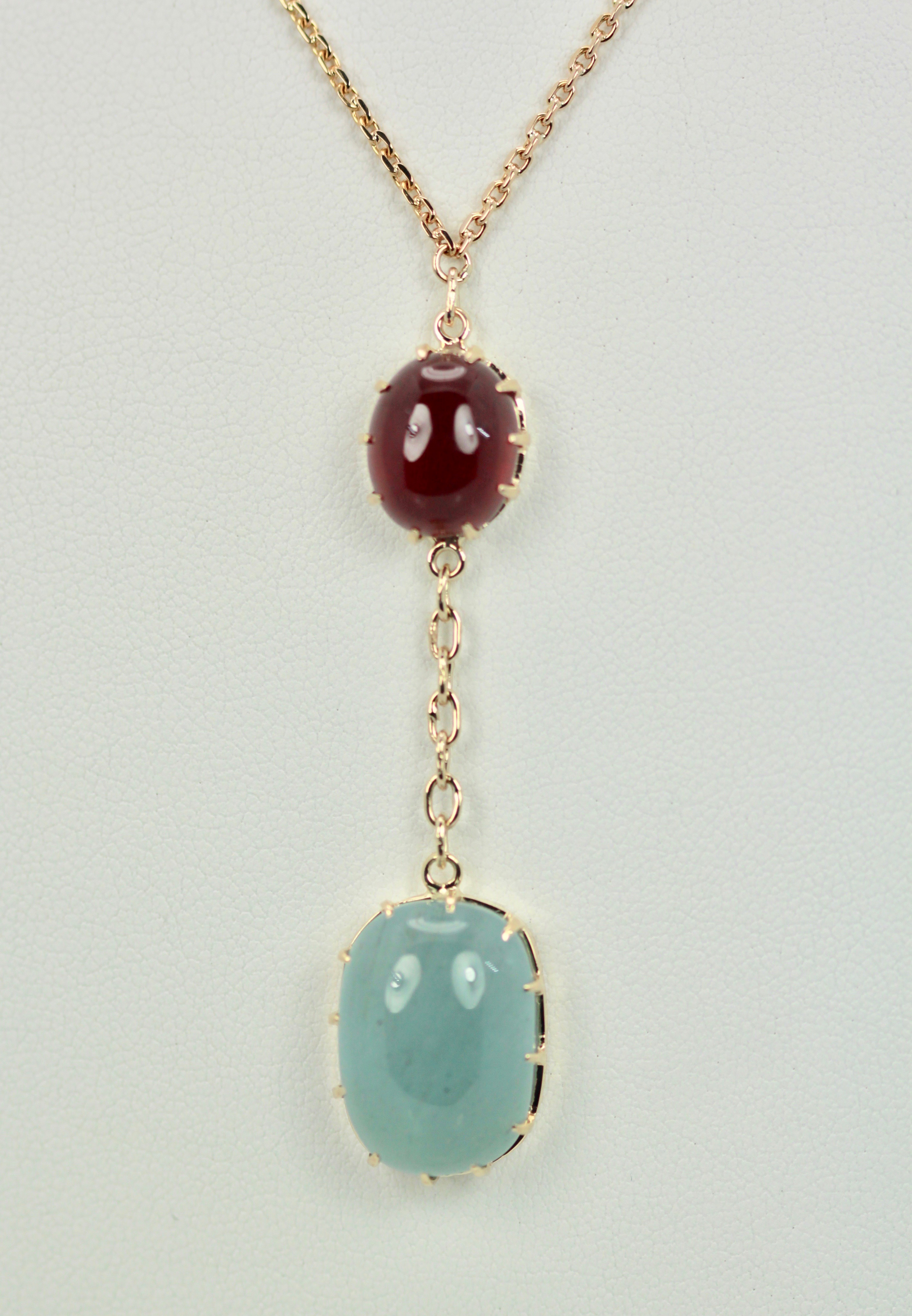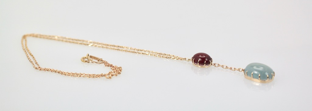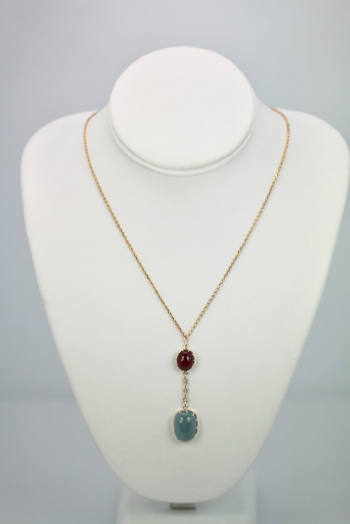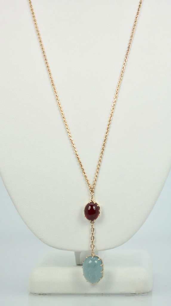 Aquamarine & Ruby Cabochon Necklace. This necklace is made from an antique watch chain and features a two stone drop. One stone is an aquamarine cabochon with a color grade of grayish blue and a weight of 9.29 carats. The second stone is a ruby cabochon with a color grade of bright red and a carat weight of 6.11.
