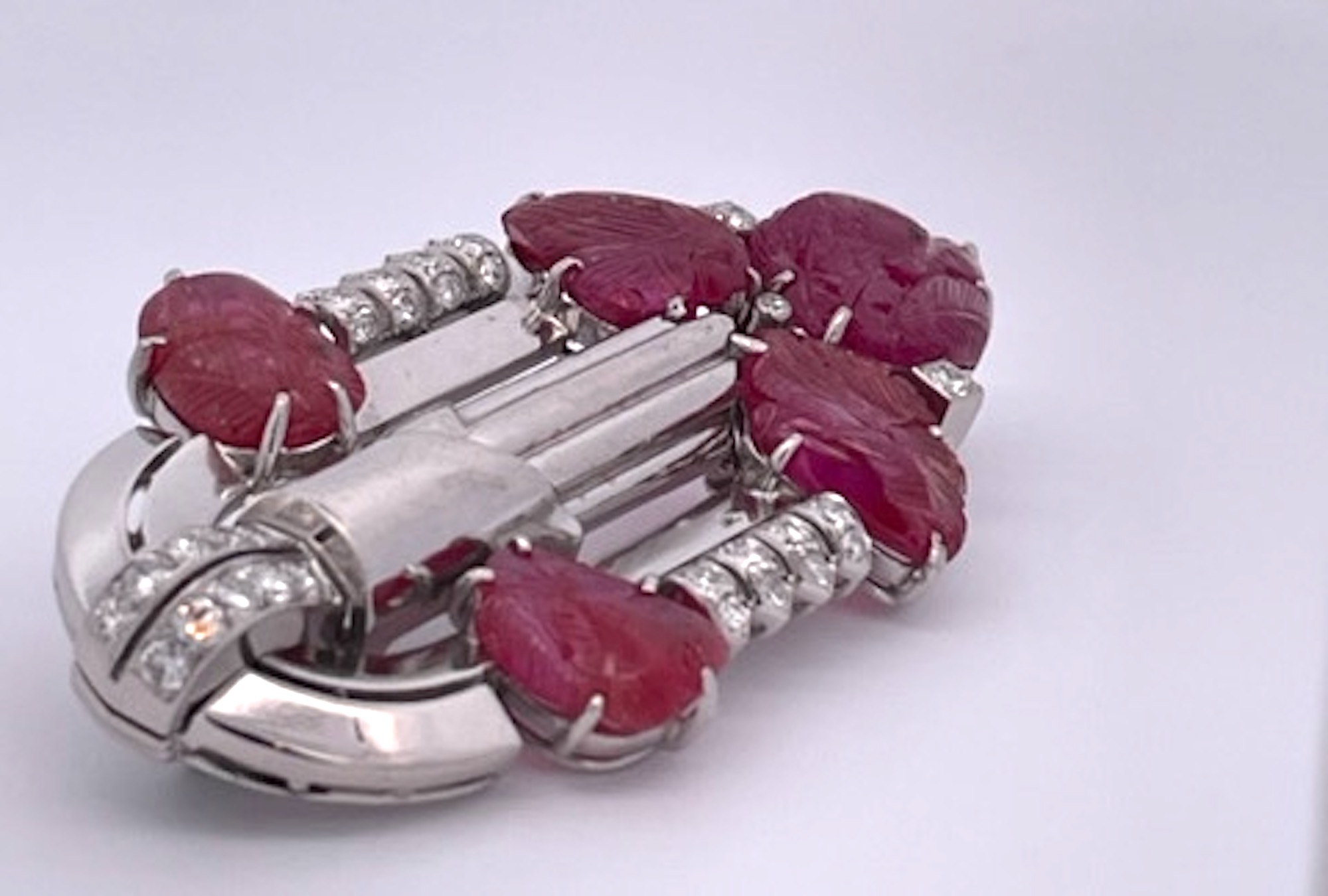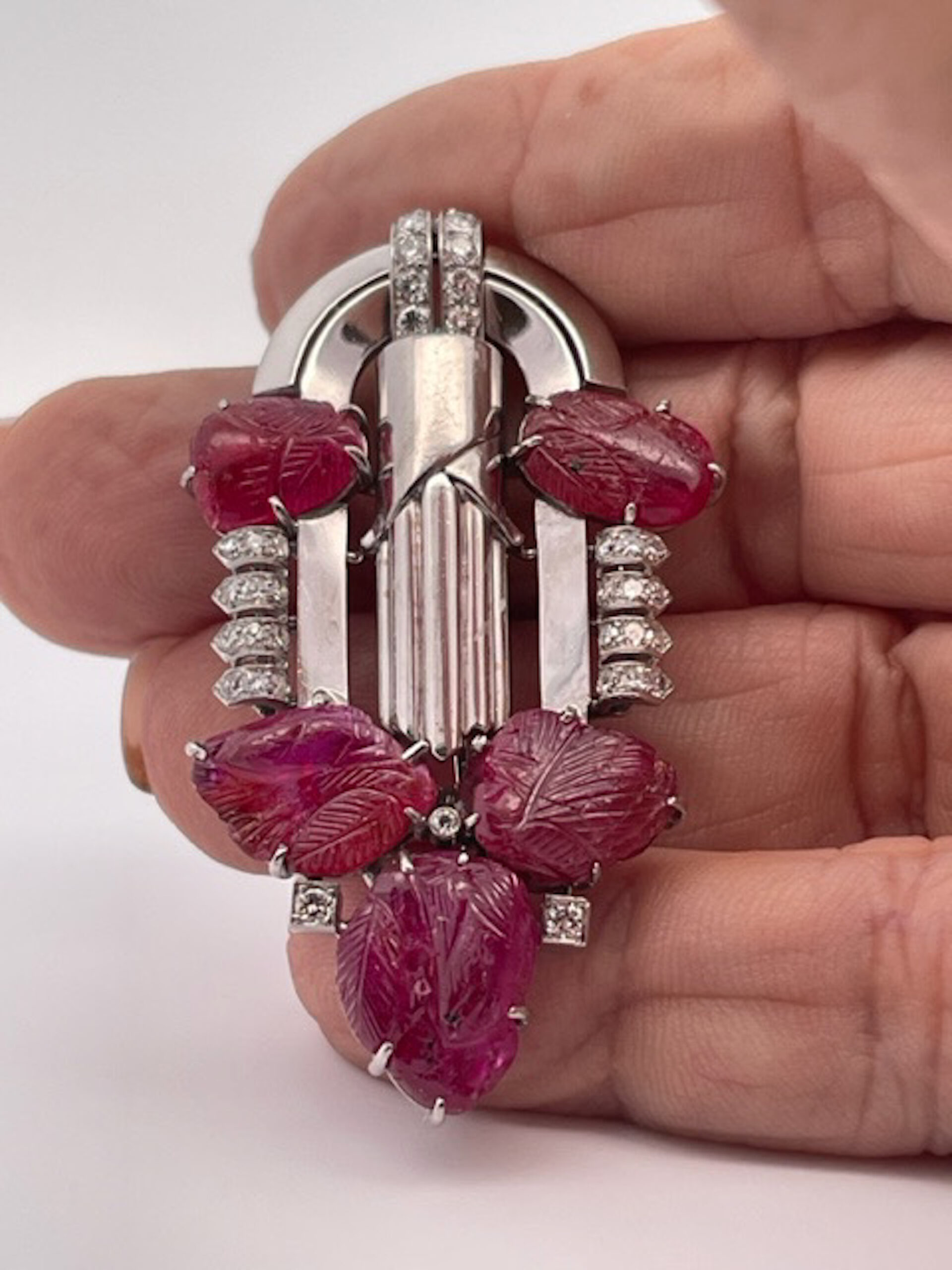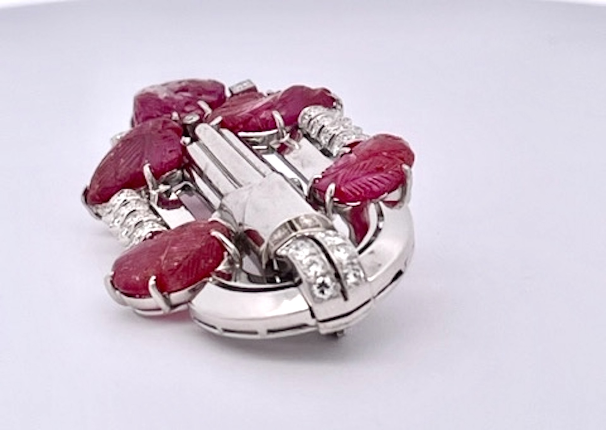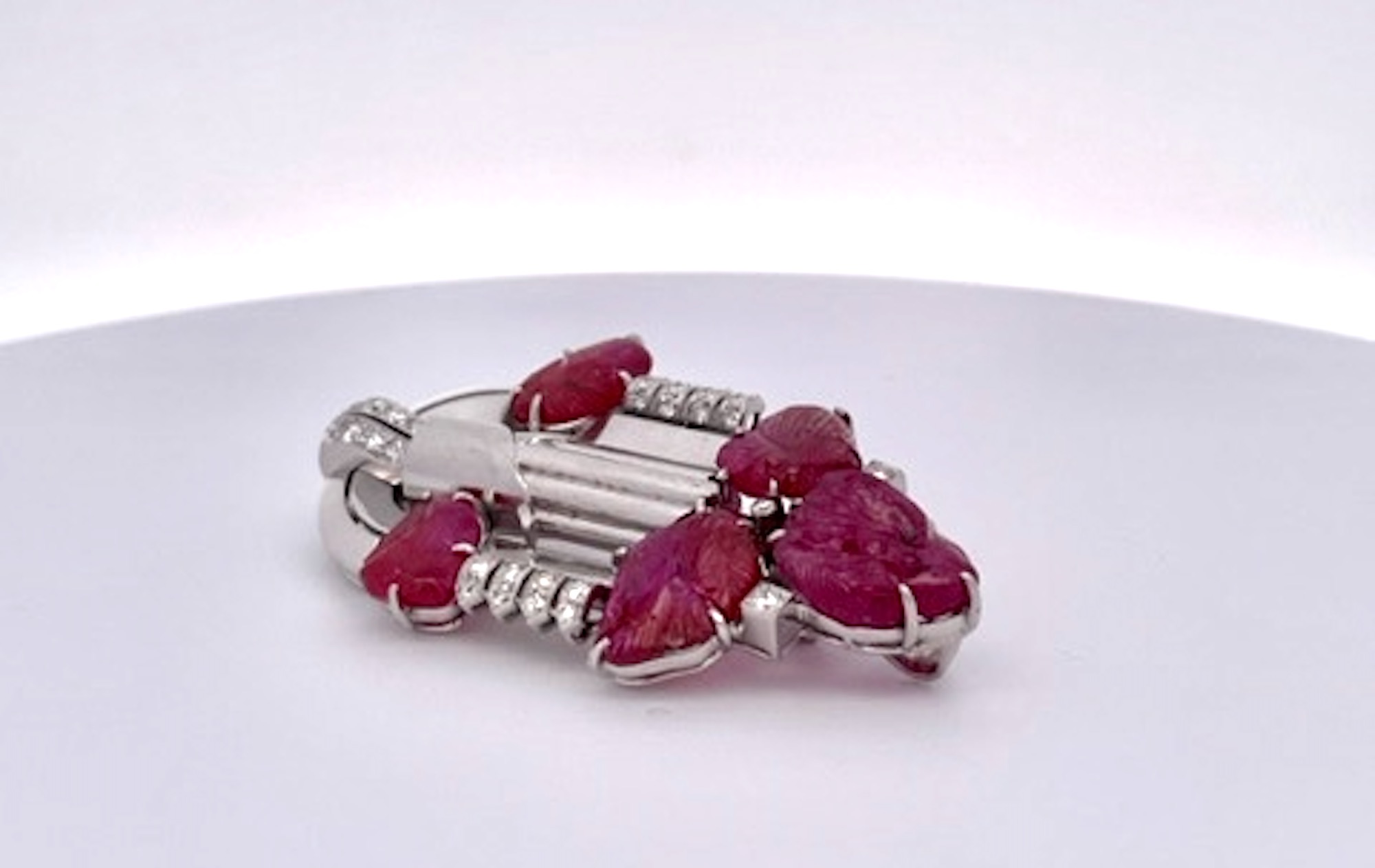 This gorgeous Art Deco brooch is circa 1930 and is set with approximately 20 carats of carved rubies in gold and Platinum. The approximately 1.25 carats of diamonds (G-H color, VS-SI clarity) are set in platinum. This brooch is large at over 2" long and 1" wide. It would also look stunning as a pendant hanging from a gold chain (we do this with a lot of our brooches and they look fabulous). This brooch is lovely and rare, as most carved gemstones from the Deco period have not survived.