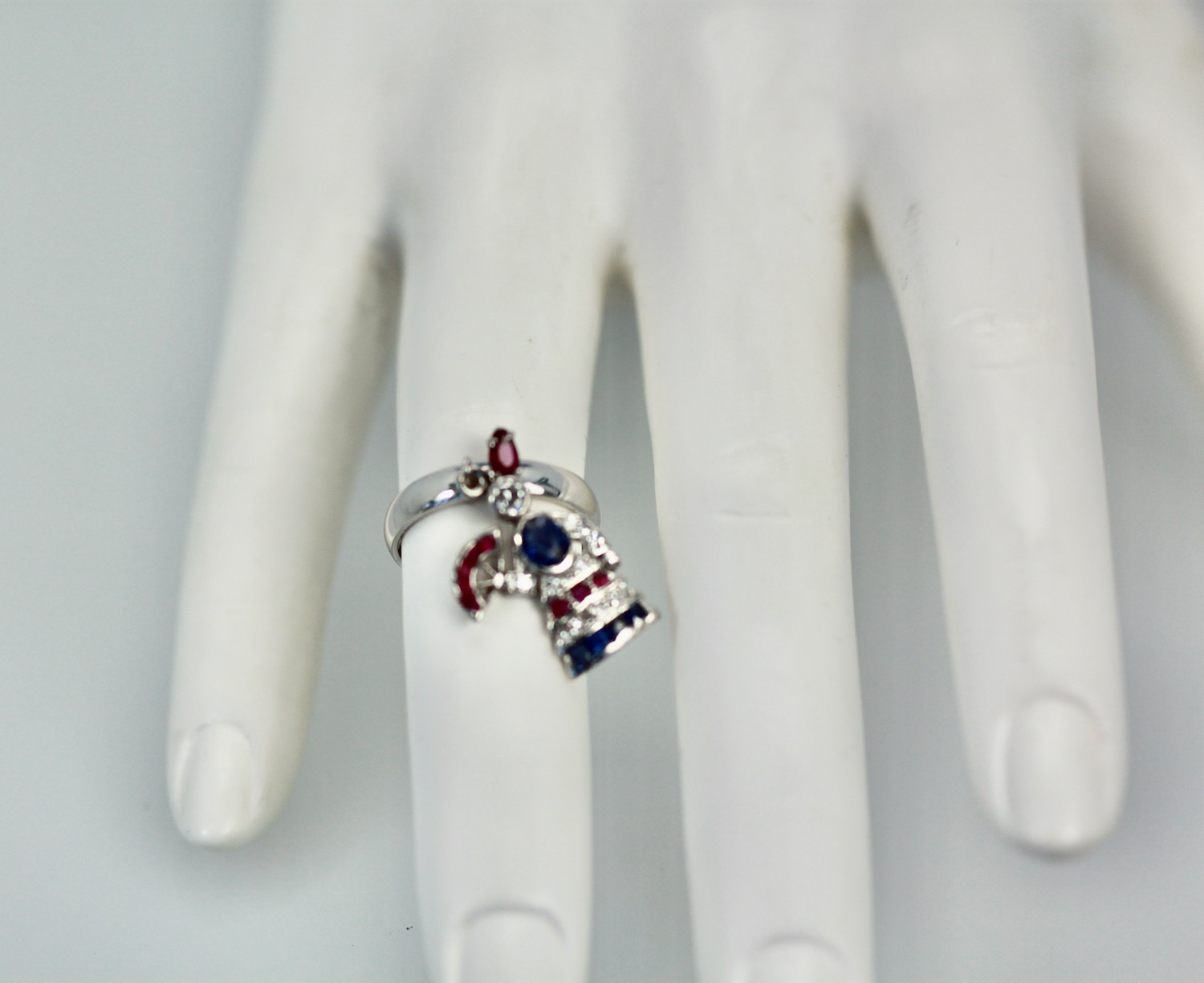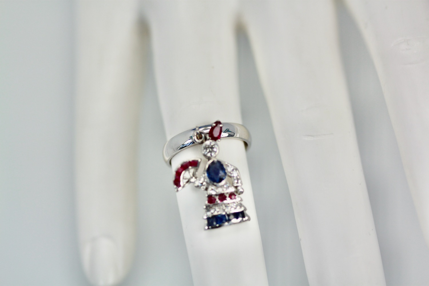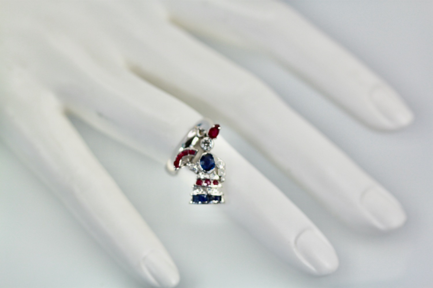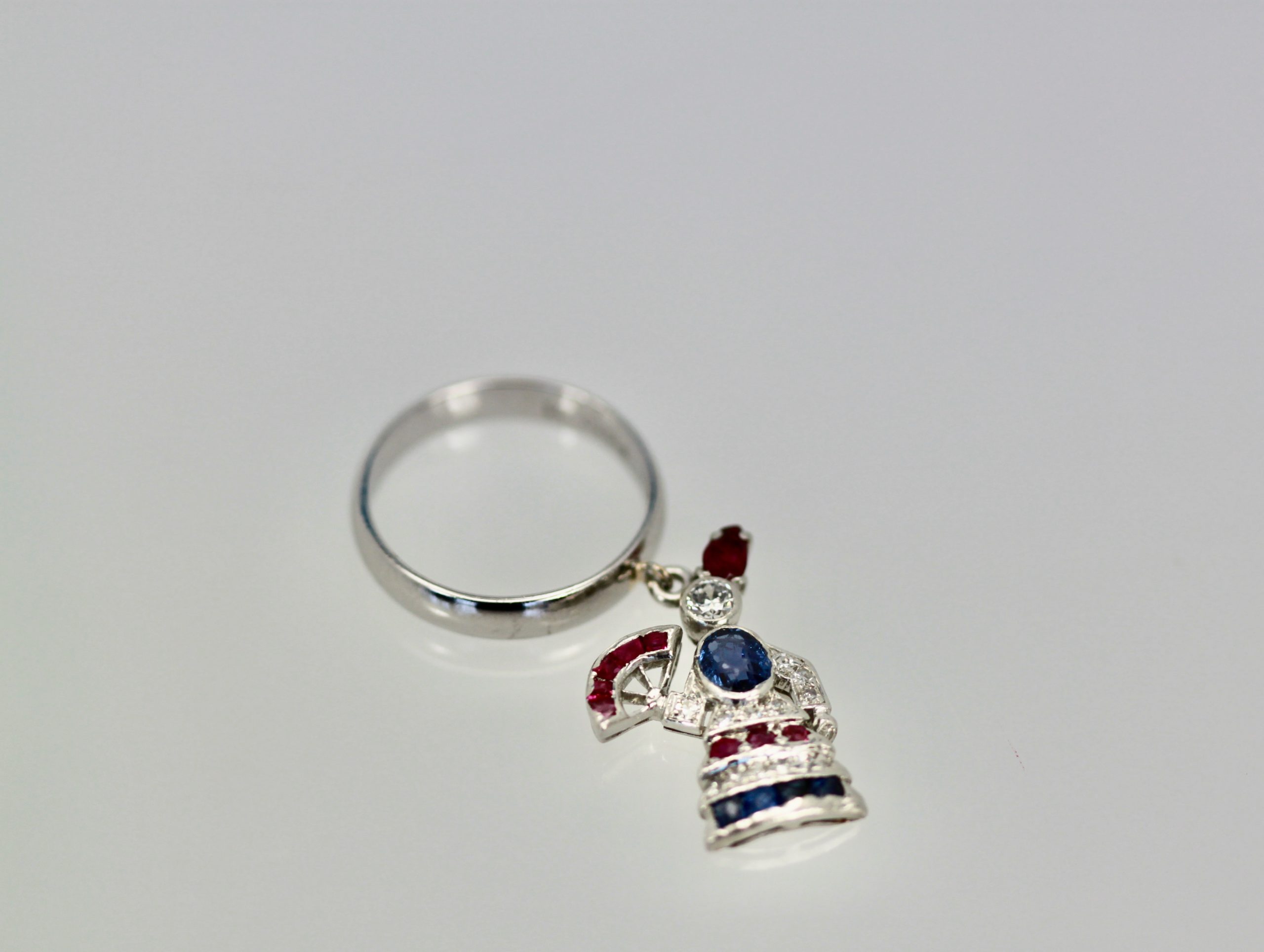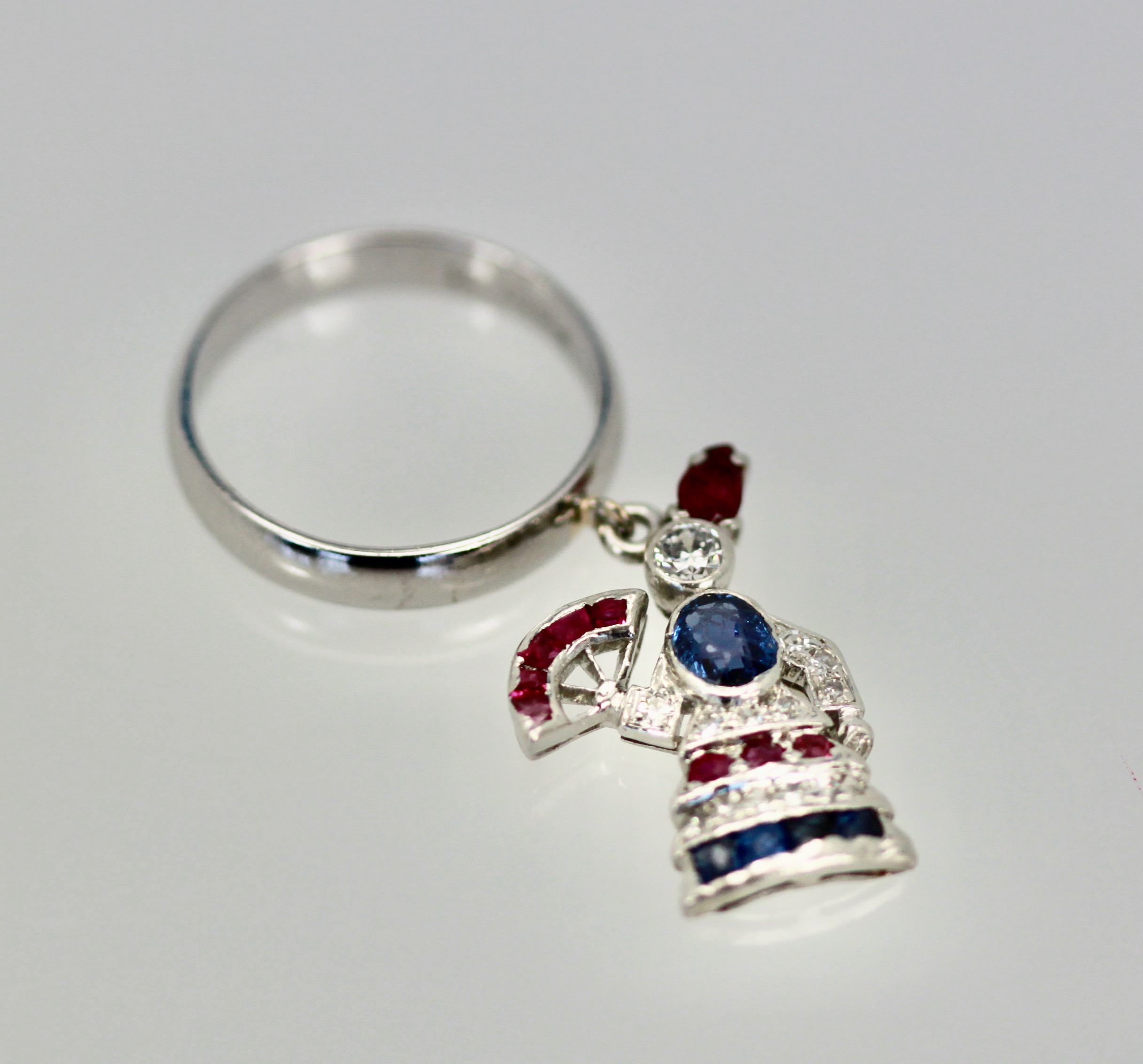 This lovely Art Deco Charm is from the 1920's and it is beautiful. I placed this on a Platinum band which is size 6.25 but it can be sized up or down. This charm is a lady with a fan and headress in a gown that is covered in Diamonds, Rubies, and Sapphires. Unique and special. As you might know I just love Platinum Deco Charms I can not help myself from buying every good piece I find. They are special as you look at these charms and the details are remarkable for such a small piece of jewelry. This charm and the "melon man" always brings a smile to my face as they are just delightful. Do not wait.