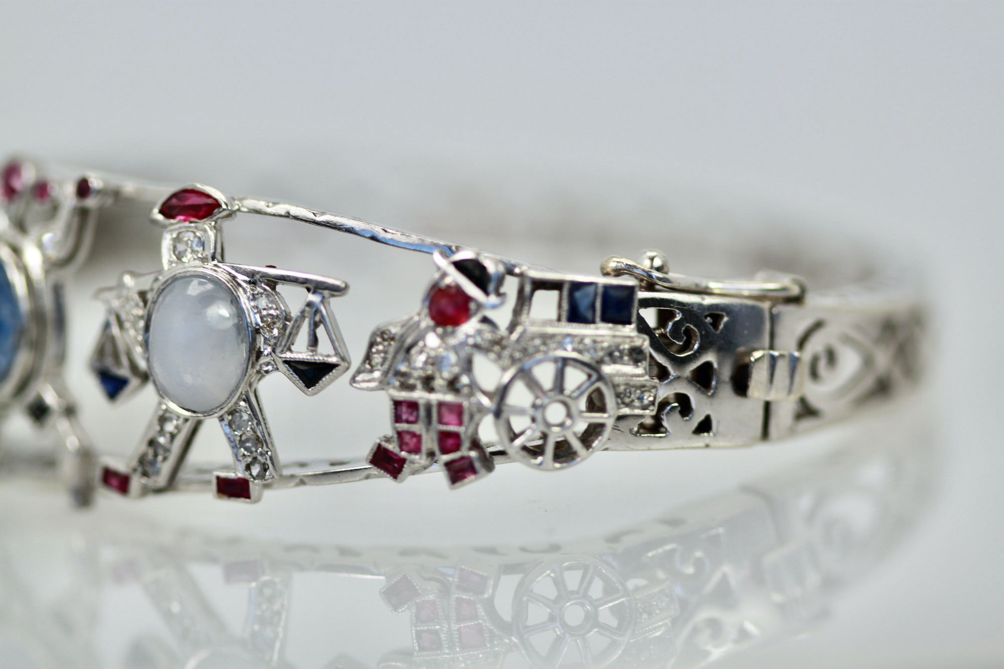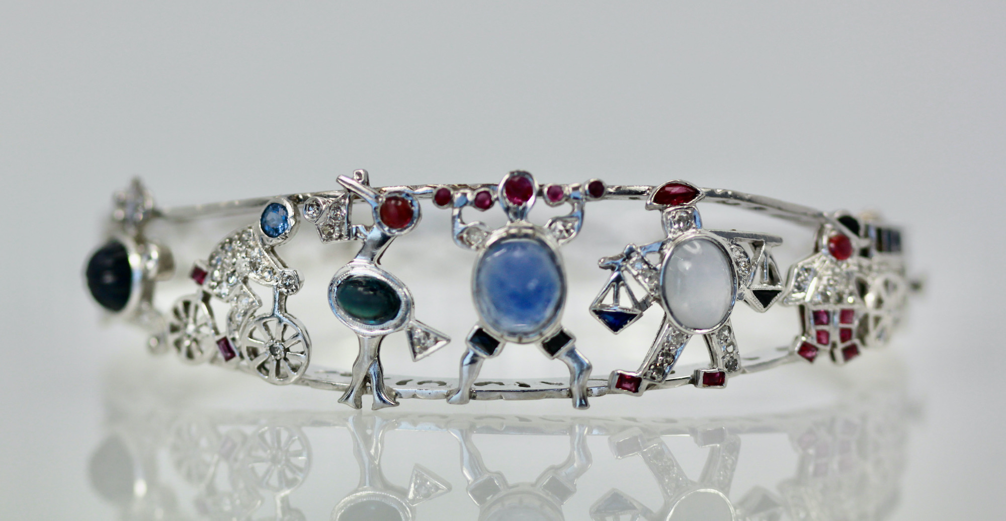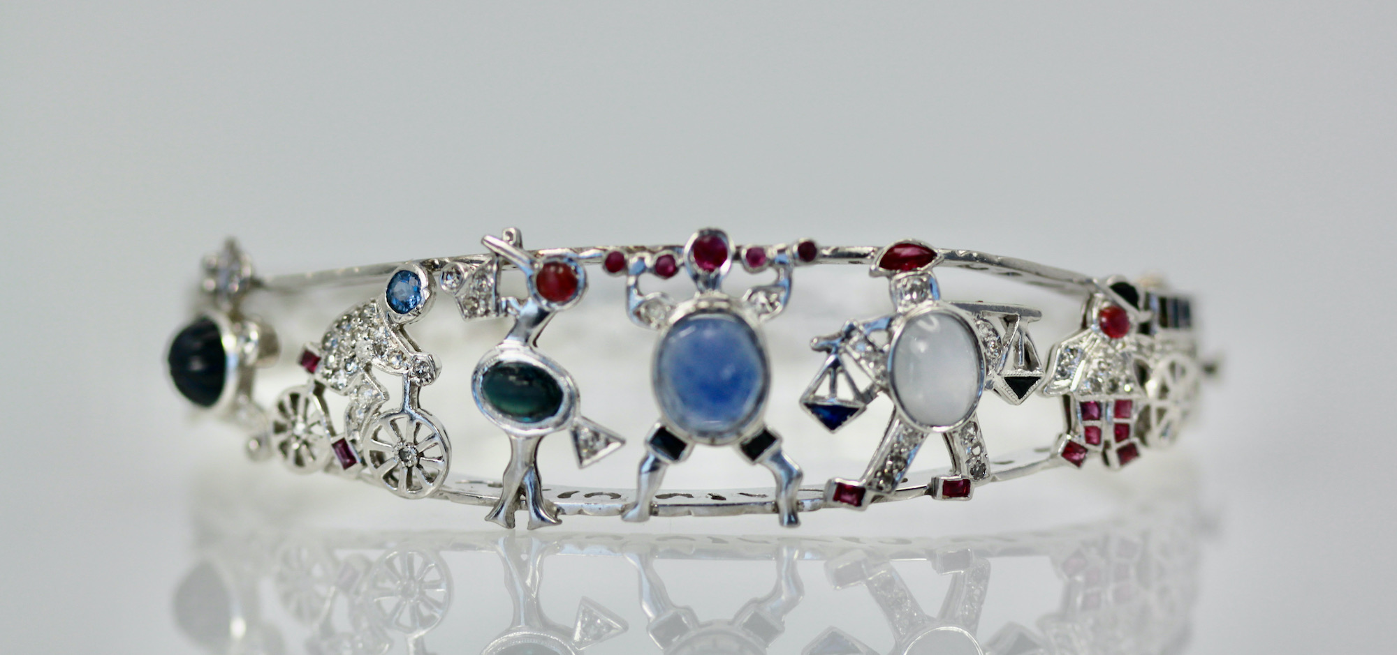 As we all know the Deco period was all about Platinum multi jeweled charms. These were worn on a chain as a charm bracelet. After the 20's and 30's these charms started being put on bracelet where they did not move, as women were entering the workforce and these dangling charms did not work. This art deco bracelet is special as it has 6 unique charms, a Pilguin, a Bike Rider, a Stork, a Man with weights, a Man with Scales, and a Man with cart. These are all on a Platinum open bracelet. The bracelet is large to fit a 7 to 8" wrist but can be cut down, or worn lower on the hand. There are Rubies, Sapphires, Moonstone, Onyx and of course lots of Diamonds. Inner circumference 2 1/4"