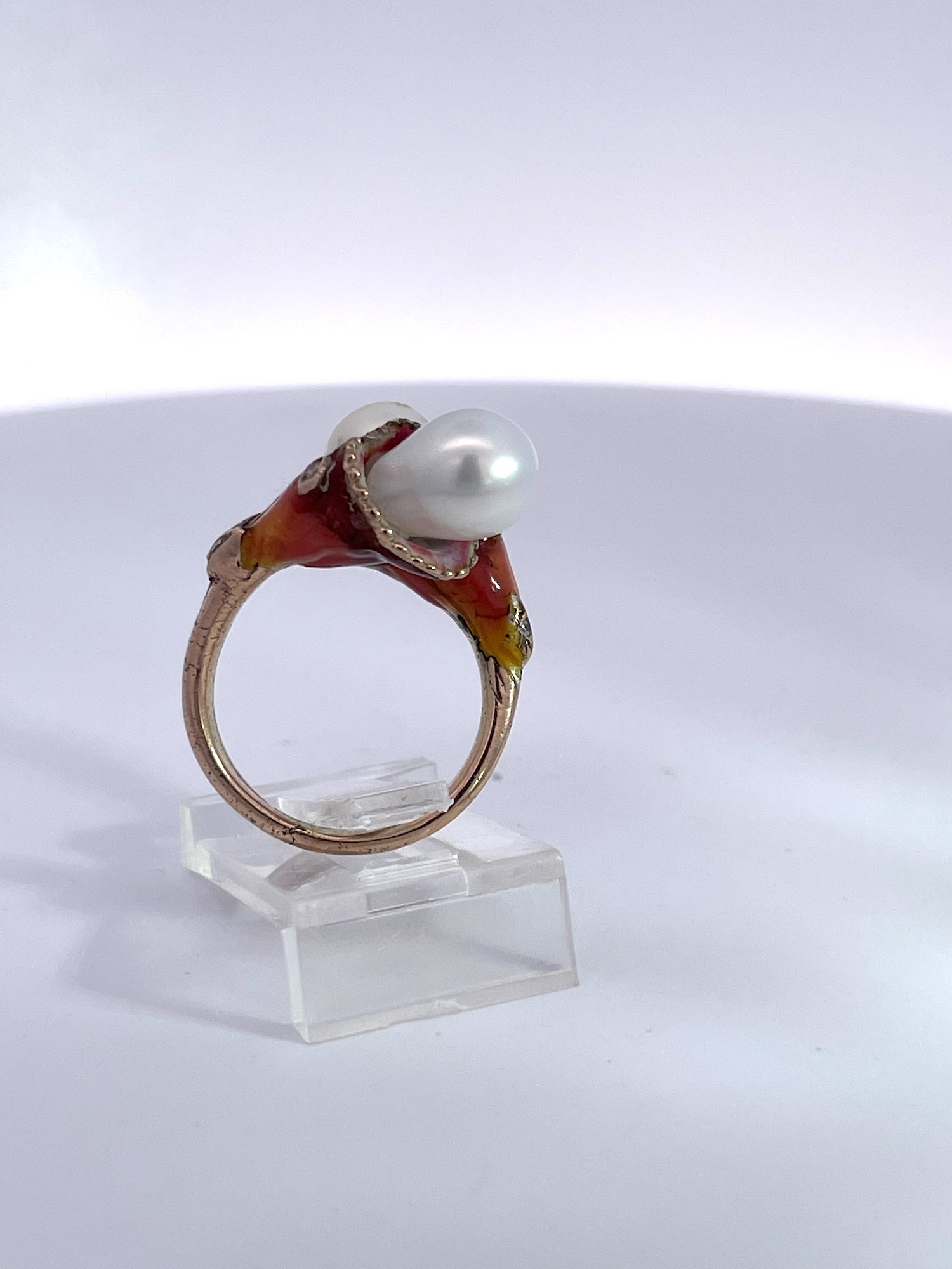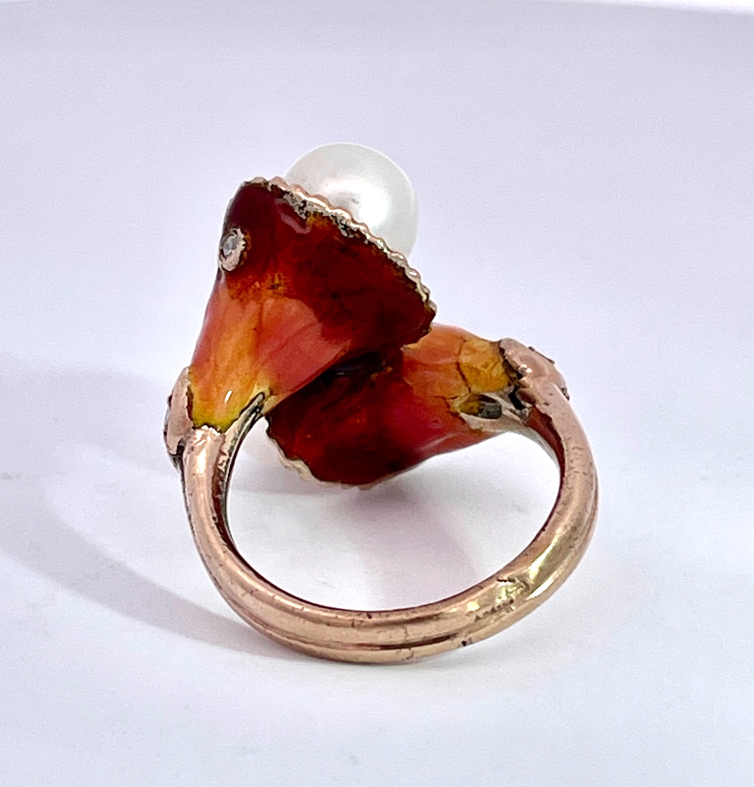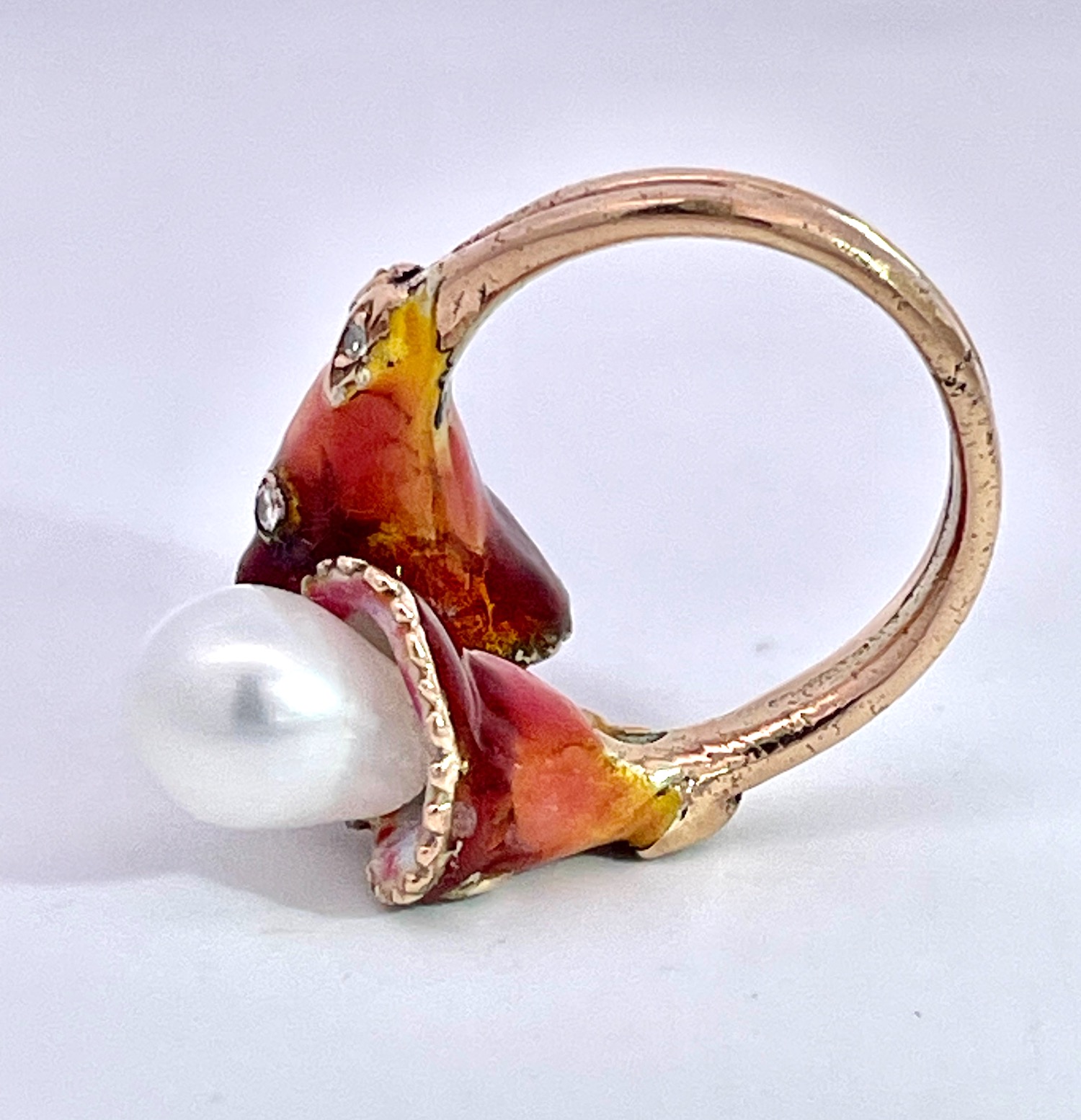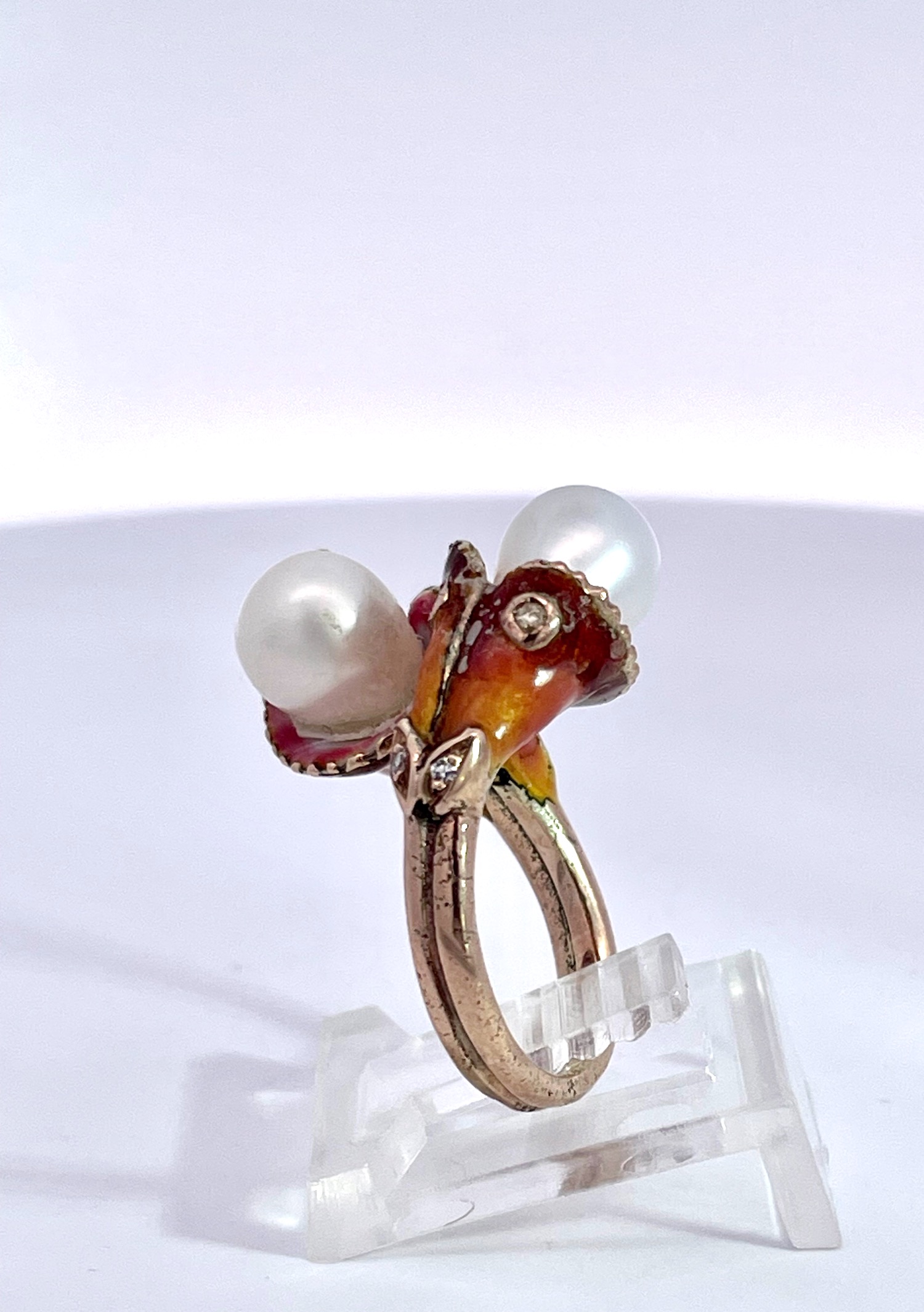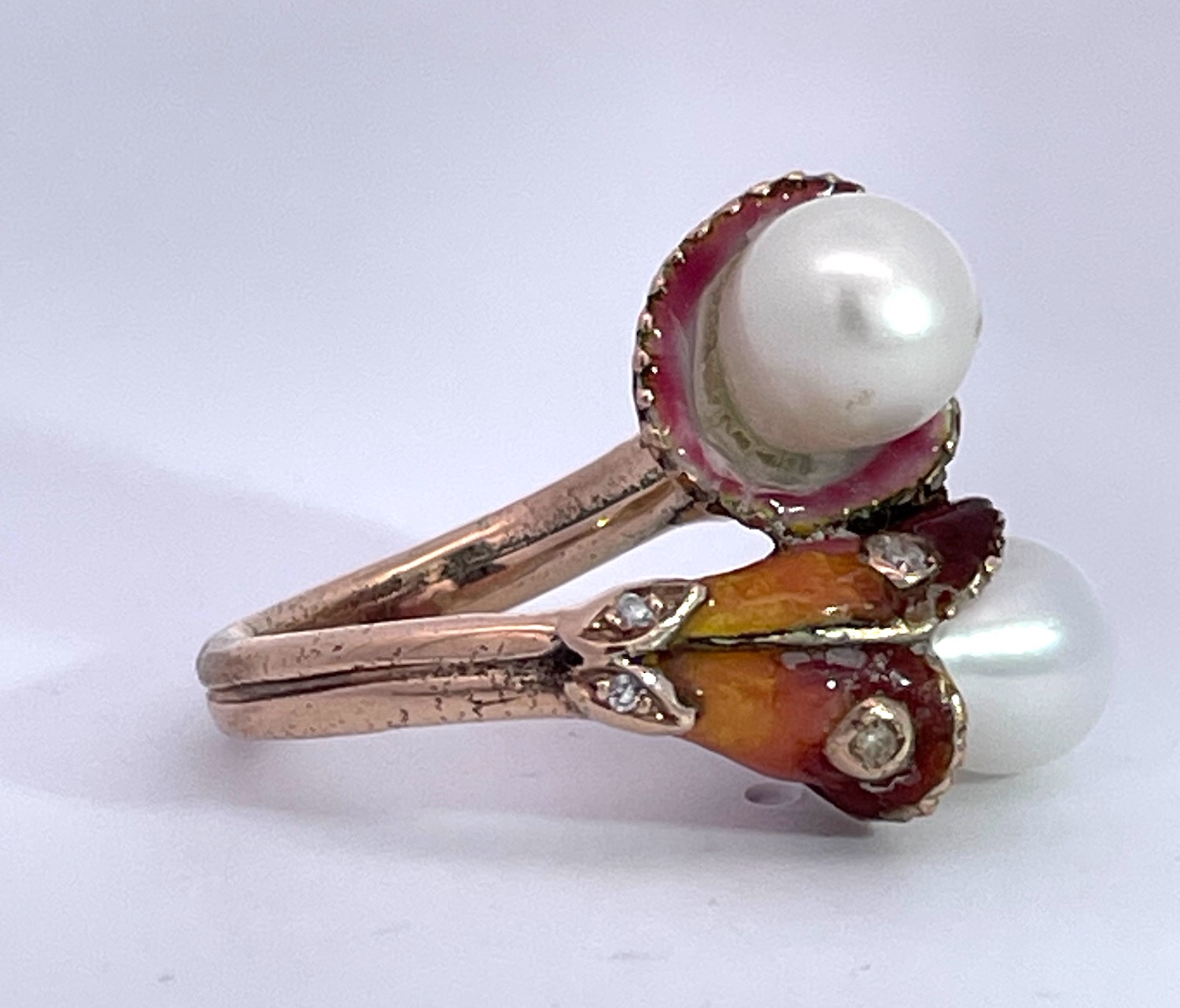 This art nouveau ring is pretty special as it has two beautiful pearls in an enamel tulip setting. The enamel is a deep pink that graduates into an orange and then brown. The enamel is studded with Diamonds. Two Diamonds on each tulip and two small Diamonds on what appears to be butterflies, for a total of 8 diamonds. Each pearl is 7mm wide this ring is sized 4.5 but it can be re-sized. Weight is 8.55 grams. This ring could use a polishing of the gold which is 14K and a bit of clean up of the glue setting of the pearls but it is in very good shape. This ring works well with the other Art Nouveau pieces I have listed.