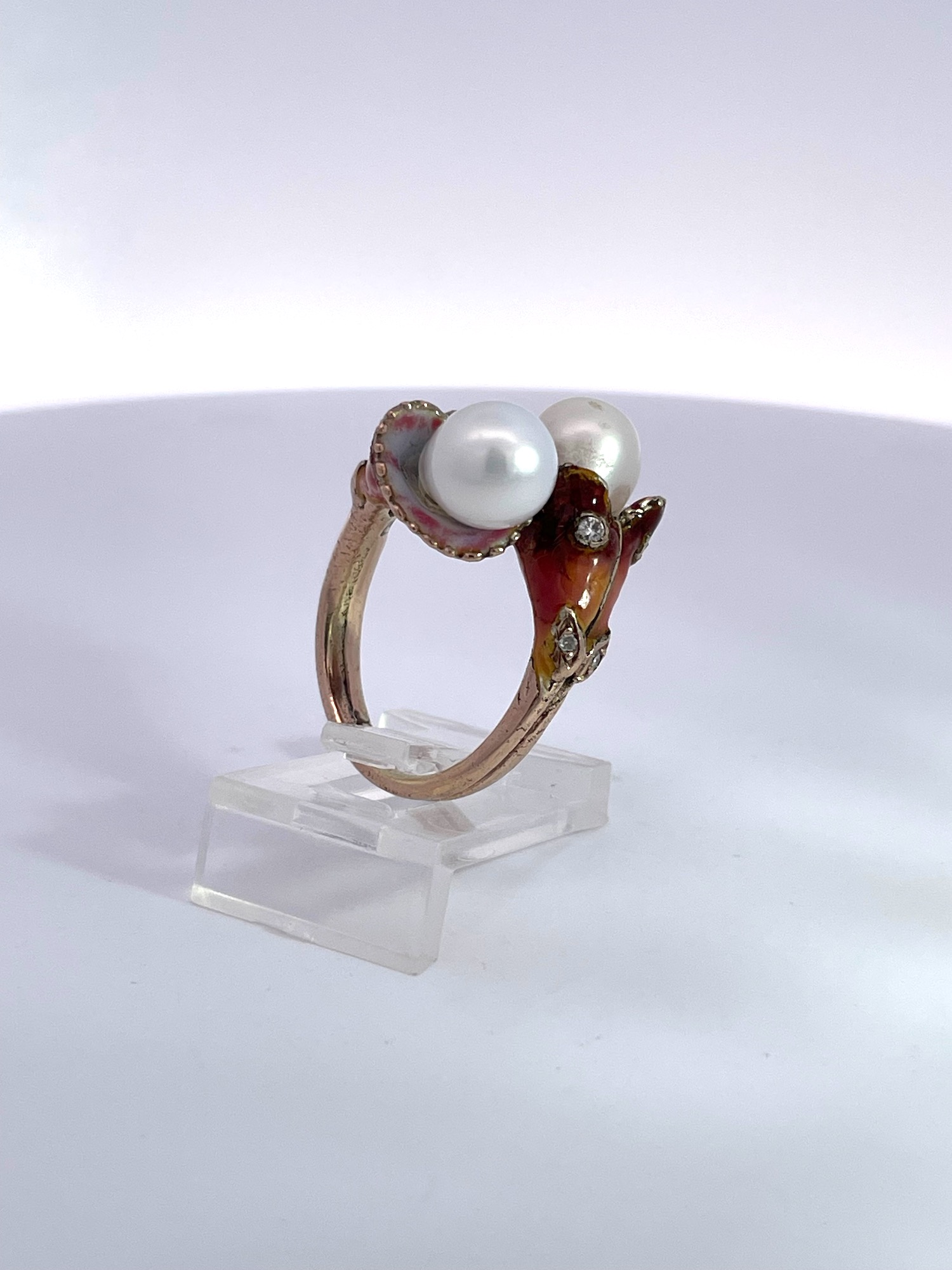 Art Nouveau Double Pearl Diamond and Enamel ring