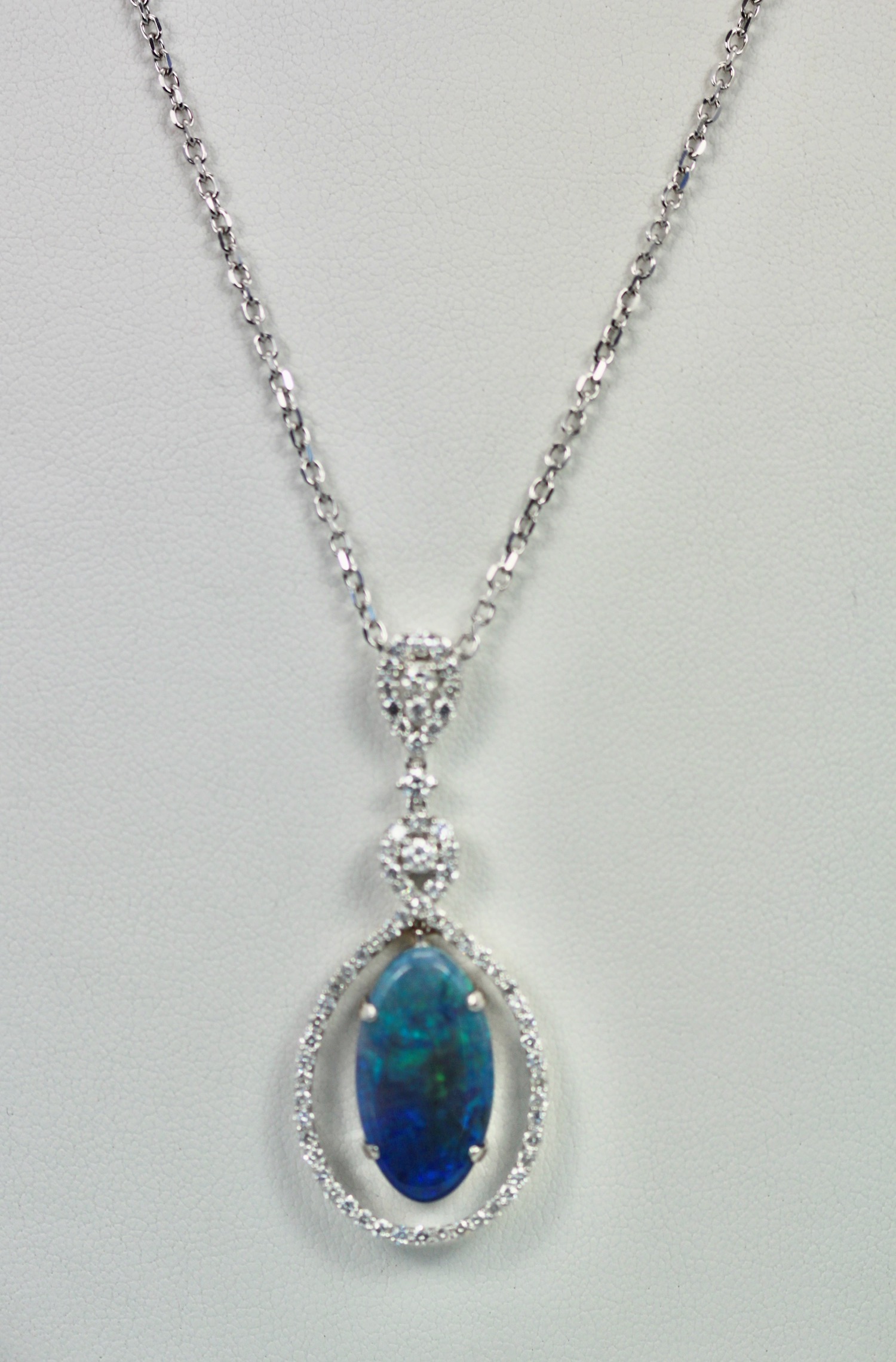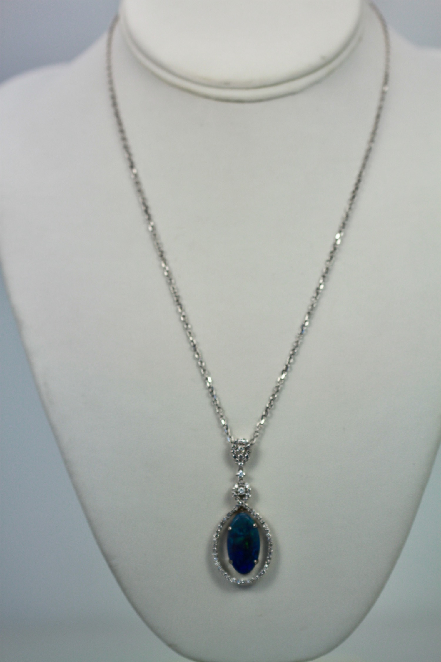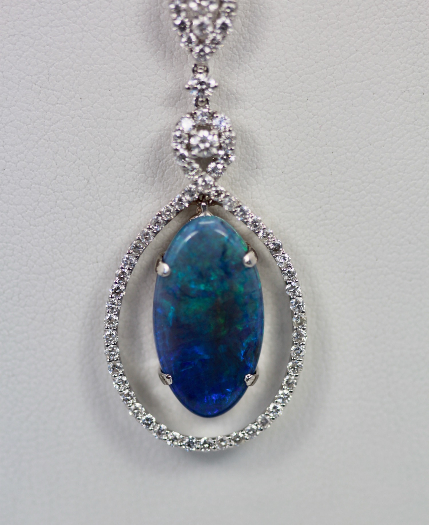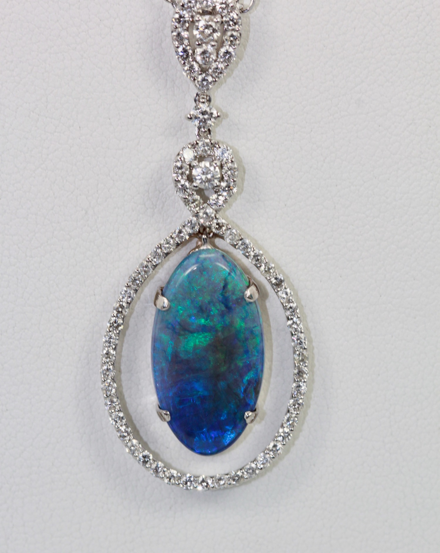 This Black Crystal Opal measures 20.4 x 11.0 x 3.4 and totals 5.23 Carats, the Diamond surround and loop weights in at 1.00 carat. This pendant is 5cm long and 2cm wide. Beautiful colors of blues purple and greens. Comes with a 18″ long chain, pendant is set in 18K. Black Opal is a special stone as the matrix of blues, greens, and some pink are indeed special. This black opal is a crystal Opal a bit different than just a Black Opal. I purchased this stone and made the surround for it with my bench jeweler as I just loved this stone. You will too if you give it a chance, it just might win over your heart. Simple, Elegant, Special.