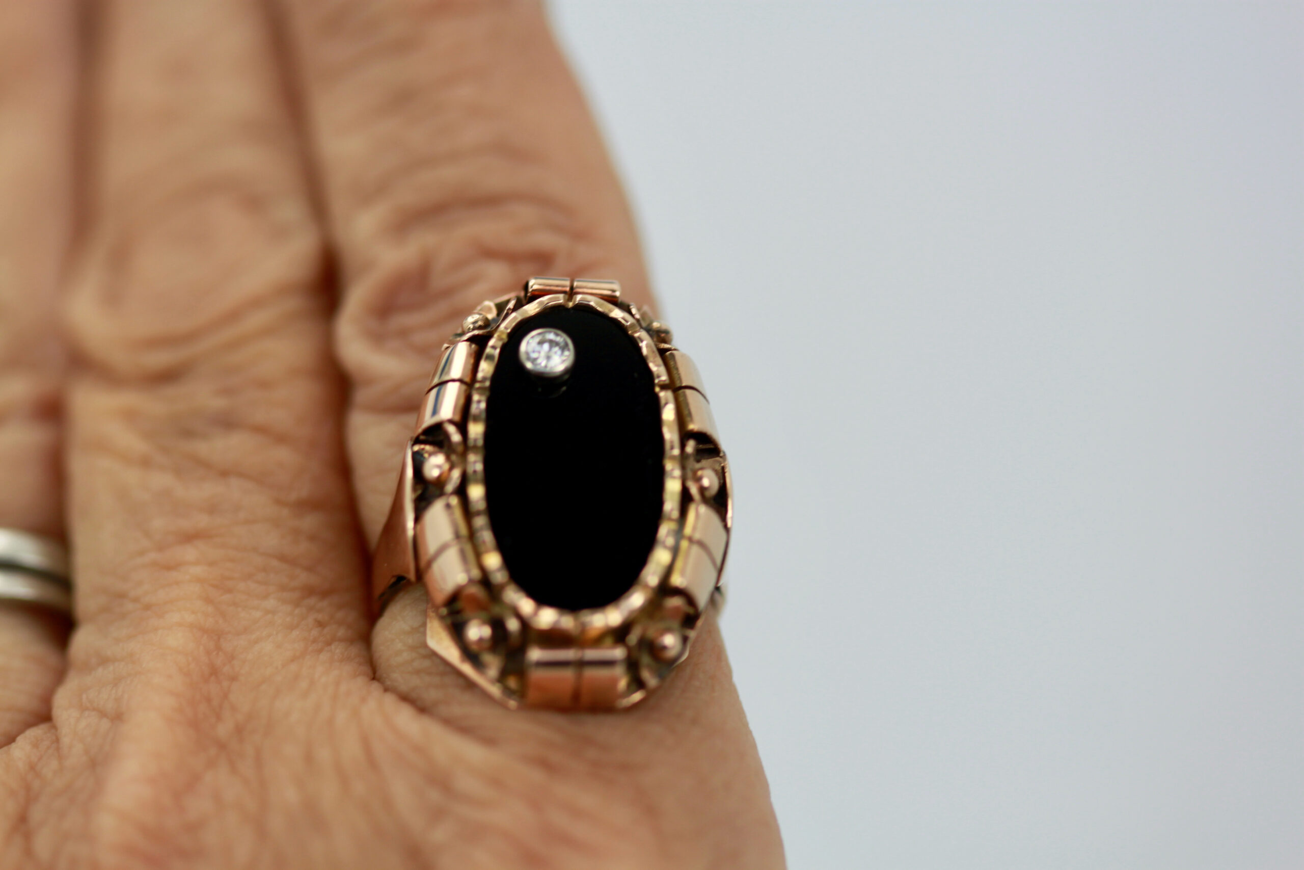 This black onyx ring is set in 14K rose gold. It has a small Diamond set on the top. This ring is from the 1940's and is highly detailed and chase worked, just look at the sides and mount. It is substantial and weighs 9.7 grams. It is 3 cm long and 2 cm wide and a depth of 2.34cm size 10. This is a basic ring for many and this Black Onyx ring with Diamond should be in your collection. Comes out of the UK.