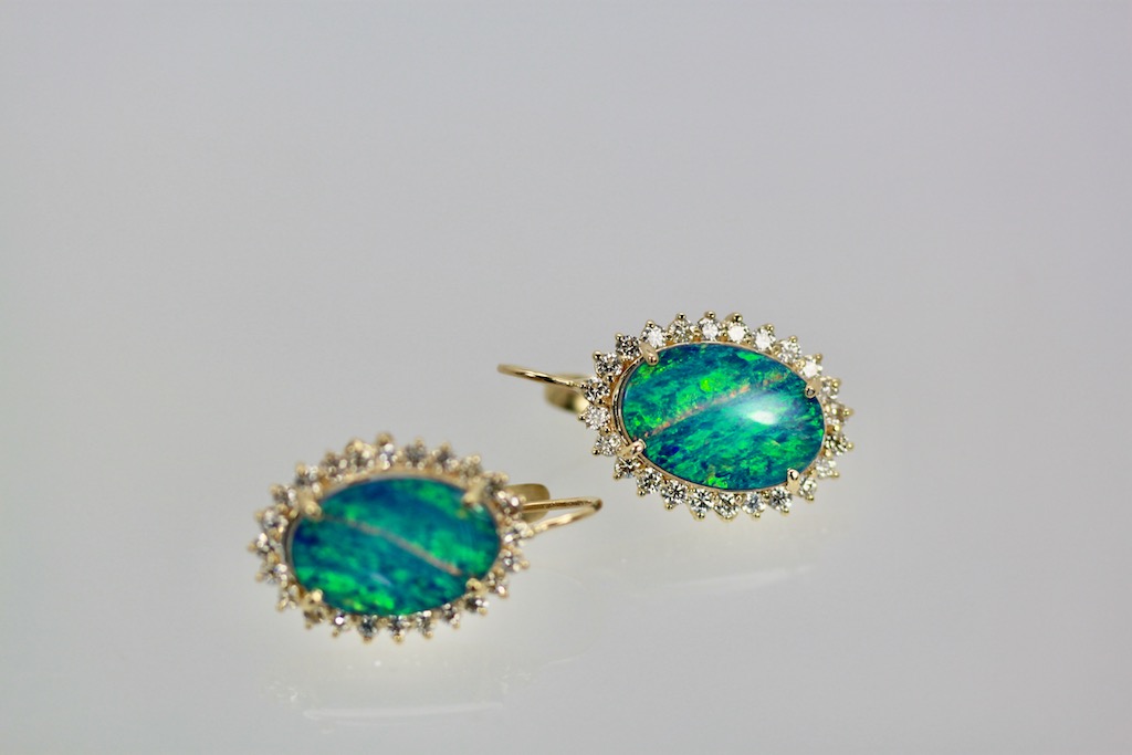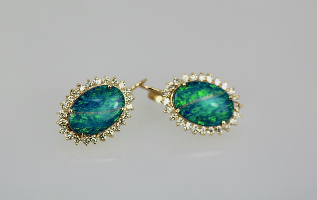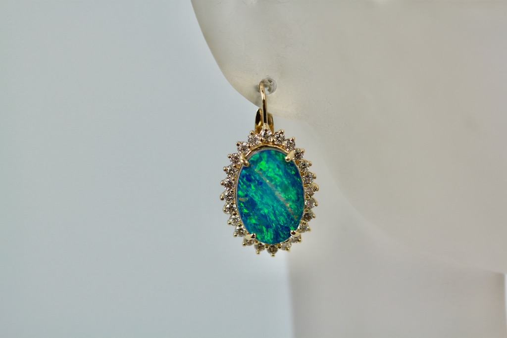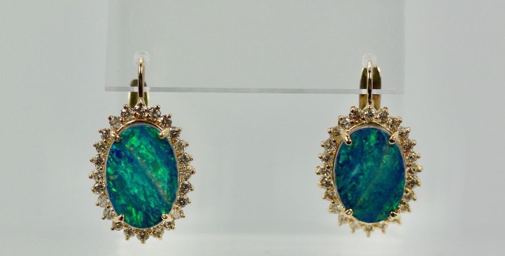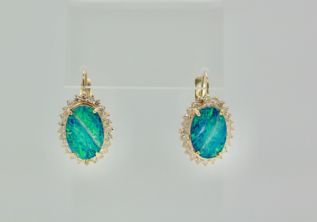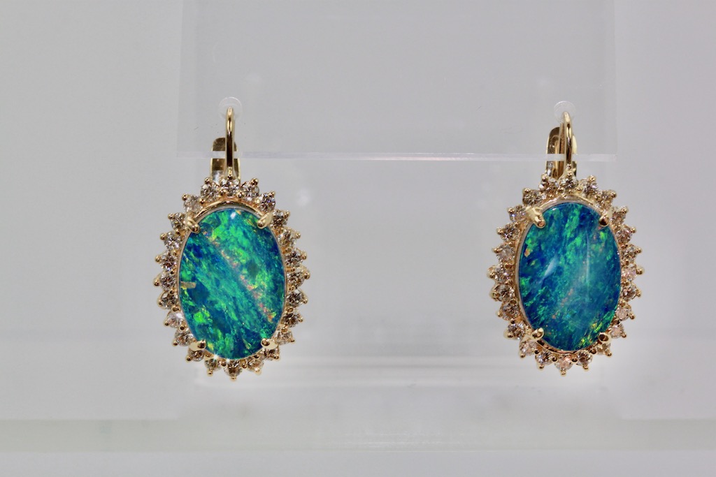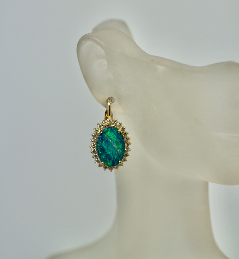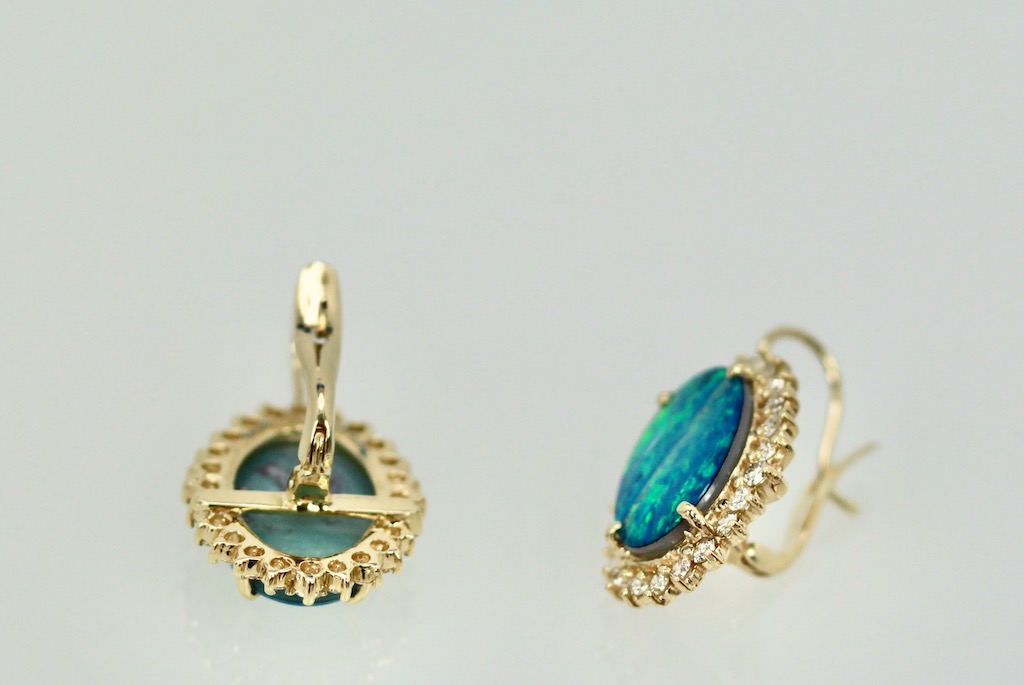 These Black Opal earrings are oval with a diamond surround. The Opals are 18.54mm x 13.08mm, these are Opal doublets. Set in a surround of Diamonds they measure 23.26mm x 17.51mm. These weight 10.2 grams there are 1.88 Carats of Diamonds the Opals weight 8.75 Carats. These earrings have a beautiful matrix of blues greens and a bit of orange, stunning. Black Opal are very coveted as they come in many different matrix of colors. These are beautiful black Opal doublets that anyone would love. eIf you love black Opals although these are doublets they are just lovely and match many Black Opal items. I have several and love them all. Do not wait too long to purchase they are priced to sell.