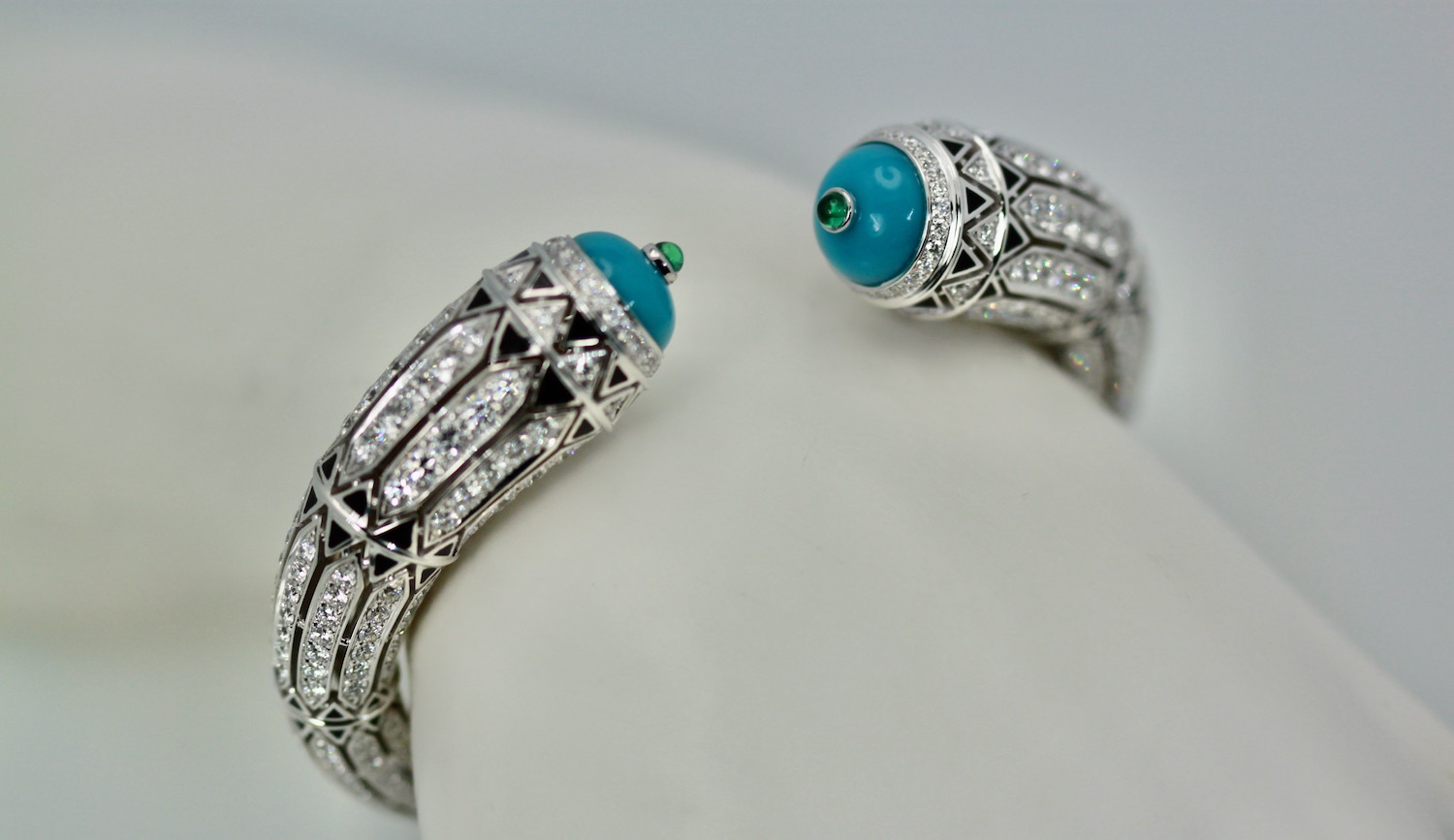 This new and amazing bracelet is from a “new” Cartier collection just recently launched in 2022. This is deco inspired with black enamel, Diamonds and Turquoise. The terminals of the Turquoise is set with two 10mm Emerald. This bracelet measures 14.10 at the widest and 7.6 in the back. The size is 17 and weighs 76.0 grams, it also features 540 Diamonds totaling 12.73 Carats. This is new and in perfect condition, comes boxed and with original store receipt. This bracelet retails for $230,000. Now you can get this a a sliver of the price. This piece is absolutely beautiful no comparison to other pieces and it is so unique I would not wait or it will be gone. Please see the matching earrings.