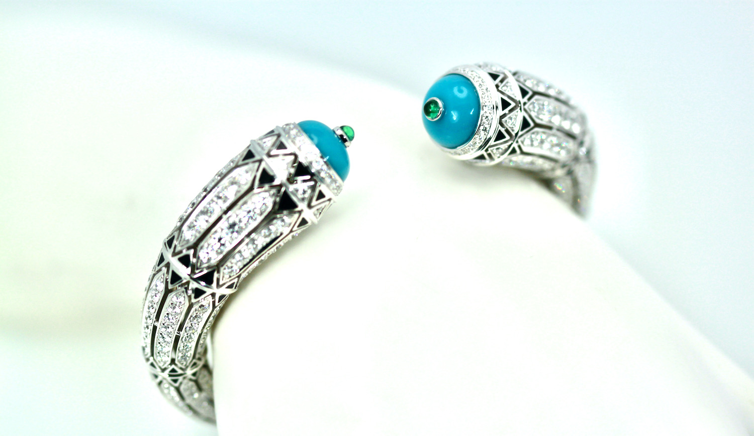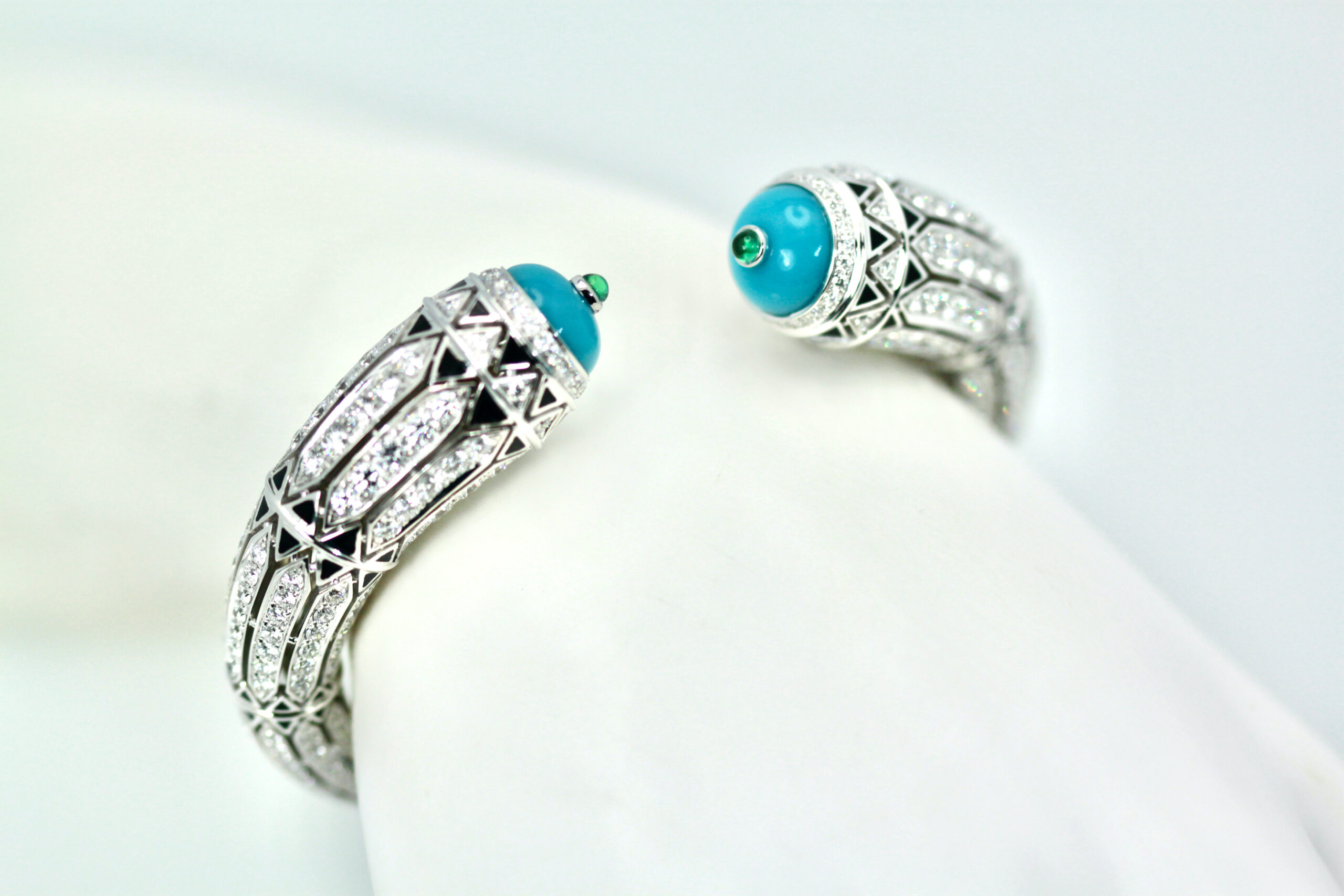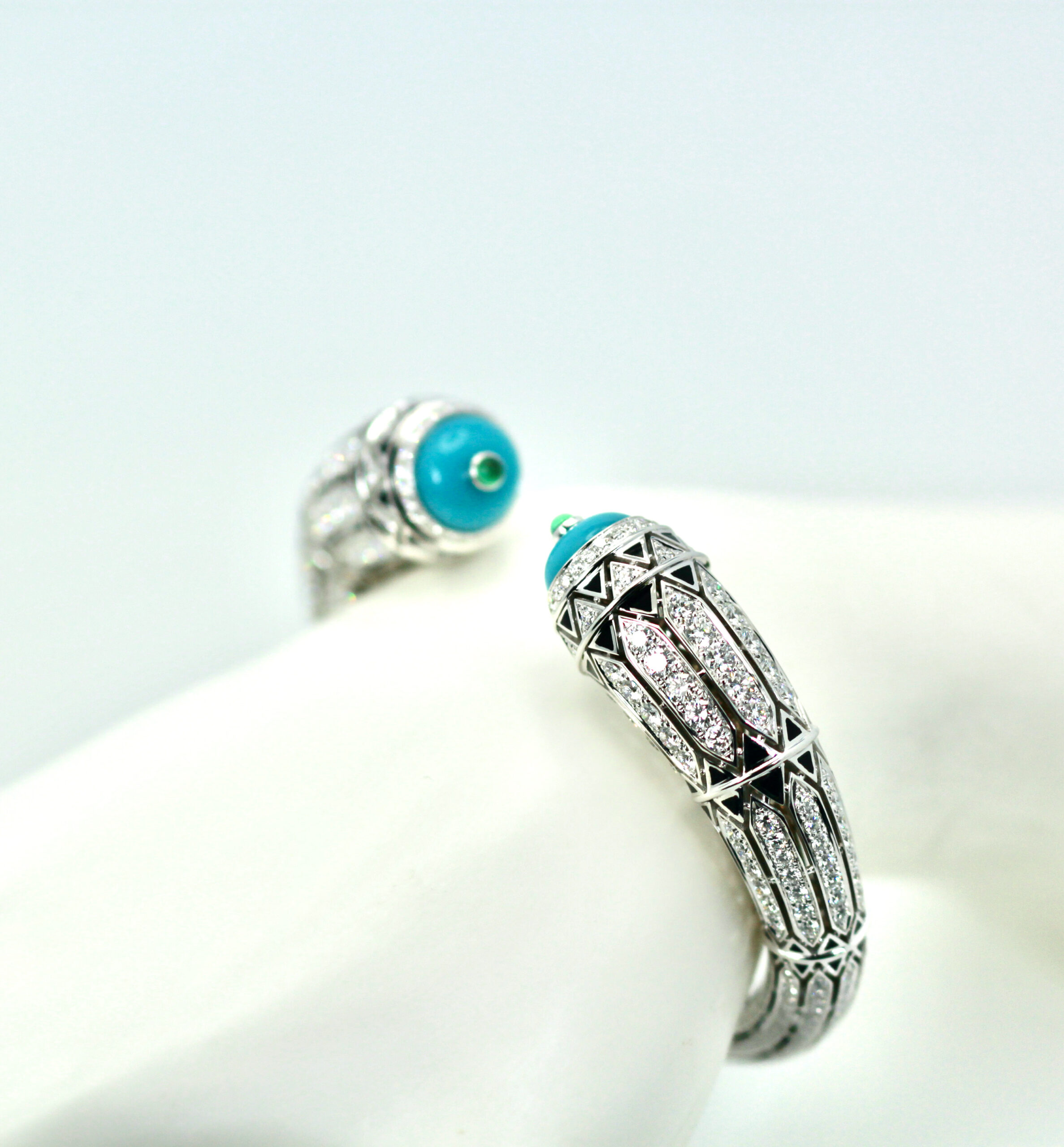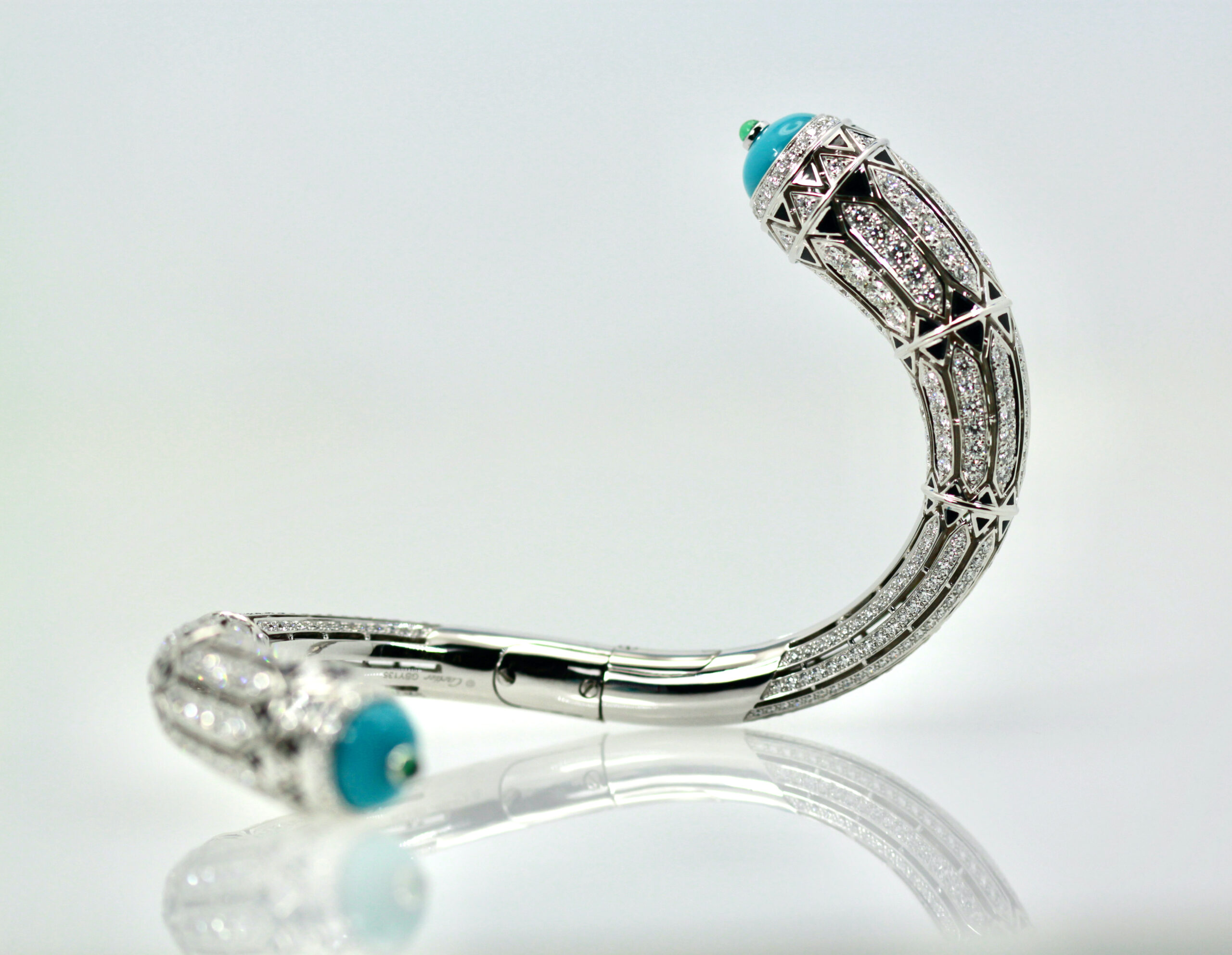 This new and amazing bracelet is from a "new" Cartier collection just recently launched in 2022. This is deco inspired with black enamel, Diamonds and Turquoise. The terminals of the Turquoise is set with two 10mm Emerald. This bracelet measures 14.10 at the widest and 7.6 in the back. The size is 17 and weighs 76.0 grams, it also features 540 Diamonds totaling 12.73 Carats. This is new and in perfect condition, comes boxed and with original store receipt. This bracelet retails for $230,000. Now you can get this a a sliver of the price. This piece is absolutely beautiful no comparison to other pieces and it is so unique I would not wait or it will be gone. Please see the matching earrings.