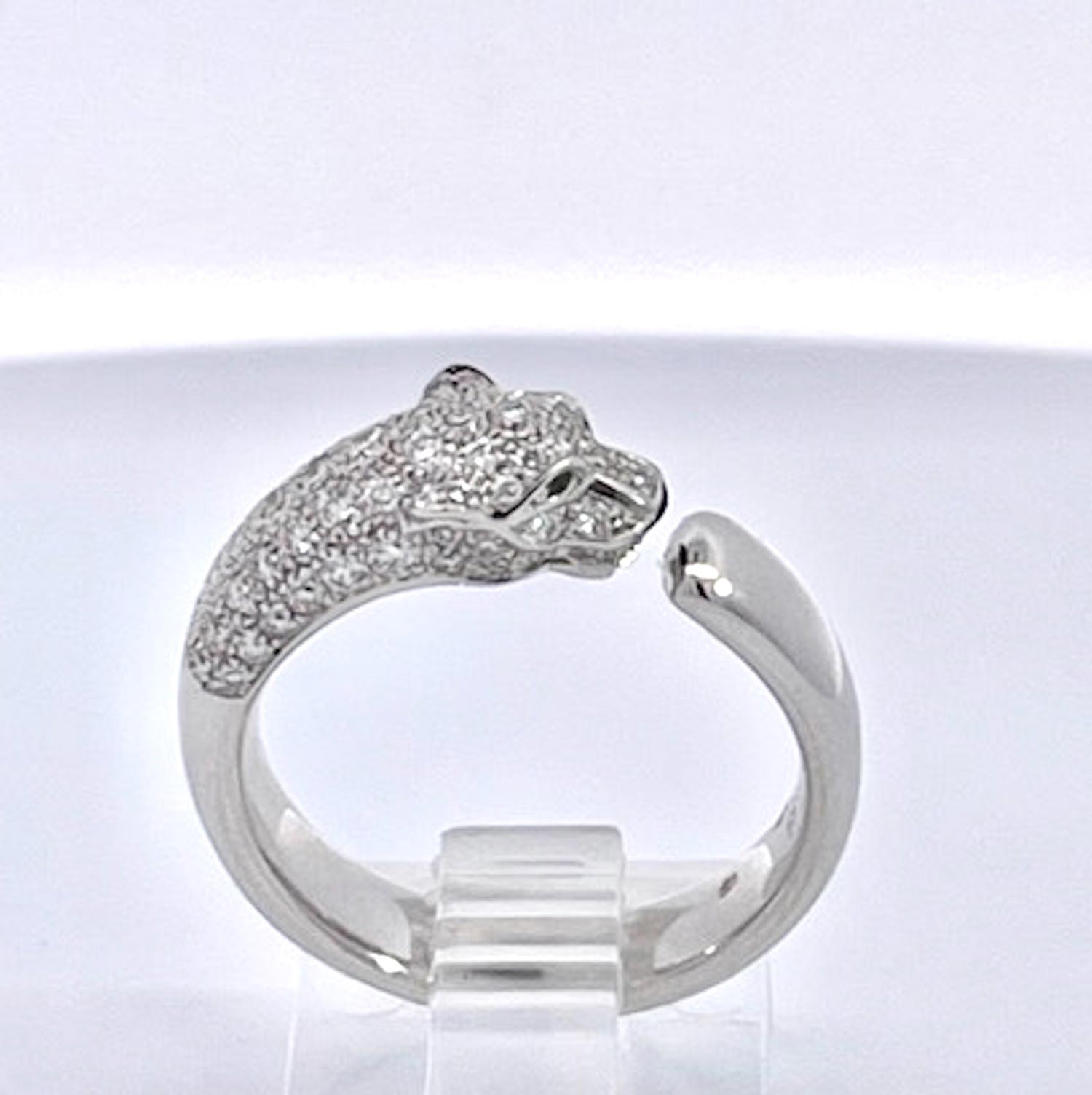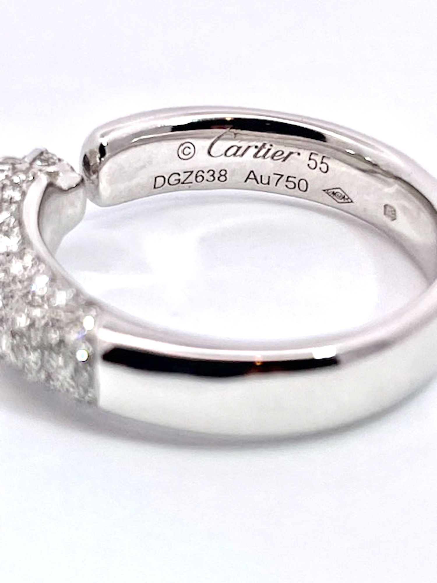 This ring is new and a variation on the standard Diamond Head Panthere. It is smaller in diameter as it is thinner than the standard ring. Like most of the Panthere Collection has been revised and made smaller for less expensive pieces this is one. This is fully hallmarked Cartier 55 AU 750 DGZ 638. It is stackable as I said it is thinner than most and of course less expensive. This is 4.48mm the Head is 6.29mm it has emerald eyes and an onyx nose. It weights in at 9.20 grams.
