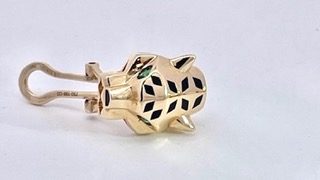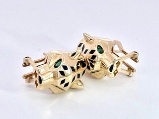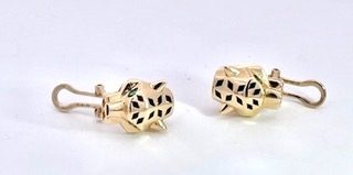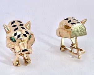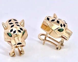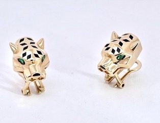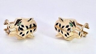 These earrings are by Cartier and part of their Panther collection. They are in perfect condition although they are used and not new. They look new and perfect so they are ready to go. These earrings have the Panther head and spotted in black enamel. They are studs yet beautiful and match many of the Cartier Panther items. These weigh in at 6.12 grams and measure 10 mm x 15mm x 5 mm deep. These are for pierced ears. These are special so I wouldn't wait, get them now.