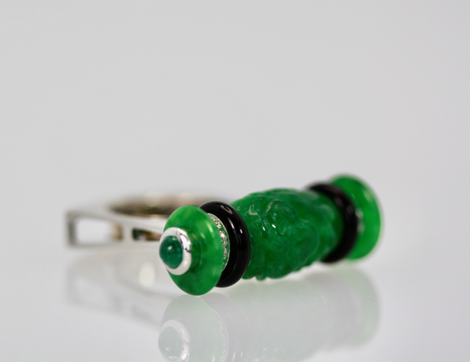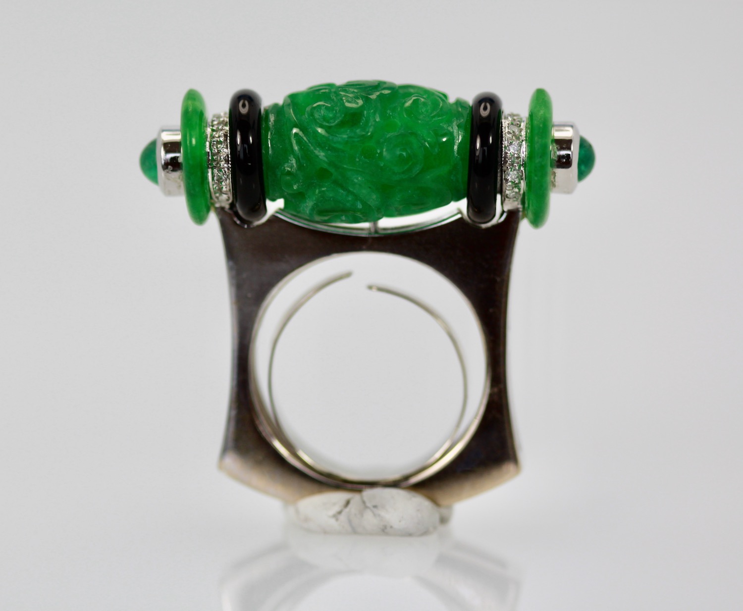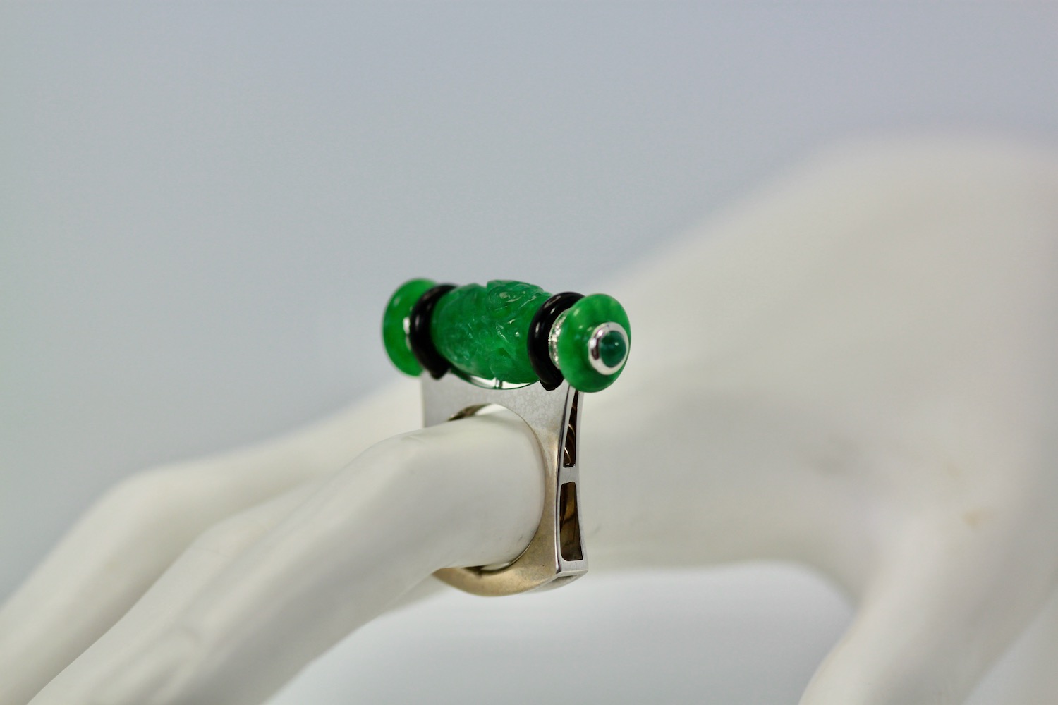 Carved Jade Onyx Cabochon Emerald Ring