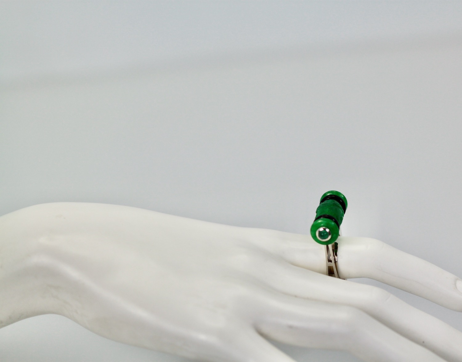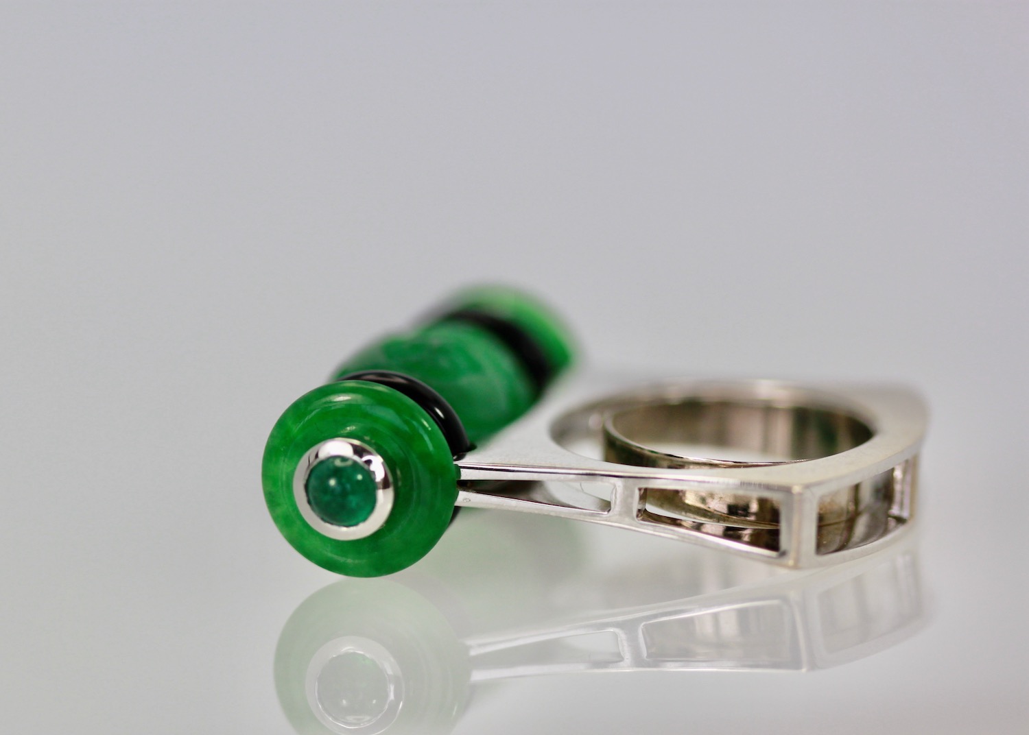 This lovely Carved Jade Onyx Cabochon Emerald Ring ring is set in 18K White Gold. Furthermore, the carved green Jade is centered with black Onyx rings on the side of the stone. Finally, there is a jade disk terminating in a cabochon Emerald bullet. The ring measures 33.33cm long, 9.59cm wide and is 13.30cm high. It weighs 15.2 grams and is a size 6.5.