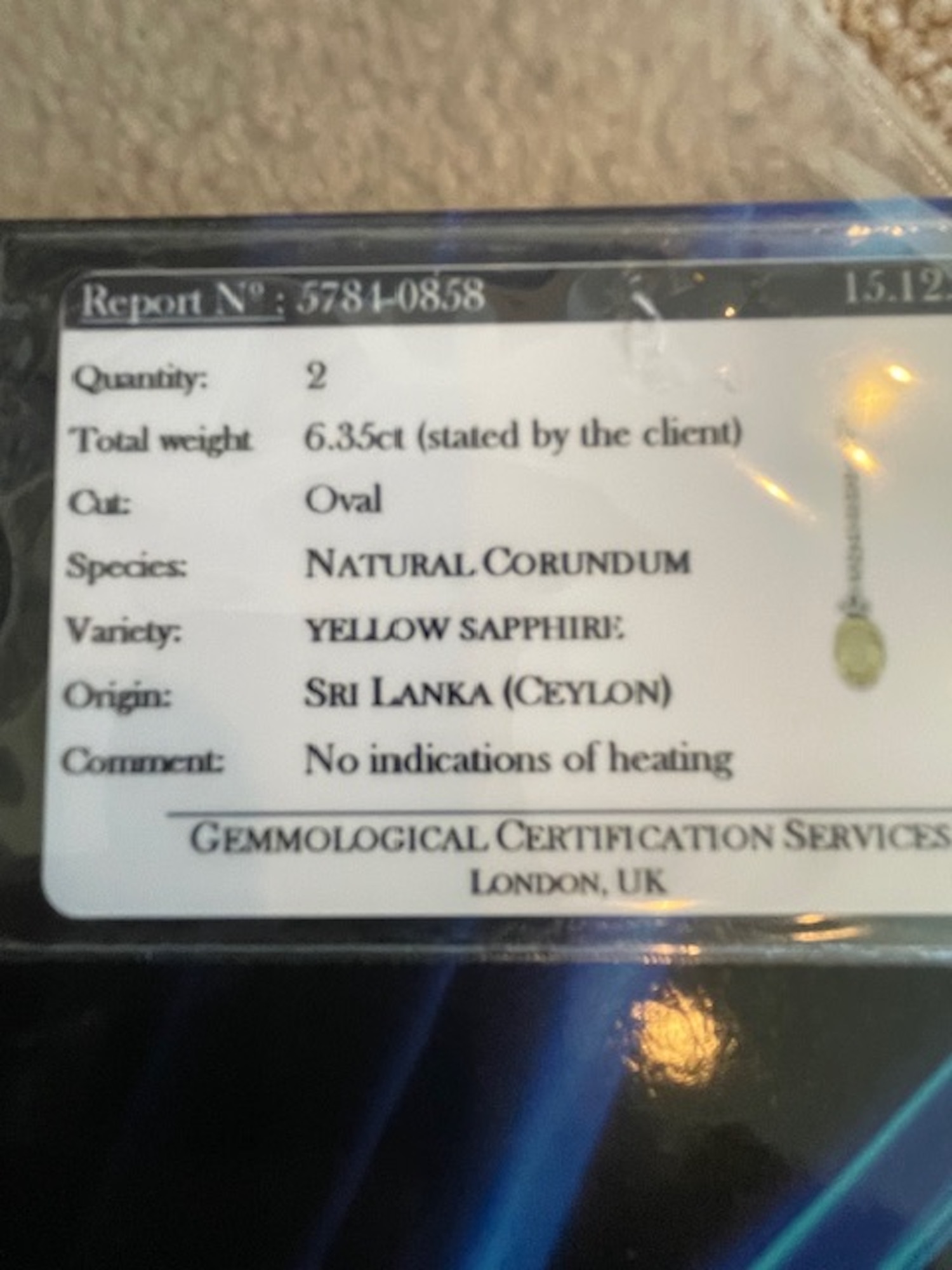 These earrings are special as they are a gorgeous color of Yellow Sapphires. These Sapphire are no heat and no treatment and weigh in at 6.35 Carats. They are transparent and measure 9.2 x 6.9 x 4.6 mm the other measures 9.2 x 6.3 x 5mm. There are also Diamonds which total 1.35 Carats. All in all these earrings are 7.7 carats total weight. These earrings are 4.48 cm 6.3 grams. There are 2 Diamonds on top of the sapphires at 0.15 points each, also 20 Diamonds @ 0.5 points each @ 1 carat. Shepard hooks are the closure. This comes with a certificate of appraisal from the Gemmological Certification Services, London, Uk. Finding any Sapphires that have no treatment and no heat are very hard to come by.