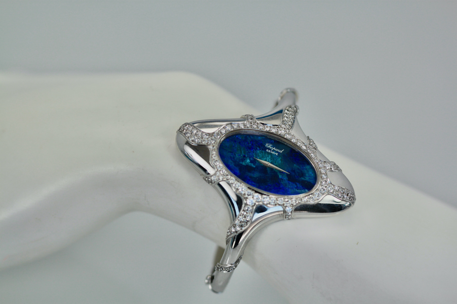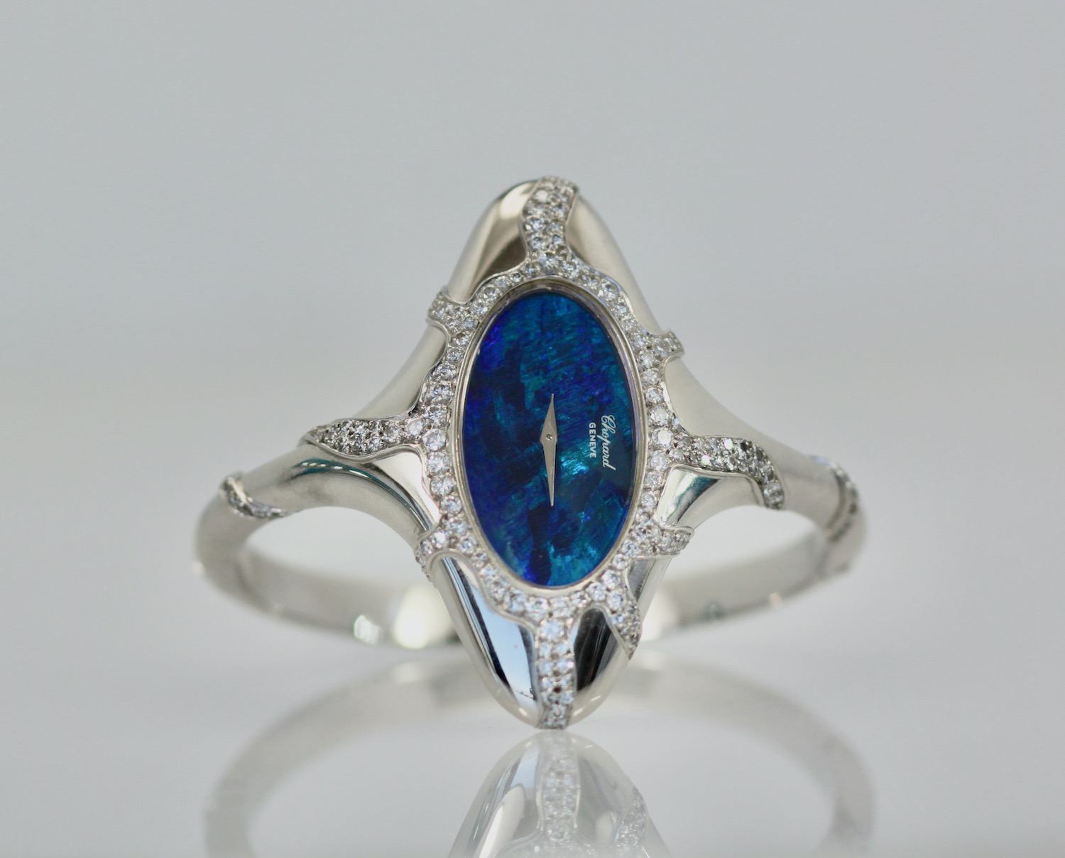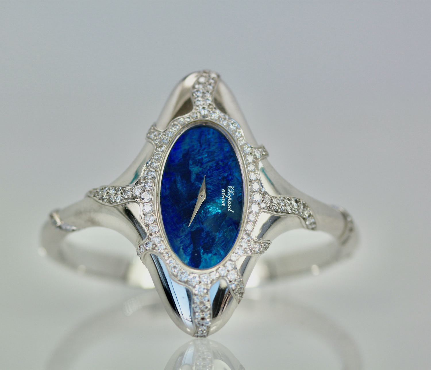 This Chopard Opal Diamond Watch is done in 18K white gold, Black Opal Face, manual wind Ladies Wristwatch. The Opal measures 3 cm x 2 cm and is covered in Diamonds. There are Diamonds around the face of the watch and down the sides in a starburst design. There are over 100 Diamonds, it is signed Chopard. The watch measures 54.5 x 27mm. Fits a 6.5 to 7.5 even maybe 8" wrist. This is one of the most special watches around and it is stunning. As for Chopard watches they are very special for women. I would say a Chopard, Piaget or Rolex is the preferred watches, but this is a very special Chopard as in the 1970's they made collectable art pieces and this is definitely one.