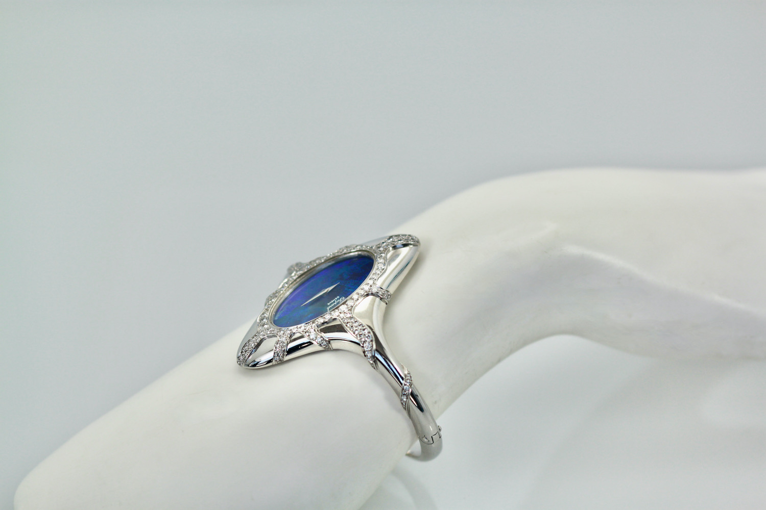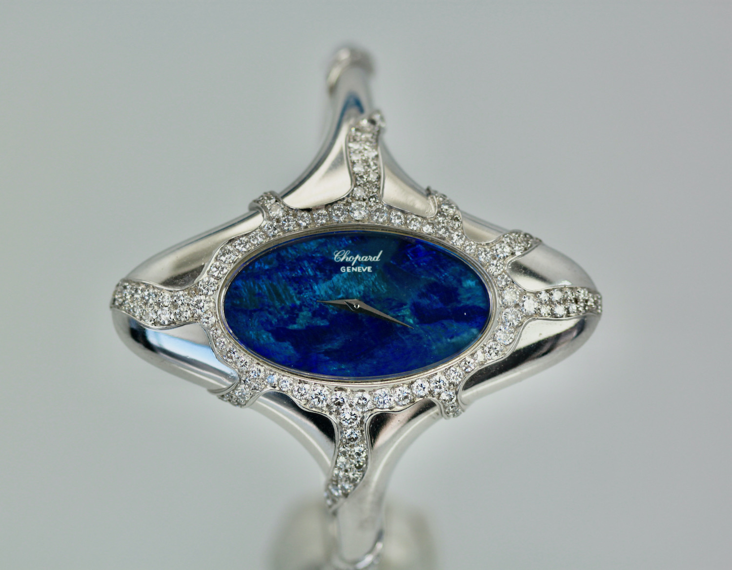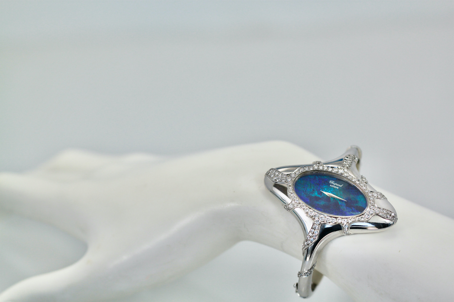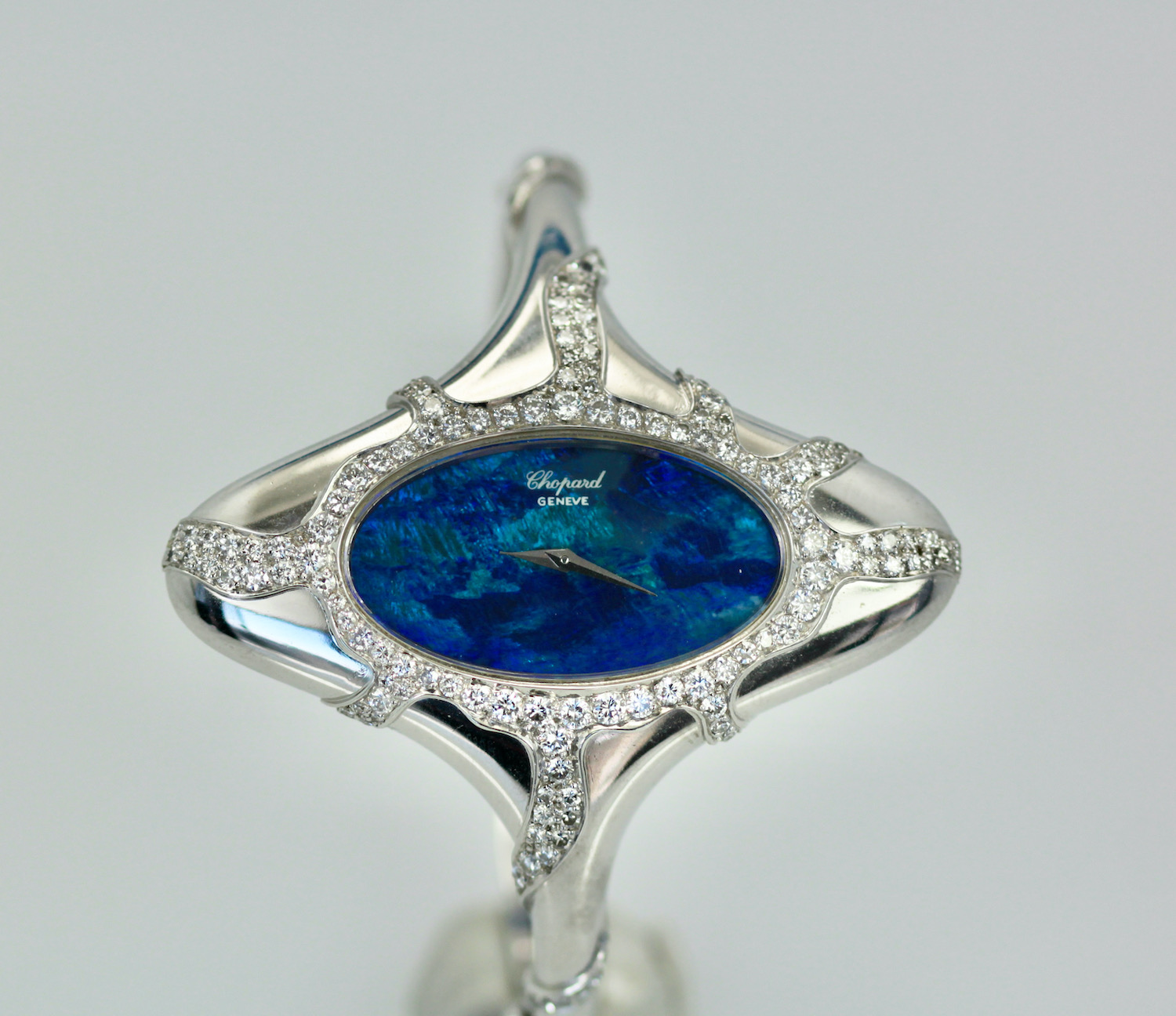 This Chopard Opal Diamond Watch is done in 18K white gold, Black Opal Face, manual wind Ladies Wristwatch. The Opal measures 3 cm x 2 cm and is covered in Diamonds. There are Diamonds around the face of the watch and down the sides in a starburst design. There are over 100 Diamonds, it is signed Chopard. The watch measures 54.5 x 27mm. Fits a 6.5 to 7.5 even maybe 8" wrist. This is one of the most special watches around and it is stunning. As for Chopard watches they are very special for women. I would say a Chopard, Piaget or Rolex is the preferred watches, but this is a very special Chopard as in the 1970's they made collectable art pieces and this is definitely one.