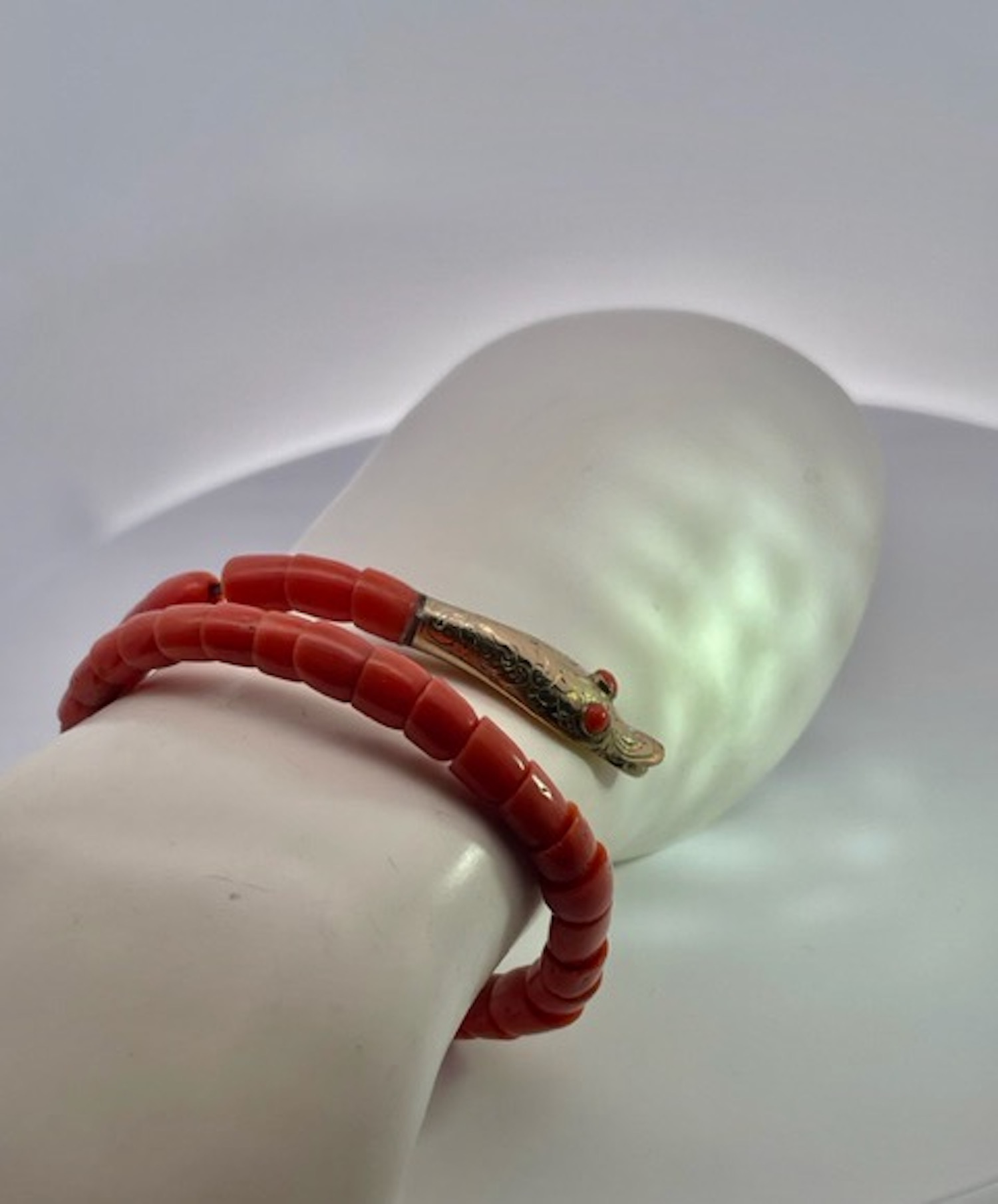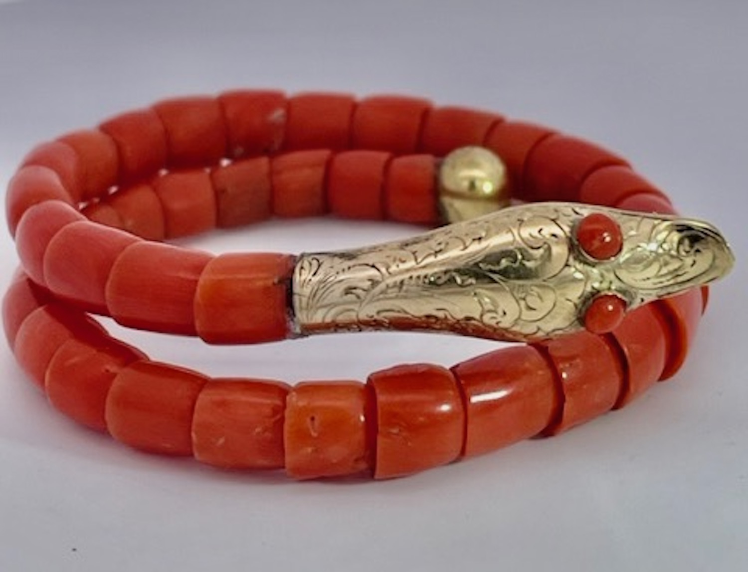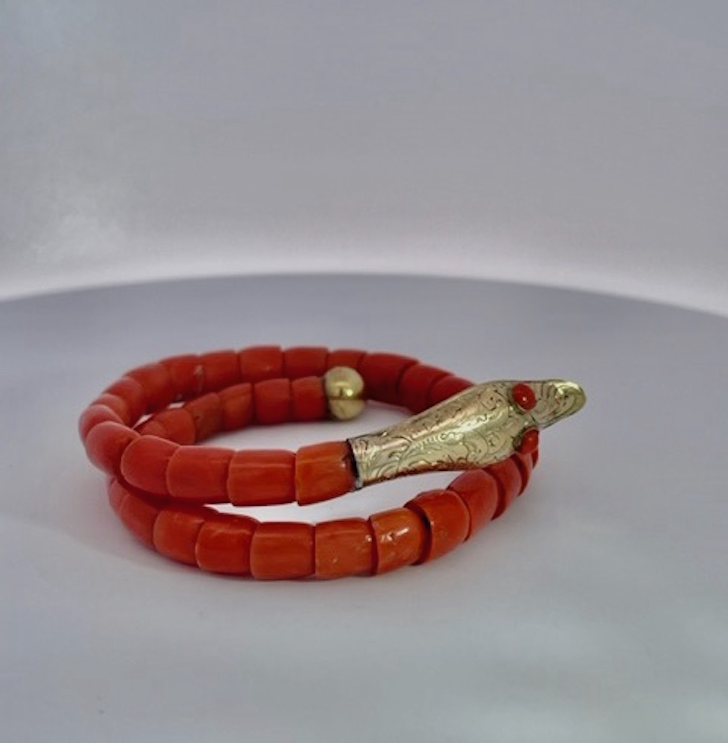 Here is another Coral Snake Bracelet. This one is single beads with a Yellow Gold Head and Tail. This bracelet has a wire spring that holds the bracelet in place so there are no closures. There are 38 Coral Beads, plus two extra for the eyes. This fits all sizes of wrists. This weights in at 17.15 grams and is 11mm wide. Again this bracelet needs a new home as I have too many and can not keep this one. The beads are a true orange not red and the Gold is 9K. The face is etched nicely with a lot of detail. Don't wait it will be gone.