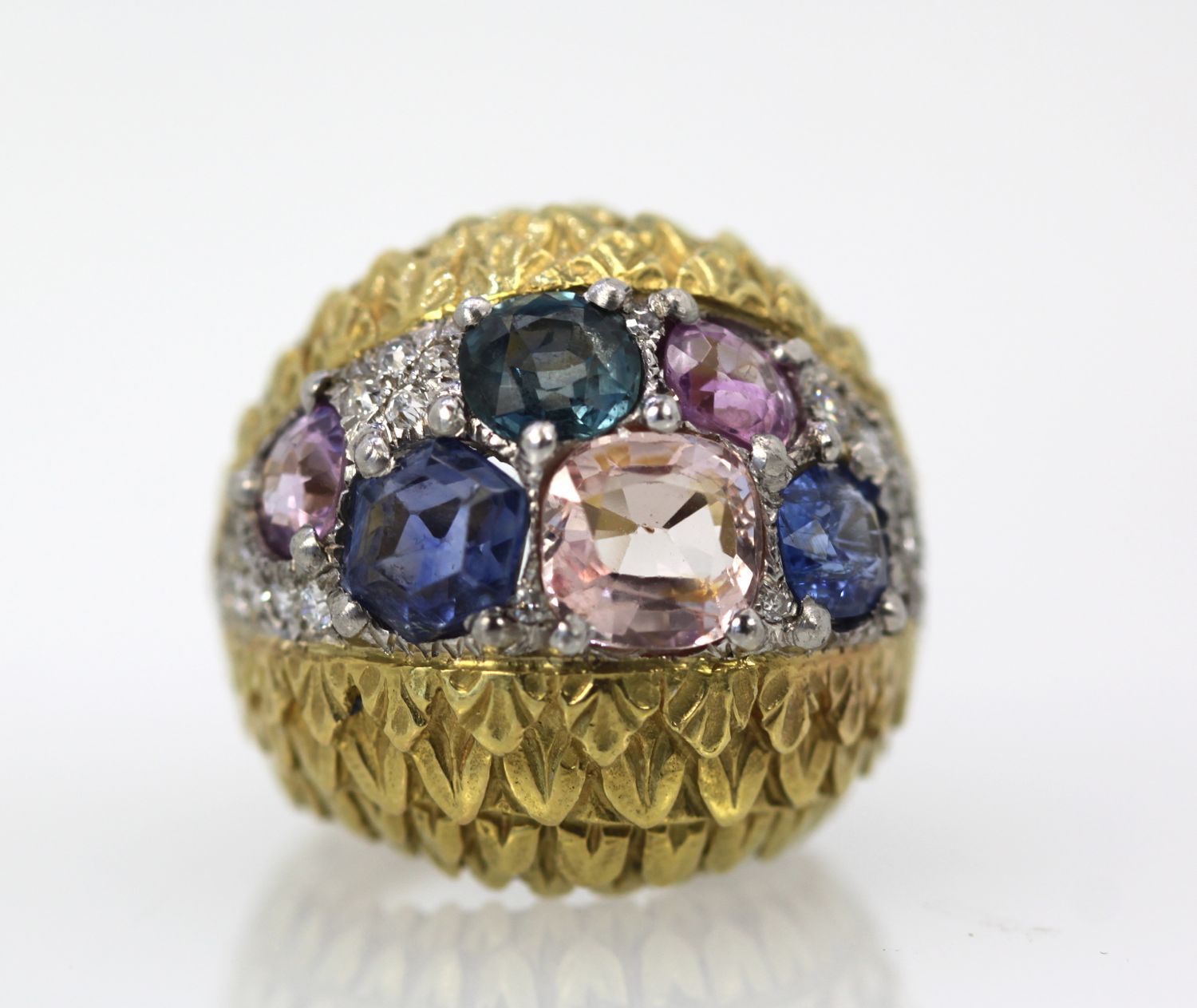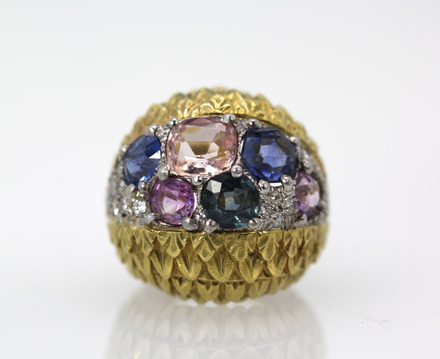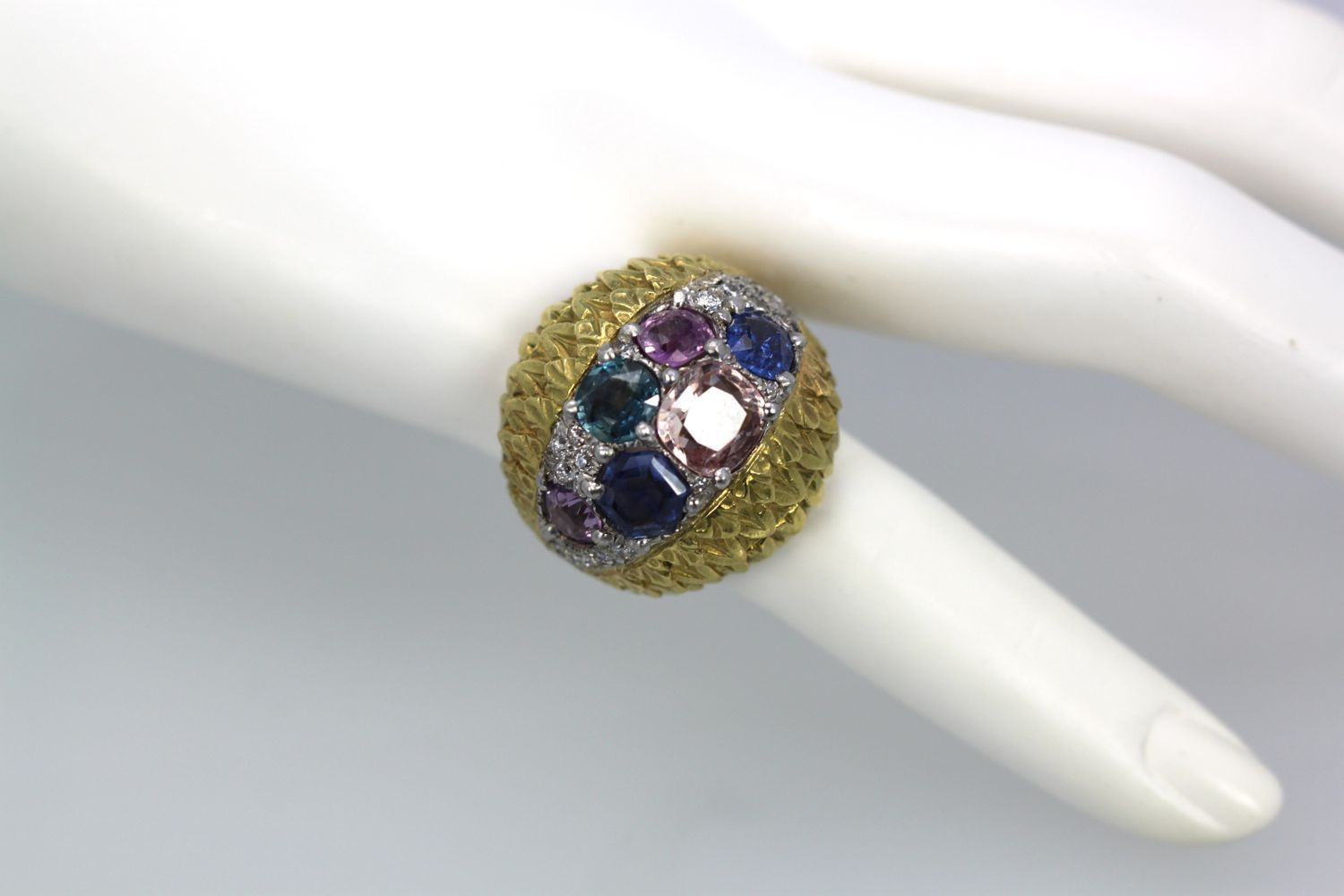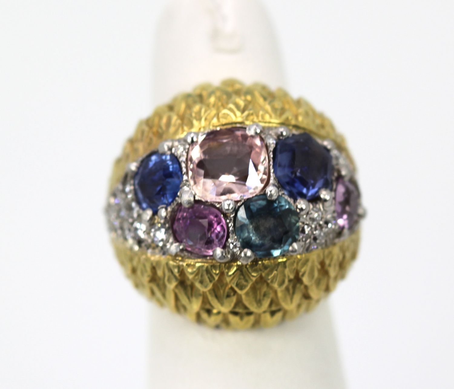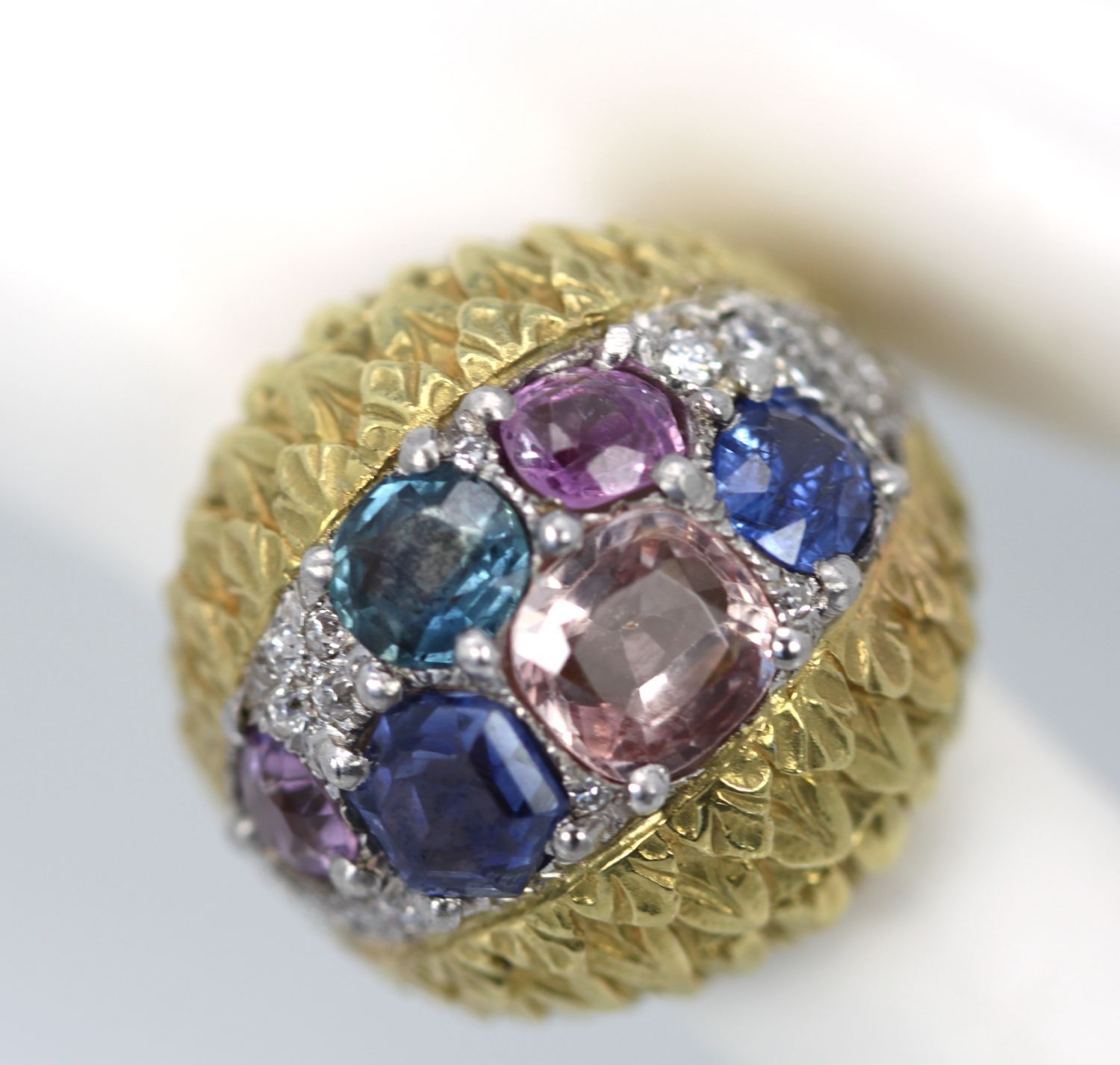 Love David Webb, I just can't get enough of his jewelry. It is always remarkable with the finest workmanship and the very best grade of Gemstones and Diamonds always the very best. This ring comes from an auction house in London, England. The body of this ring is beautifully textured with an etched detail of what appears to be leaves of a tiny heart design. There are two sections of finely etched detail work. The center of the ring is set in Platinum and F color VS clarity Diamonds of about 1.00 carat surrounding the six fancy Sapphires. These Sapphires are different colors and different shapes and sizes. There are 3 blue Sapphires, 1 medium Blue 1.00 carat, I Blue with Teal undertones, .75 Carat, 1 rich deep blue 1.25 carats to total 3.00 carats There is also 1 Peach Sapphire of 2.25 Carats and 2 Pink Sapphires both at 0.65 Carats each. All in all this totals 6.55 Carats. This ring has a high dome 21.4mm across ring 22.3mm width and 14mm x 29.09mm.