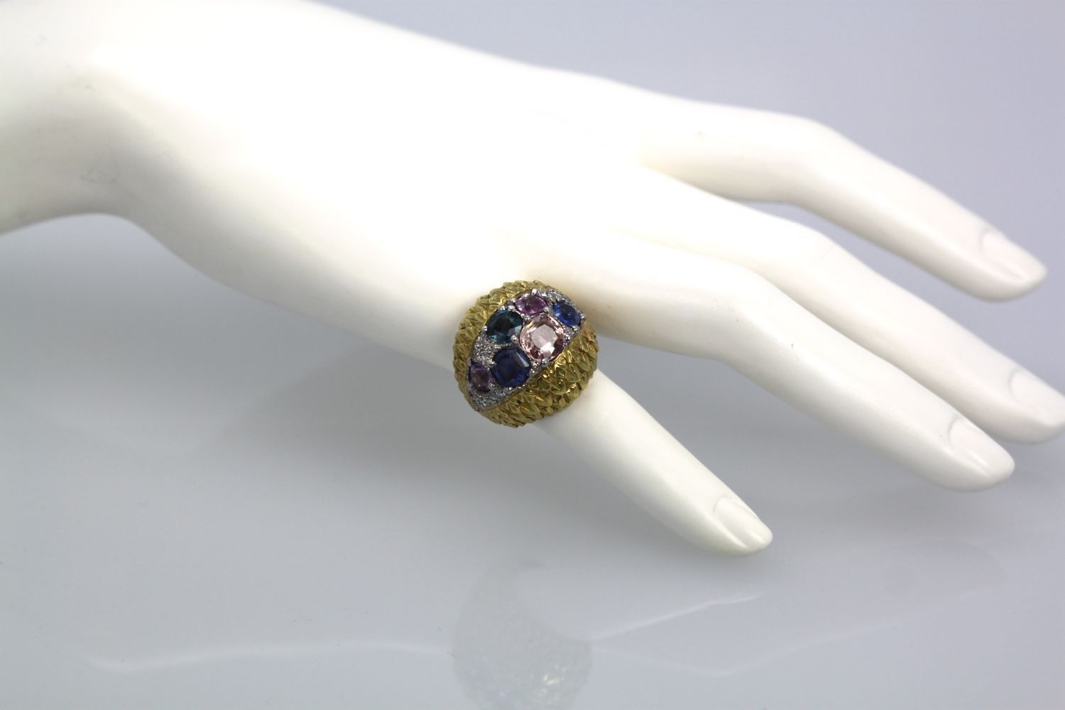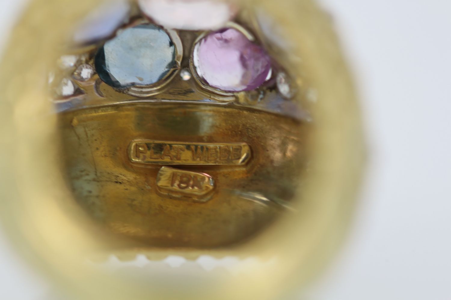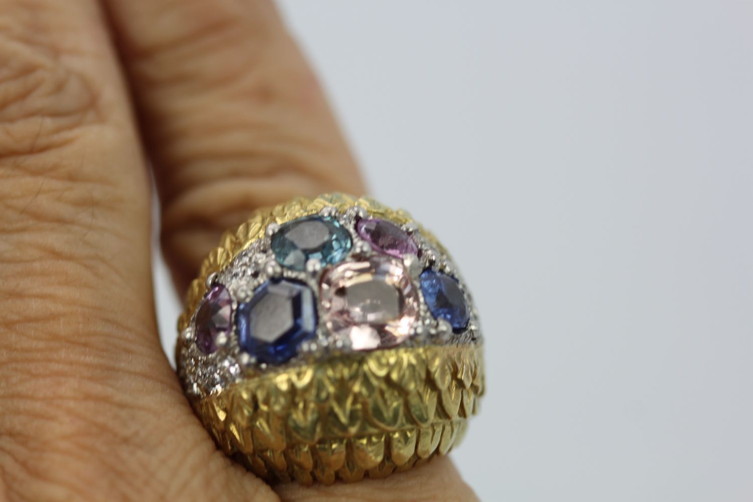 Love David Webb, I just can’t get enough of his jewelry. It is always remarkable with the finest workmanship and the very best grade of Gemstones and Diamonds always the very best. This ring comes from an auction house in London, England. The body of this ring is beautifully textured with an etched detail of what appears to be leaves of a tiny heart design. There are two sections of finely etched detail work. The center of the ring is set in Platinum and F color VS clarity Diamonds of about 1.00 carat surrounding the six fancy Sapphires. These Sapphires are different colors and different shapes and sizes. There are 3 blue Sapphires, 1 medium Blue 1.00 carat, I Blue with Teal undertones, .75 Carat, 1 rich deep blue 1.25 carats to total 3.00 carats There is also 1 Peach Sapphire of 2.25 Carats and 2 Pink Sapphires both at 0.65 Carats each. All in all this totals 6.55 Carats. This ring has a high dome 21.4mm across ring 22.3mm width and 14mm x 29.09mm.