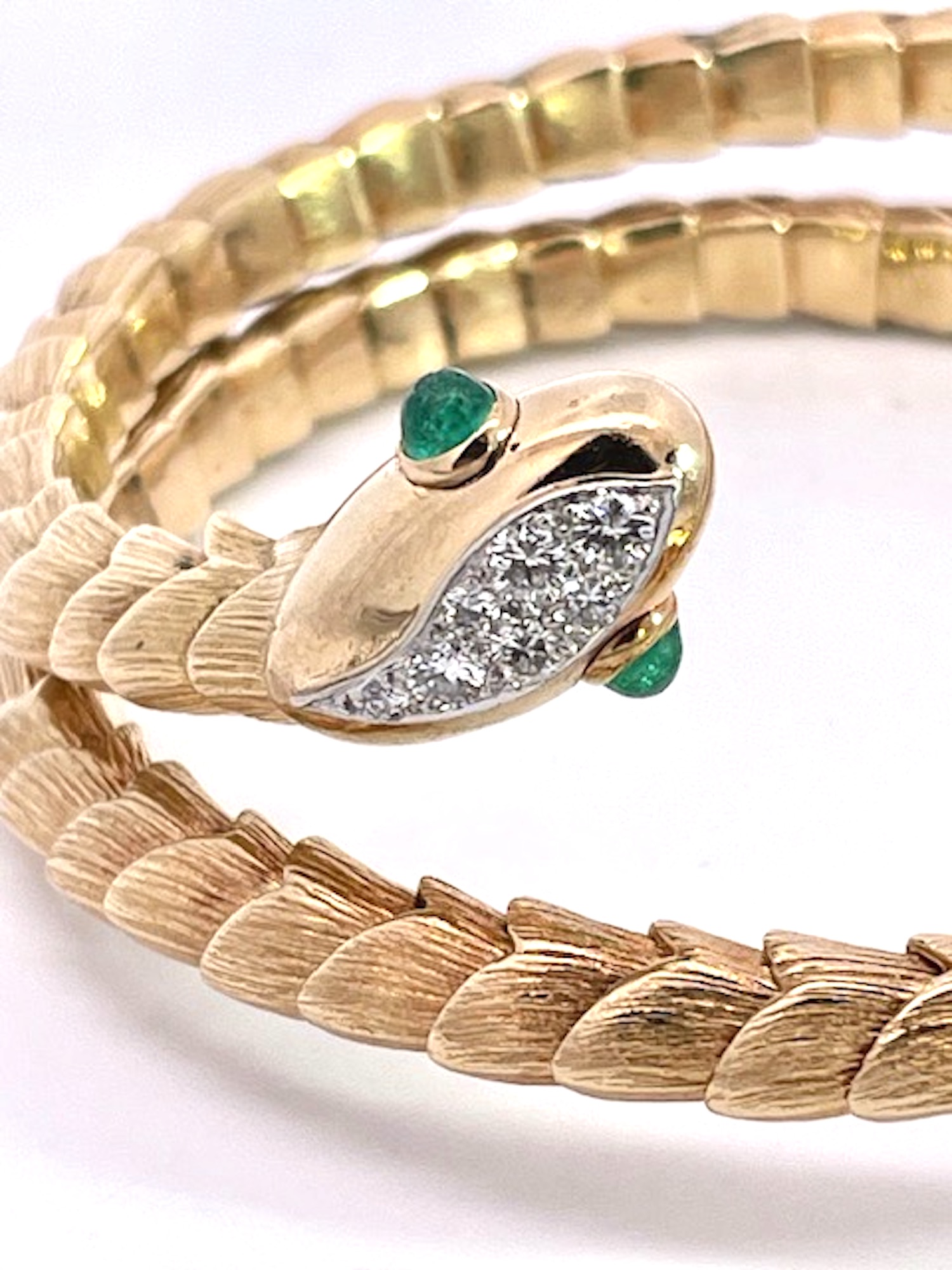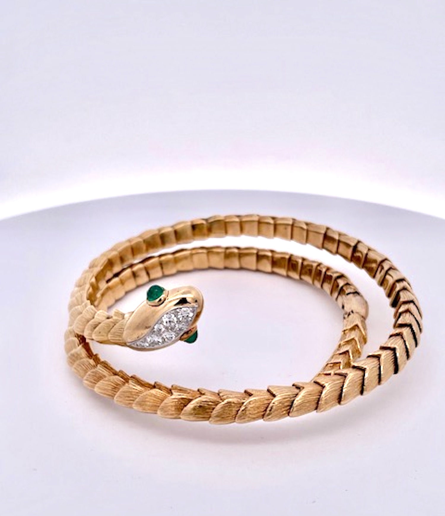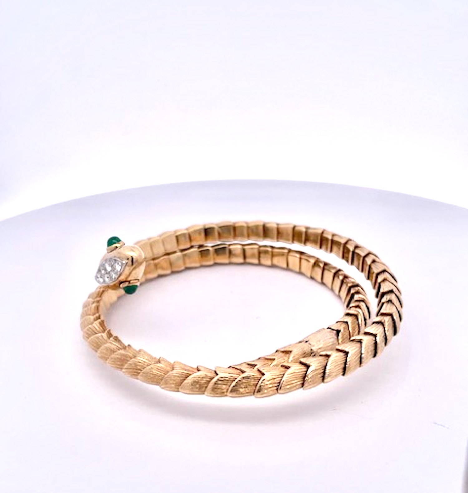 This David Webb Snake Bracelet is rare. I have only seen it once before in 15 years. This bracelet is a coil that runs around the wrist twice. The face is lovely with a Diamond head and two Cabochon Emerald eyes. This piece is in very good condition, with one repair near the tail, but It does not distract from this piece. This comes with a certificate appraisal of $23,995. I was able to get this for a great price so I am passing that on. This bracelet fits a size 7.25 but a smaller wrist can also fit. This bracelet is flexible. It weighs in at 89.87 grams, do not wait it might be too late as this is ready to go.