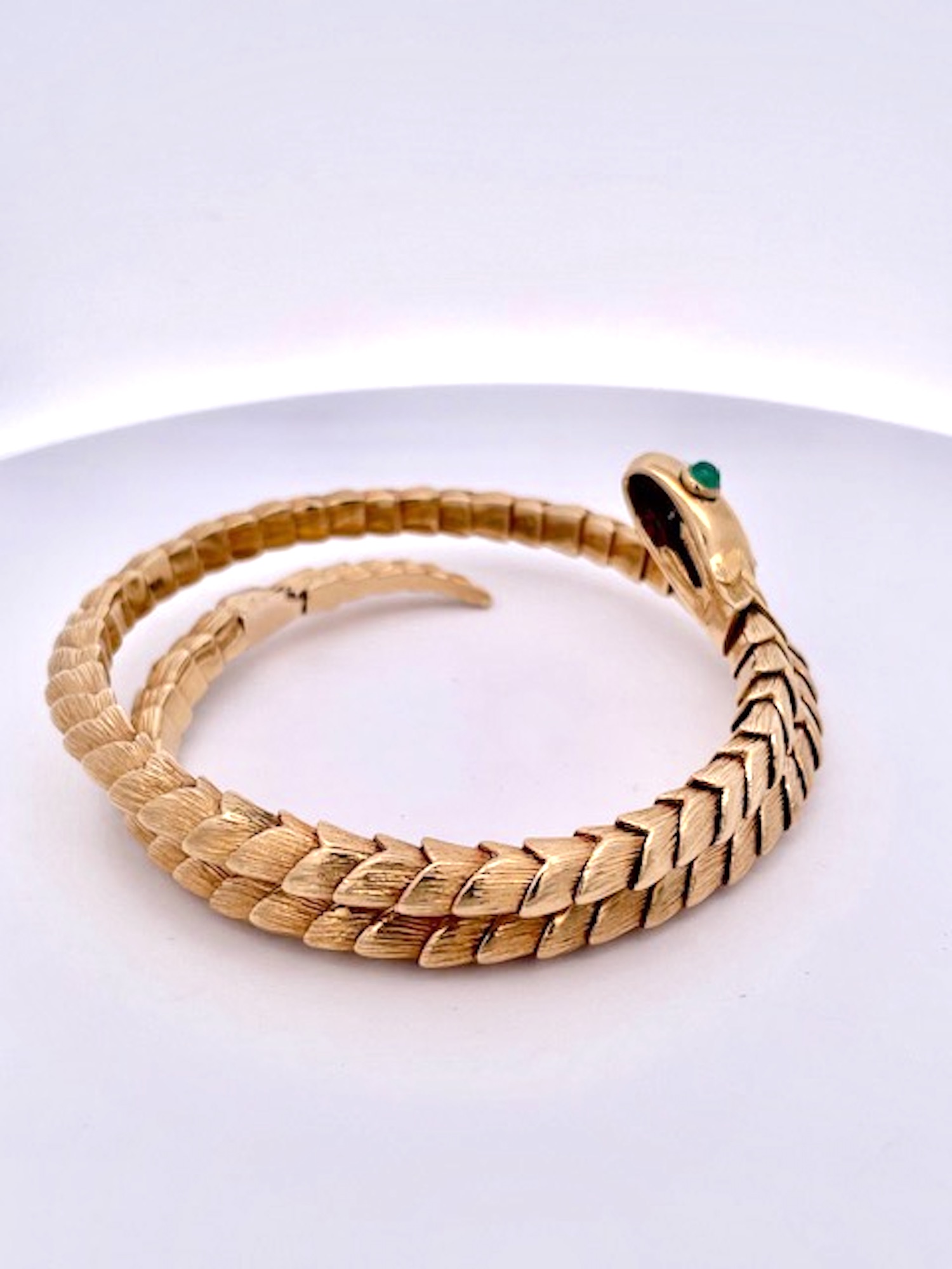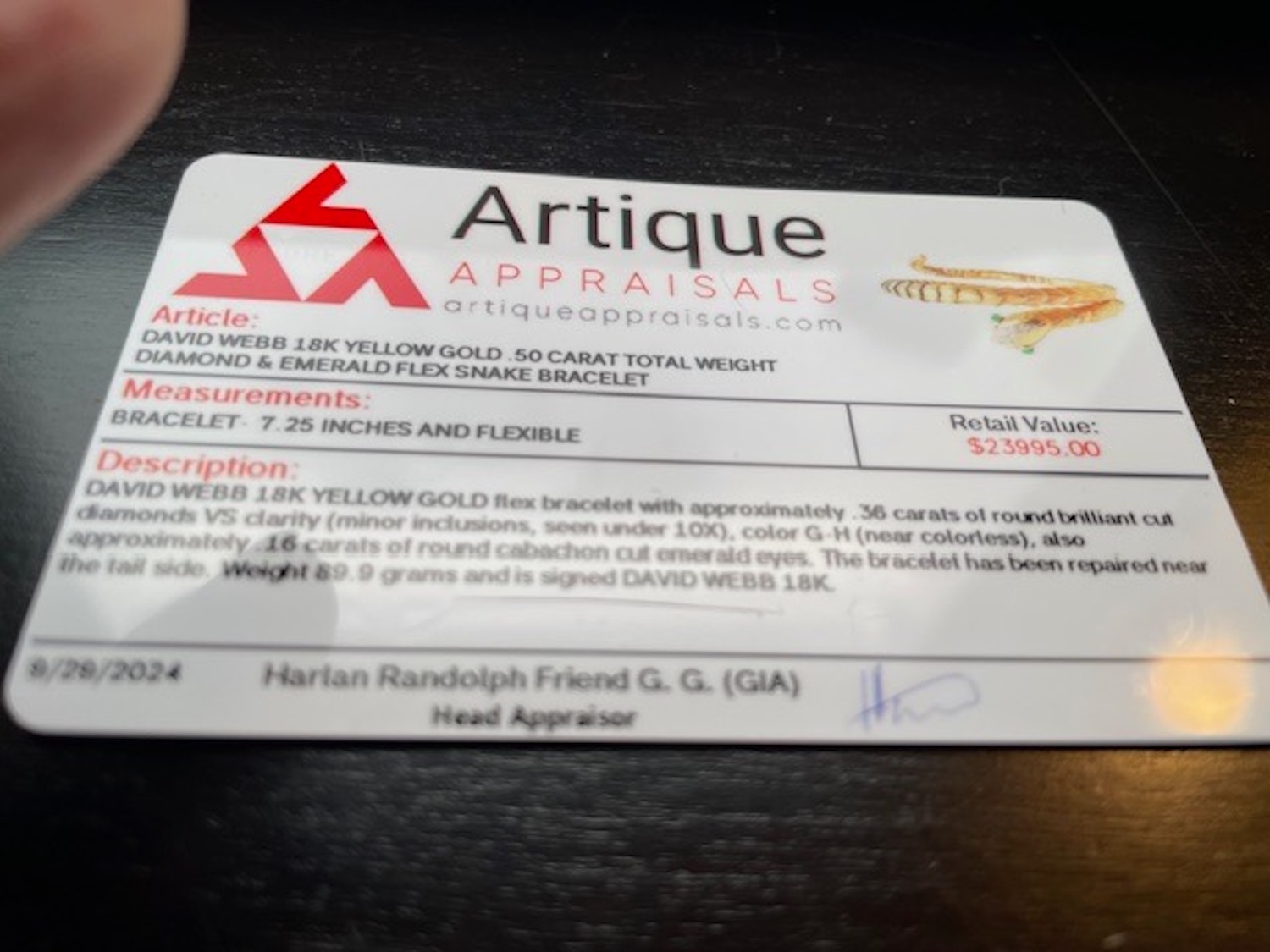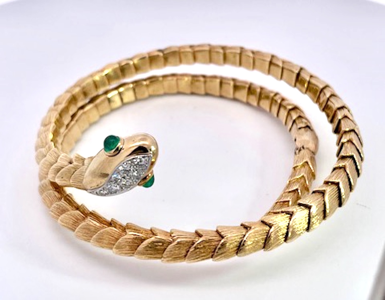 This David Webb Snake Bracelet is rare. I have only seen it once before in 15 years. This bracelet is a coil that runs around the wrist twice. The face is lovely with a Diamond head and two Cabochon Emerald eyes. This piece is in very good condition, with one repair near the tail, but It does not distract from this piece. This comes with a certificate appraisal of $23,995. I was able to get this for a great price so I am passing that on. This bracelet fits a size 7.25 but a smaller wrist can also fit. This bracelet is flexible. It weighs in at 89.87 grams, do not wait it might be too late as this is ready to go.