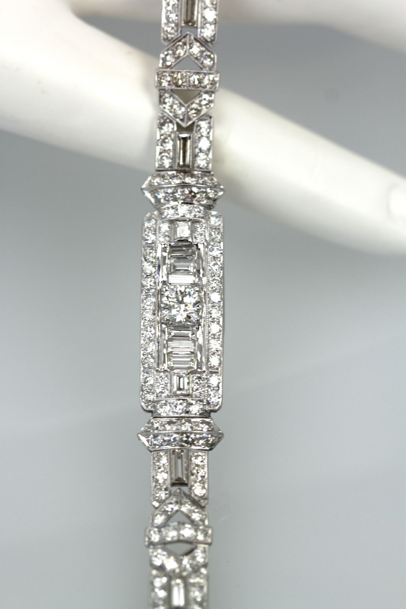 Deco Diamond Bracelet 1930. This bracelet is absolutely gorgeous. Very bright and diamonds show very white. This bracelet is highly detailed with baguettes and round diamonds in an intricate shape. This has 6.97 carats of diamonds, average color HI clarity SI of both baguettes and round diamonds. The center holds a 1/2 carat round. Believed to be a watch that was converted, but excellently done - one would never know.This comes with a certificate of appraisal dated April 13, 2015 for $12,500.00.