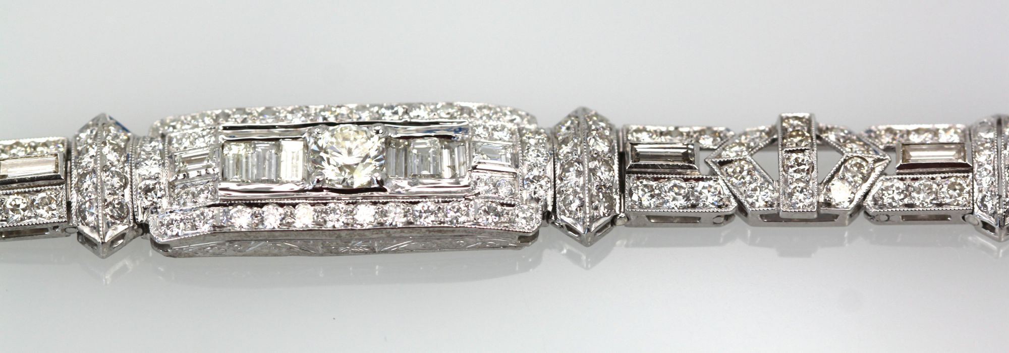 Deco Diamond Bracelet 1930. This Deco 18K Round & Baguette Diamond 6.97 Carats Bracelet is absolutely gorgeous. Very bright and diamonds show very white. This bracelet is highly detailed with baguettes and round diamonds in an intricate shape. This has 6.97 carats of diamonds, average color HI clarity SI of both baguettes and round diamonds. The center holds a 1/2 carat round. Believed to be a watch that was converted, but excellently done – one would never know.