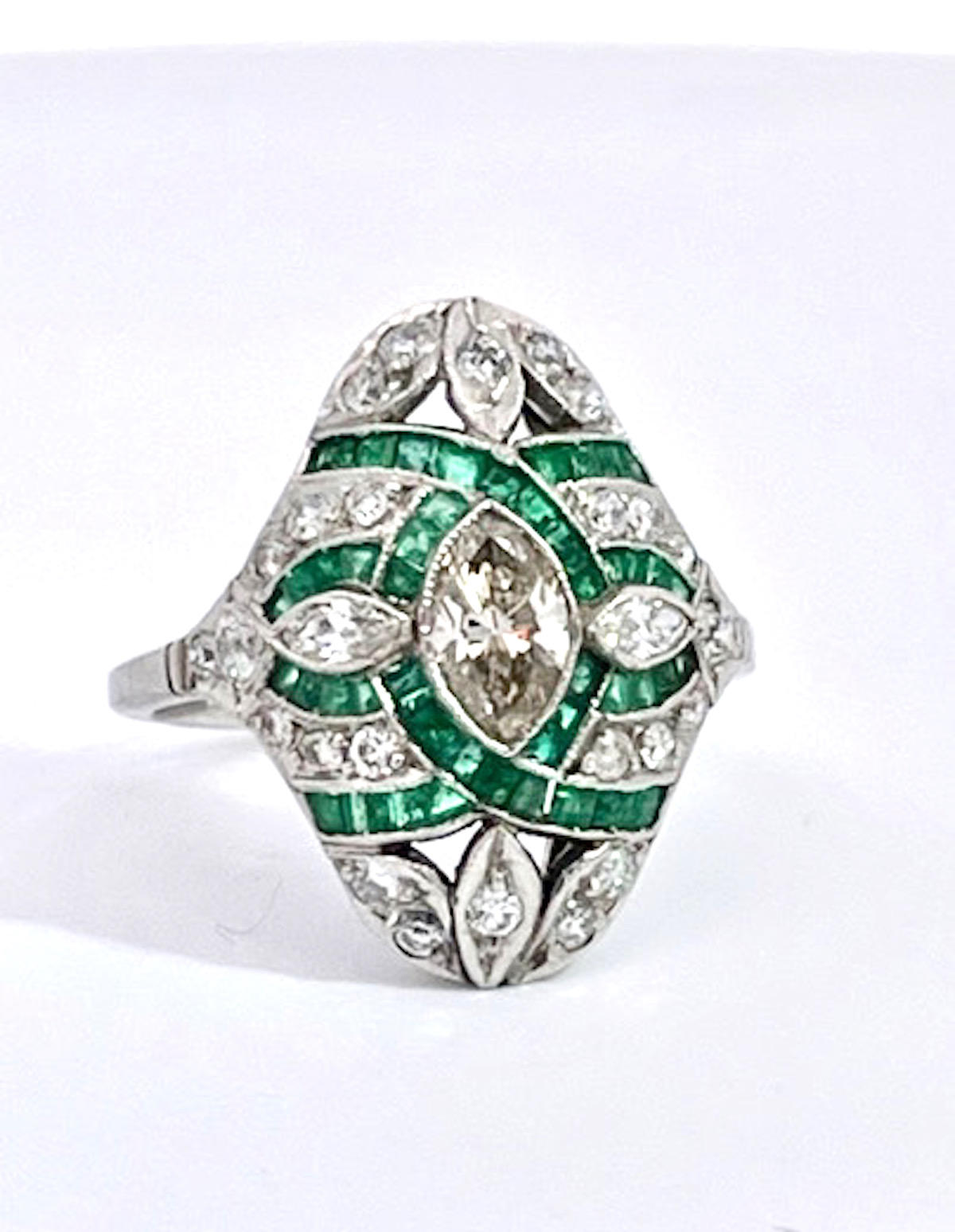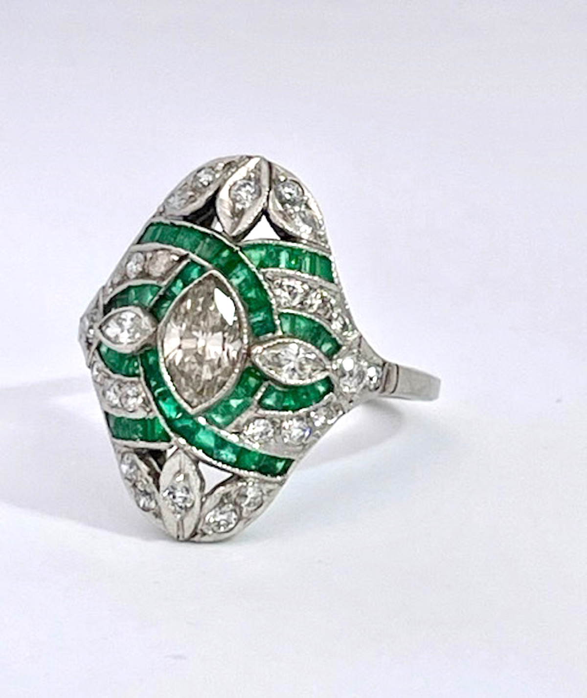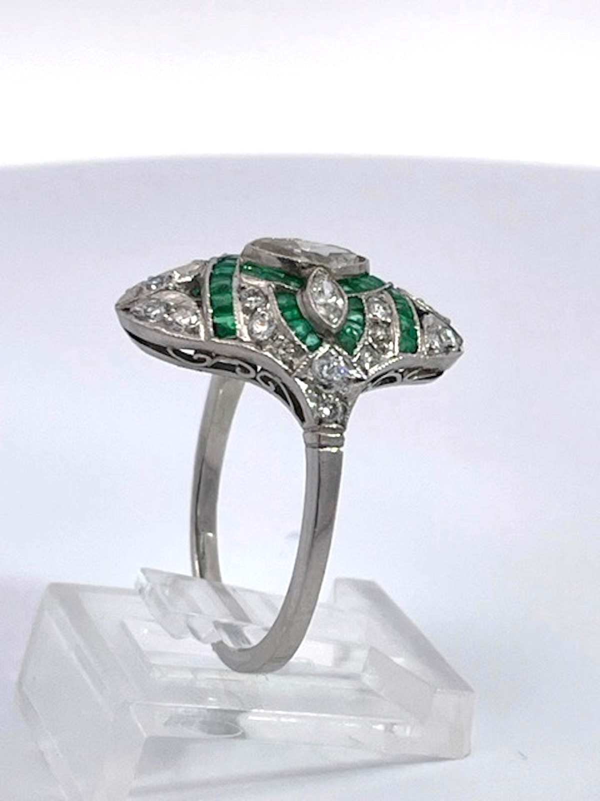 This gorgeous Deco Shuttle ring is done in 18K White Gold. This ring comes out of Spain and is delightful in the design which is double crossed C’s and the size is 20.27 cm x 16.74 cm and ring size 6.5 which is sizable. The main stone is a Diamond Marquis cut of 0.56 carats with curved bands of brilliant cut Emeralds total weight is 0.46 Carats. There are 16 round brilliant cut Diamonds of approximately 1.00 carat. Barcelona was a big center for Art Dco and the Spanish had their own style which is a bit different from the European style. This ring is special and a nice match to the Deco Emerald drop earrings I have listed see item #87099.