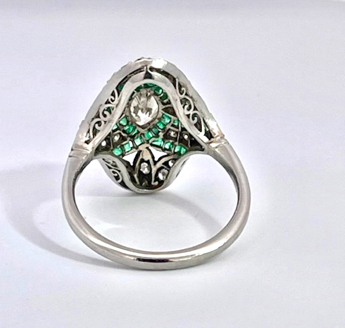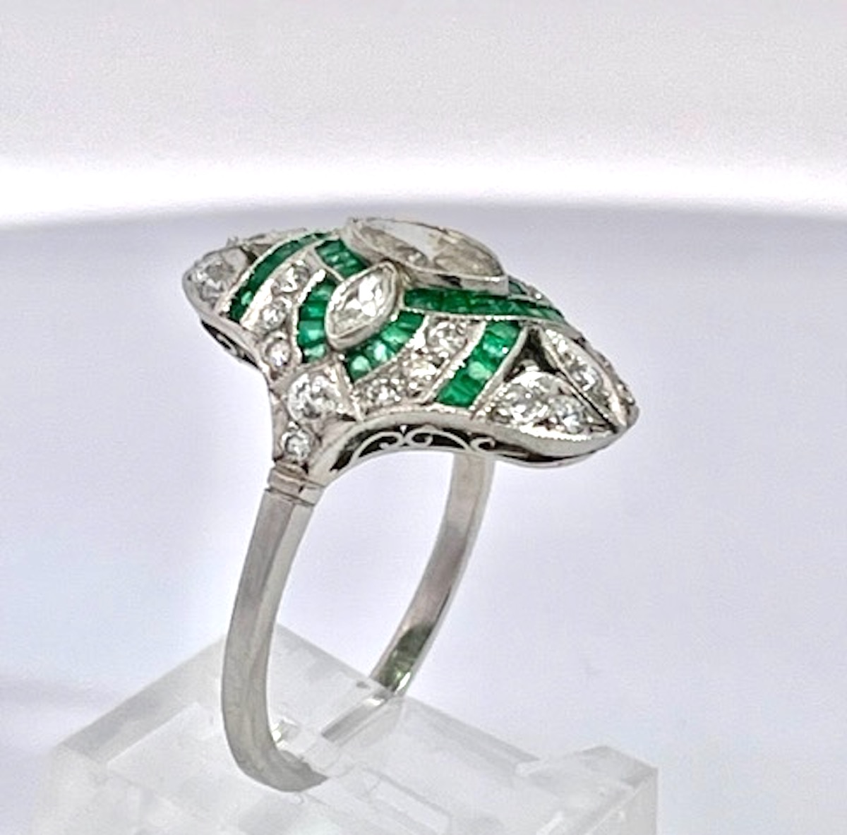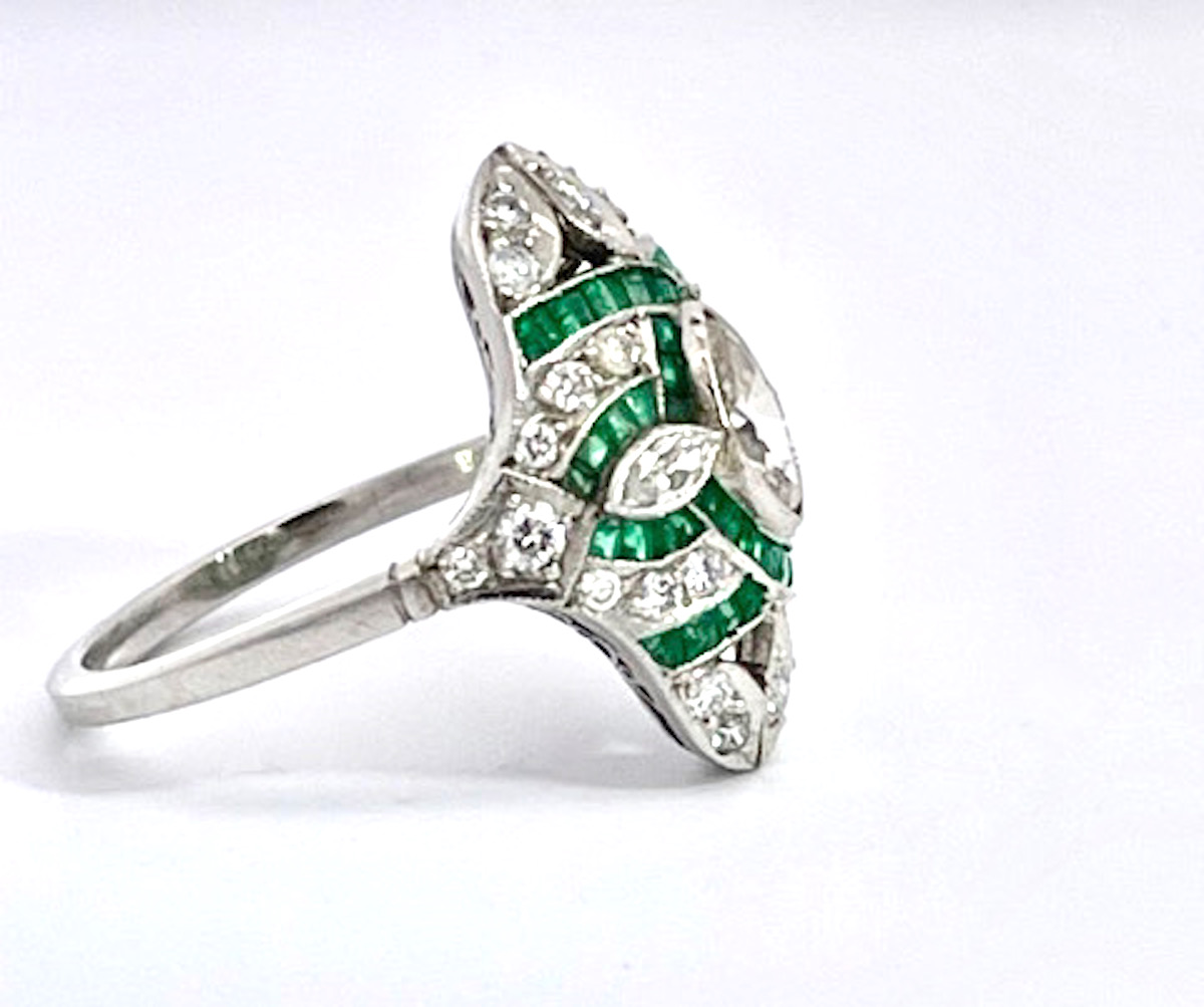 This gorgeous Deco Shuttle ring is done in 18K White Gold. This ring comes out of Spain and is delightful in the design which is double crossed C’s and the size is 20.27 cm x 16.74 cm and ring size 6.5 which is sizable. The main stone is a Diamond Marquis cut of 0.56 carats with curved bands of brilliant cut Emeralds total weight is 0.46 Carats. There are 16 round brilliant cut Diamonds of approximately 1.00 carat. Barcelona was a big center for Art Dco and the Spanish had their own style which is a bit different from the European style. This ring is special and a nice match to the Deco Emerald drop earrings I have listed see item #87099.