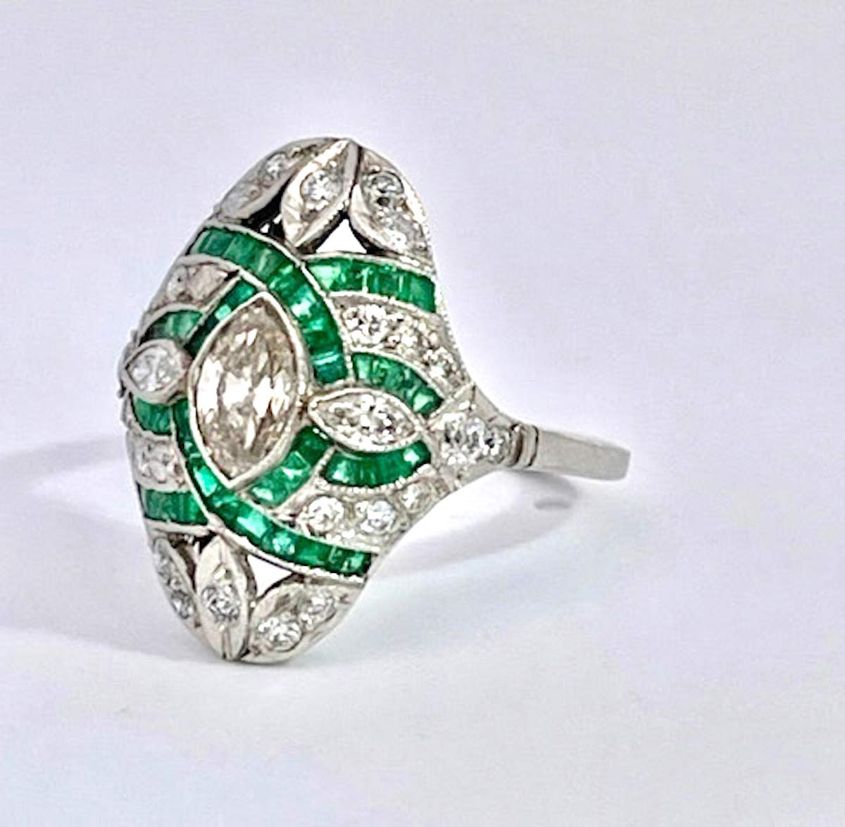 This gorgeous Deco Shuttle ring is done in 18K White Gold. This ring comes out of Spain and is delightful in the design which is double crossed C's and the size is 20.27 cm x 16.74 cm and ring size 6.5 which is sizable. The main stone is a Diamond Marquis cut of 0.56 carats with curved bands of brilliant cut Emeralds total weight is 0.46 Carats. There are 16 round brilliant cut Diamonds of approximately 1.00 carat. Barcelona was a big center for Art Dco and the Spanish had their own style which is a bit different from the European style. This ring is special and a nice match to the Deco Emerald drop earrings I have listed see item #87099.