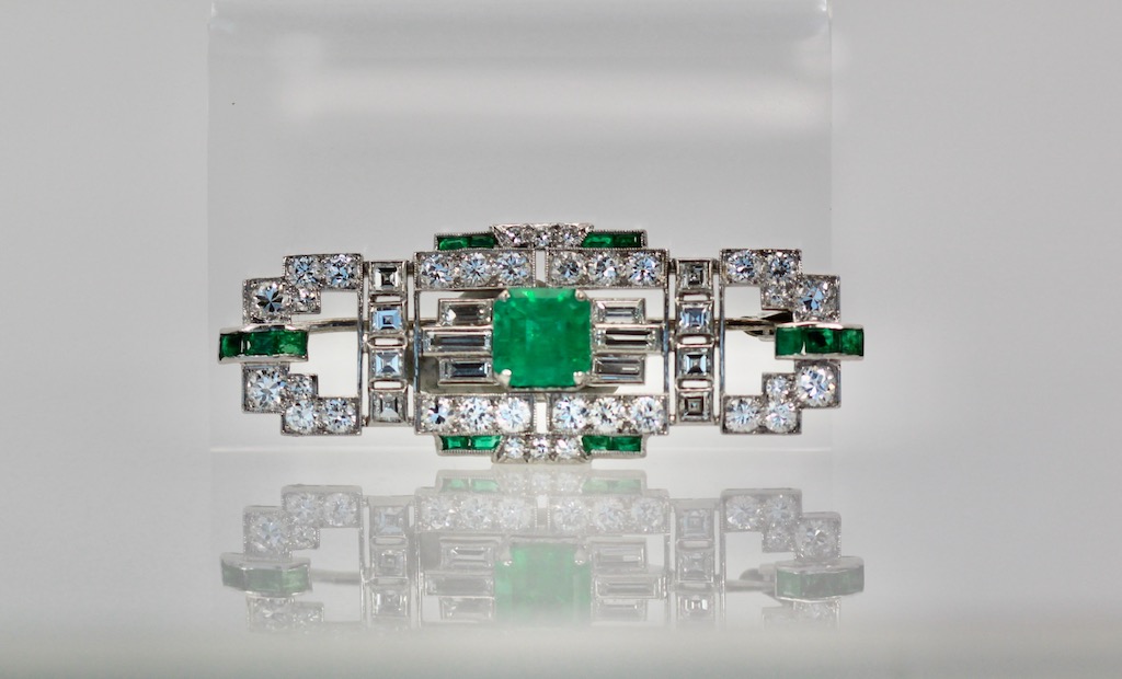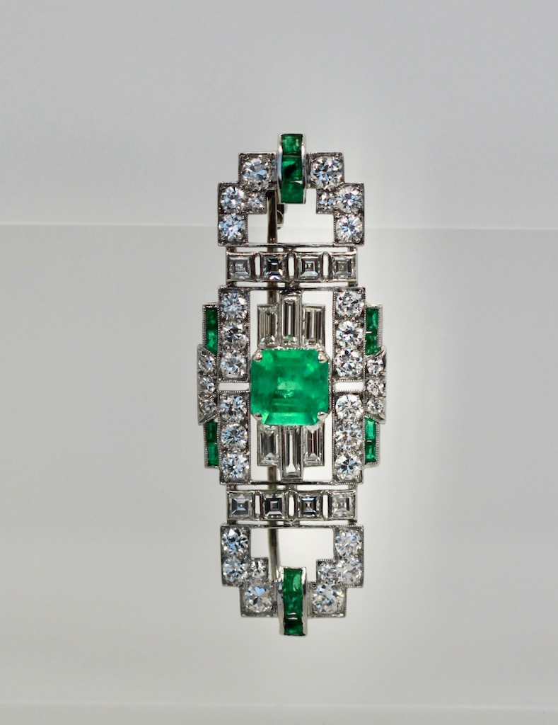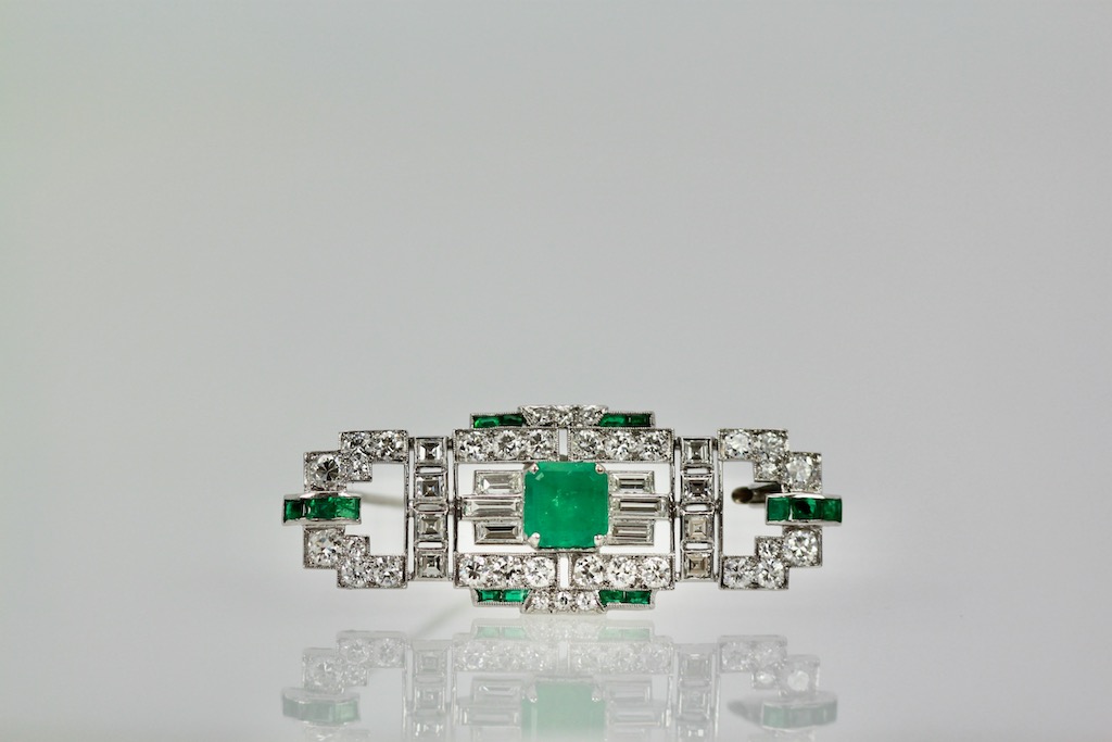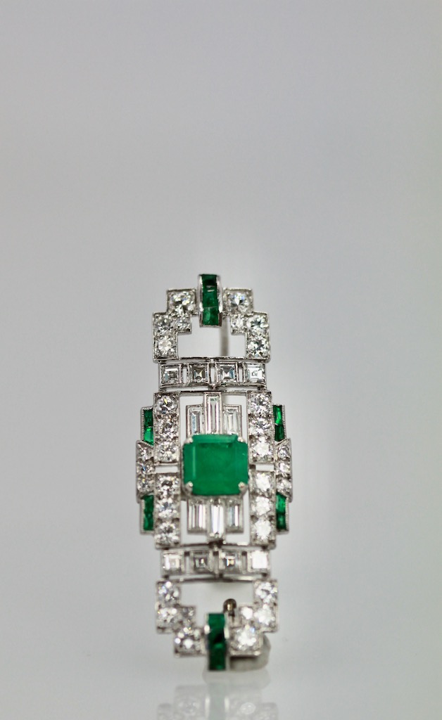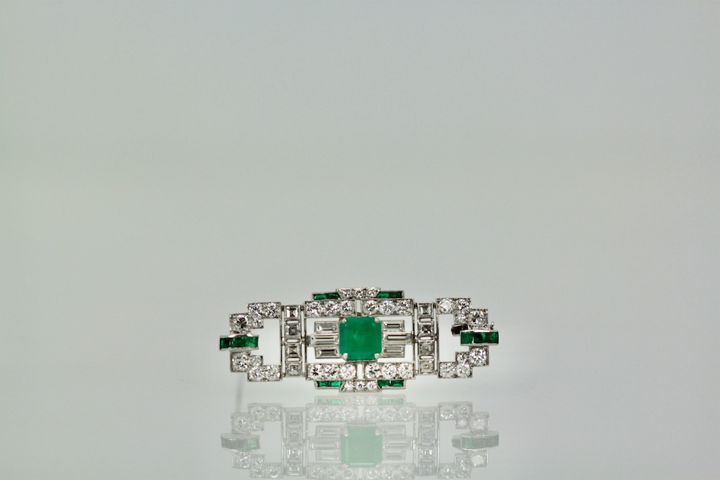 Deco Platinum Emerald Diamond Brooch