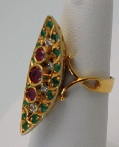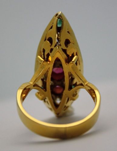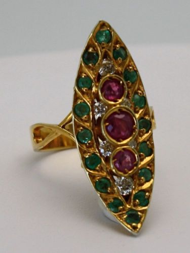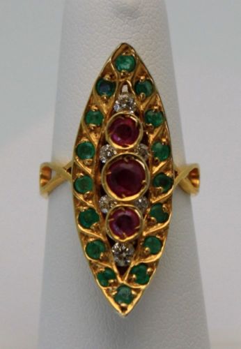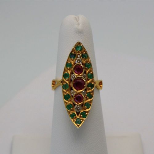 The Art Deco pagoda Emerald and Ruby ring was all the rage during the early 1930's. The 1930's brought back a fascination with all things Asian. The 1920's focused on all things Egyptian. This style ring, also called naivete, bridged the two and was made for over a 10 year period. Naivete jewelry was first seen in and around the Edwardian period, in single cut diamonds as well. At over 70 years old, this ring features 3 gorgeous rubies in the center, diamonds around the rubies, and emeralds on the outer surround. It is a stunning example of Deco period fine jewelry. These pieces grow in value as the shortage of supply outweighs the demand.