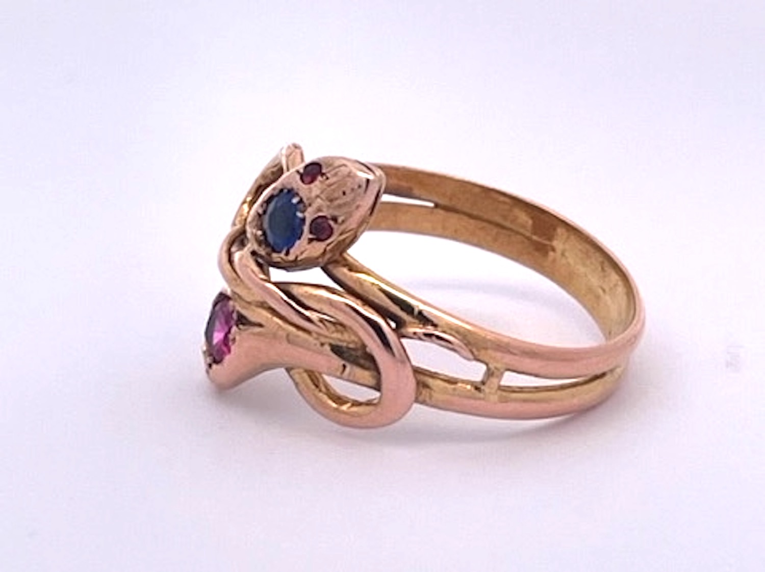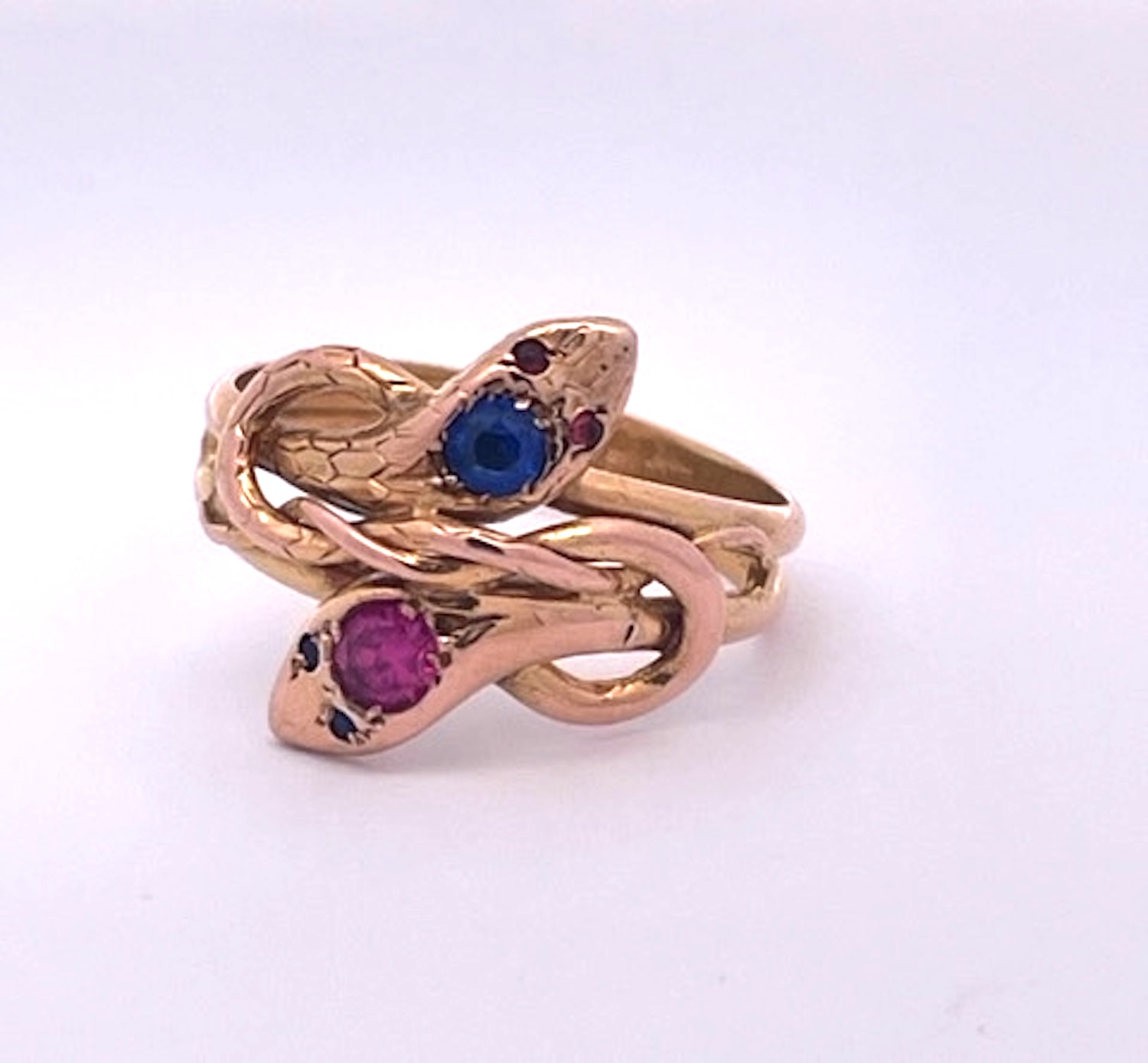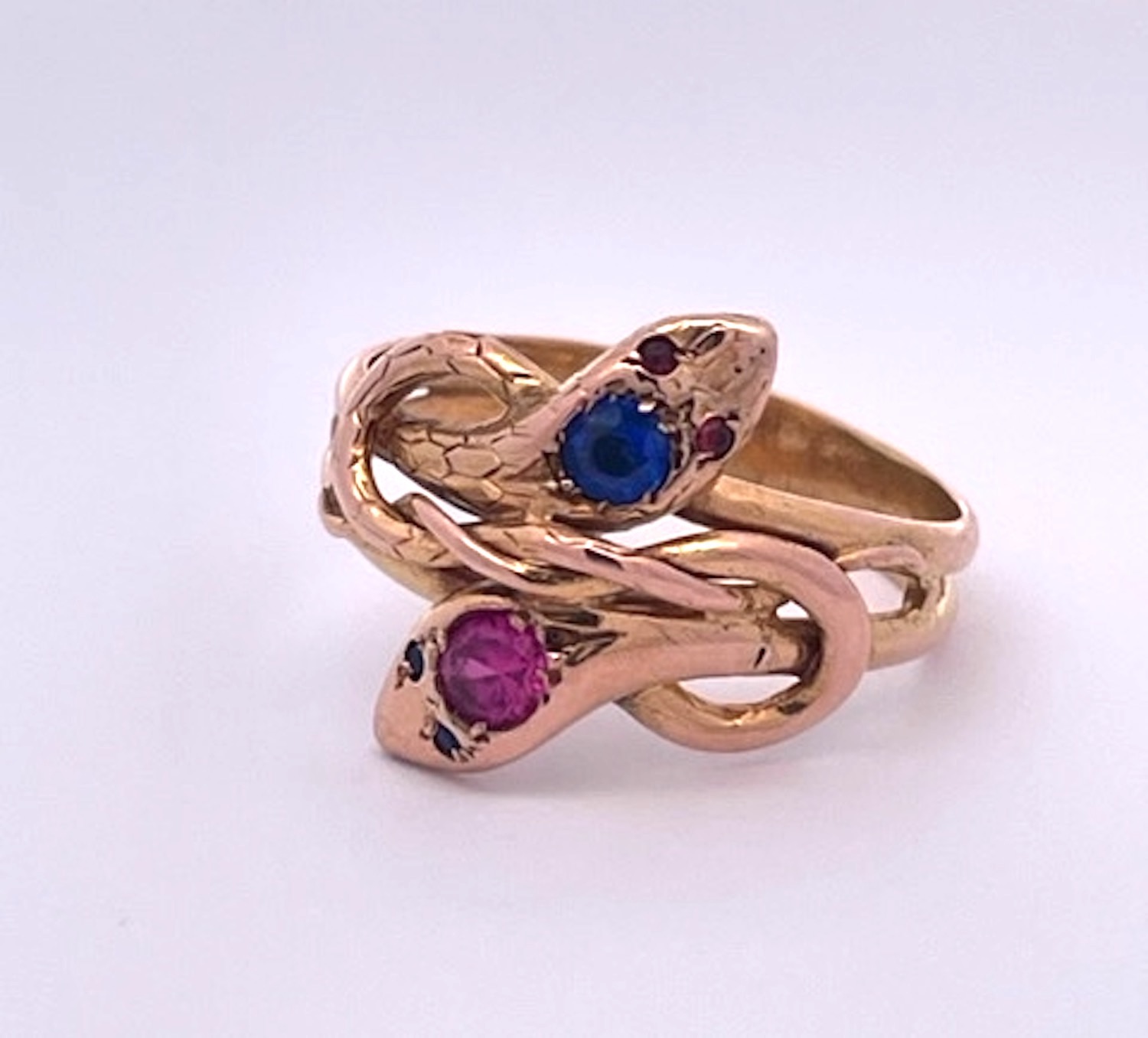 Double Snake Ring Blue Pink Sapphire Head 14K