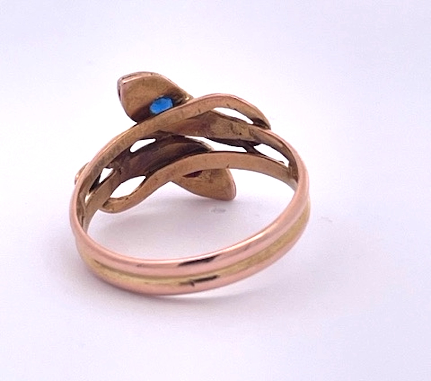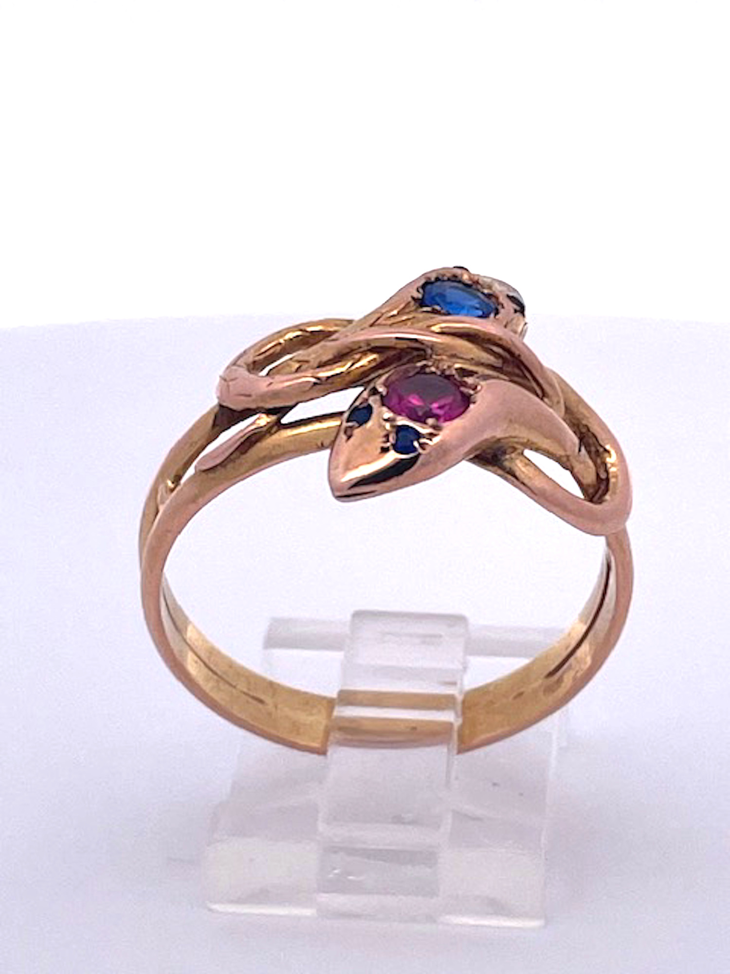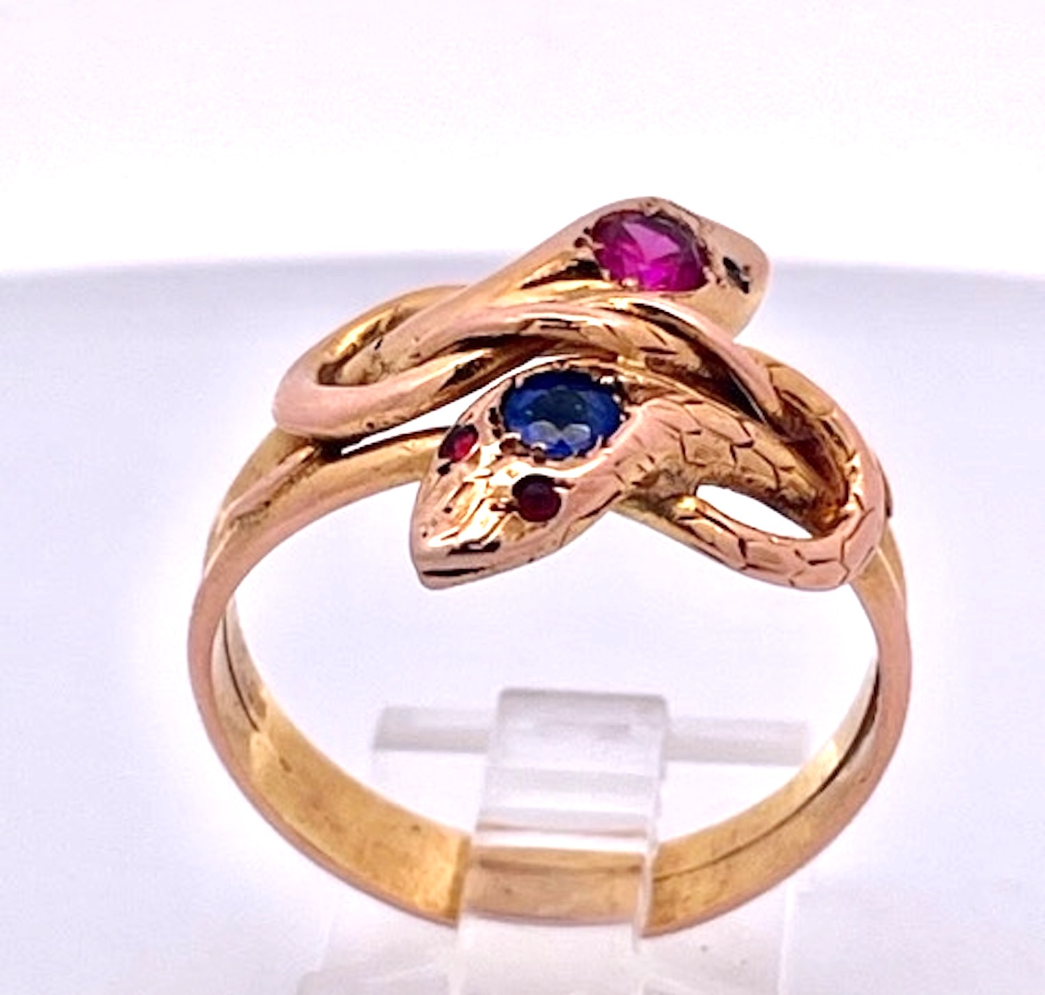 This lovely snake ring goes so well with the listed bracelet in another of my listing. This double snake ring has 1 Pink Sapphire and the other has 1 Blue Sapphire on the head. I believe these to be synthetic stones because they were not tested and it was common to do so. This ring always makes me smile. It is 19.80mm north to south and 18.09mm east to west it weighs in at 6.27 grams. It is large a size 11 but it can be sized down. I added a photo of the bracelet both unique as double headed snake rings or bracelets were rare and still are. If you are a snake lover such as myself you will be able to appreciate these pieces. Priced right for the Holidays, don't wait. This matches a double head snake bracelet in another listing with Blue and Pink Sapphire Head.