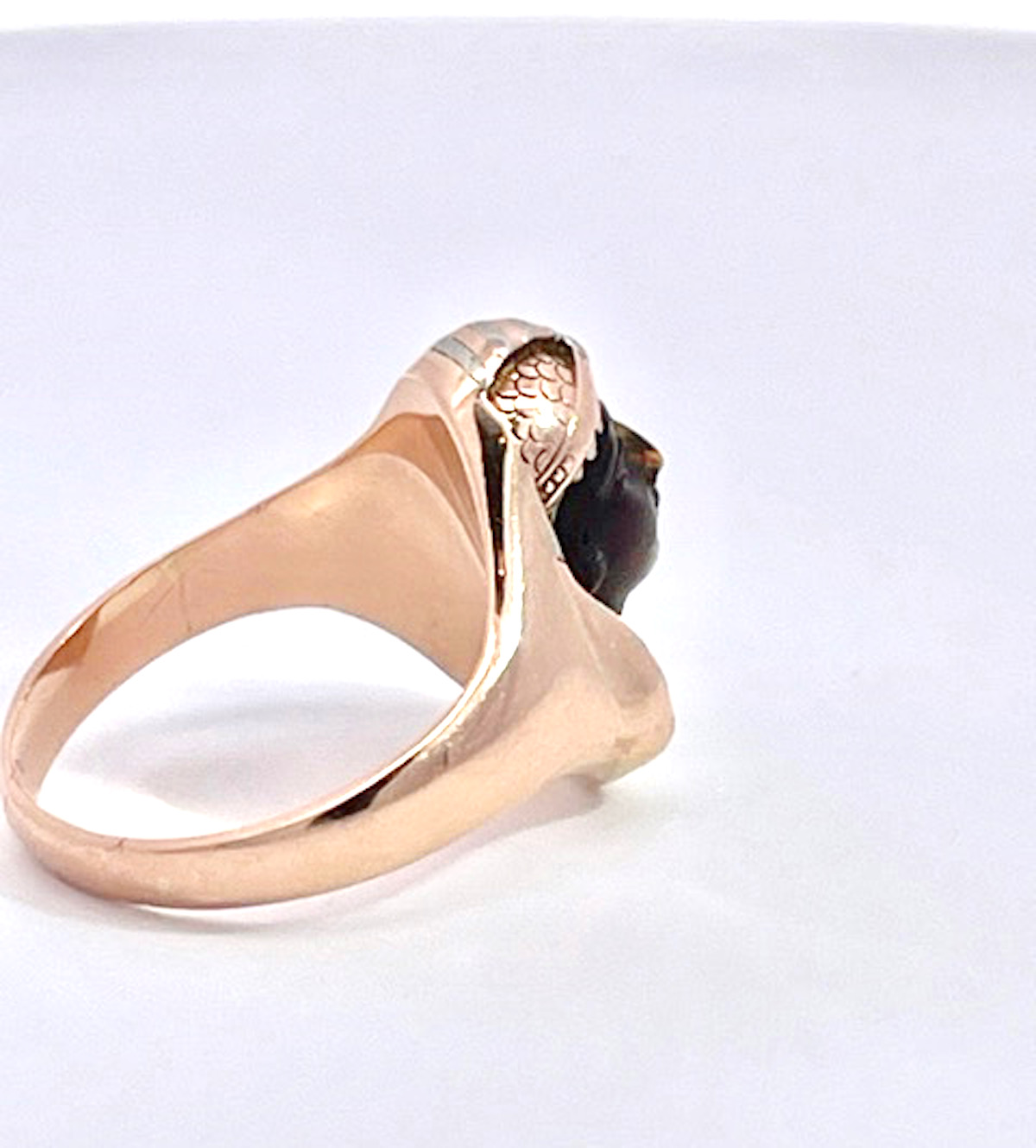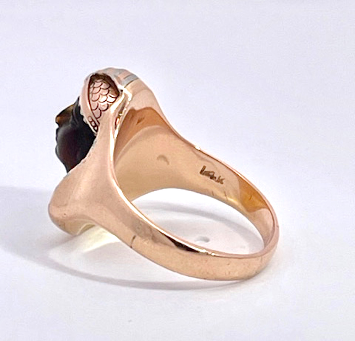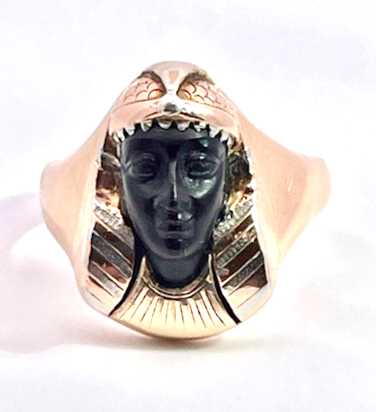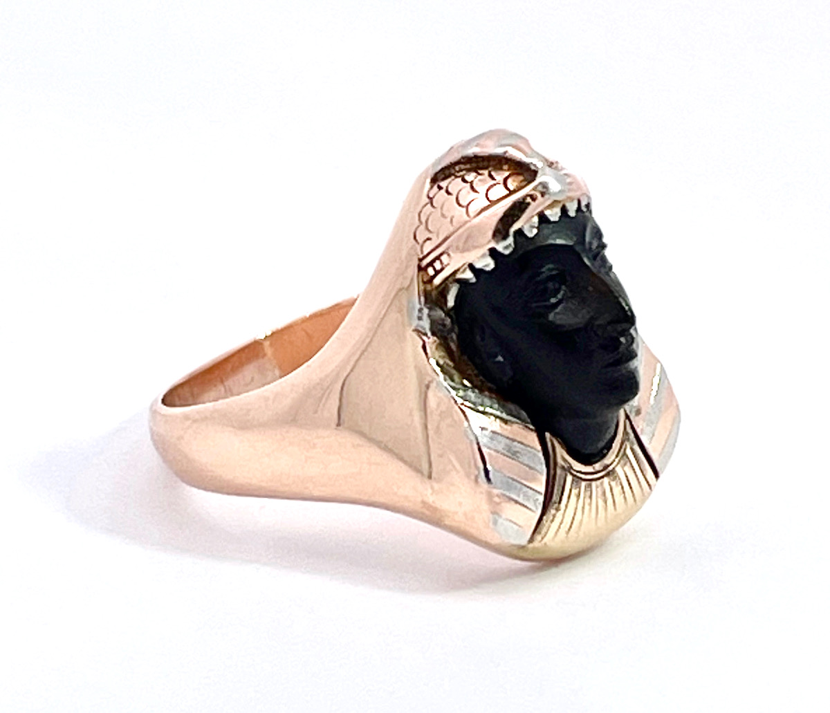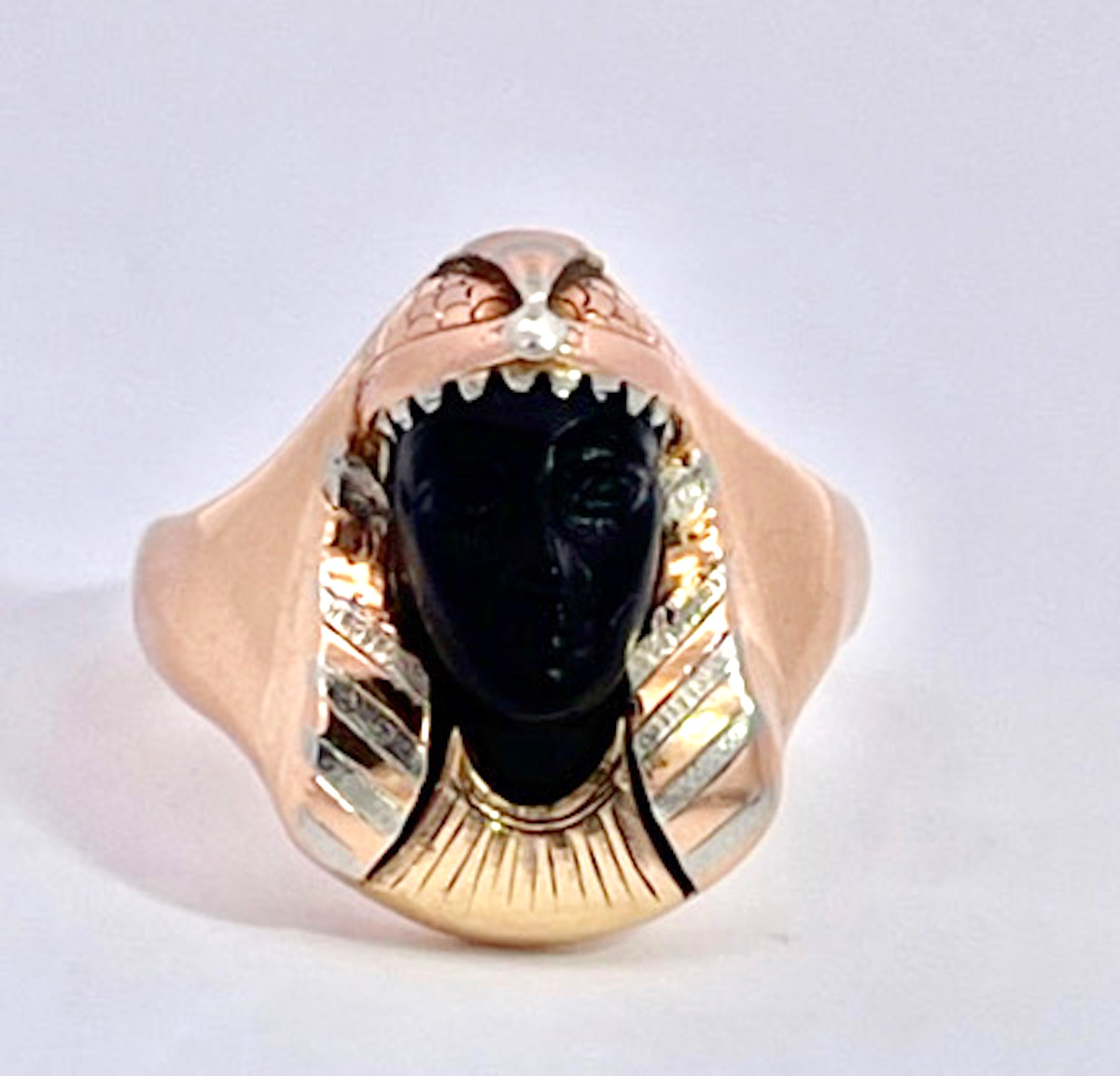 This Egyptian Revival Black Onyx Pharaoh Ring is set in tri-color gold with alot of detail. The carved Onyx face is exquisite in perfect condition and gives this ring such a calming serene presence. Once you put this ring on your finger you will see how wonderful the energy is. I am one to believe that good or bad energy is left in objects and this one is beautiful. This ring has a detailed sculpted head of the pharaoh is beautiful as well as the base of this ring. The ring measures 16.62 cm x 16.28 cm the weight is 7.6 grams and this is a size 5.75 and can be sized up or down. Do not wait this special ring will sell fast.