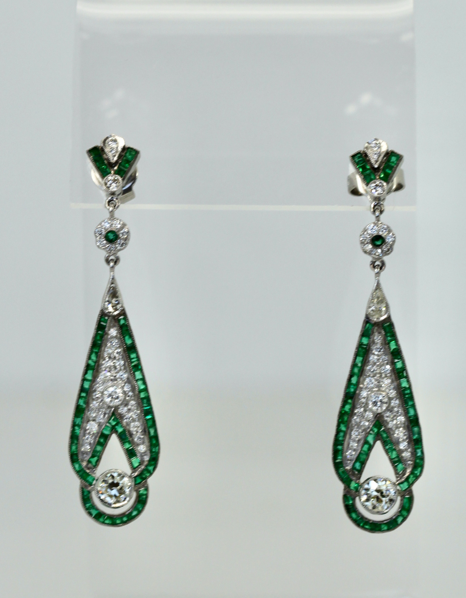 These gorgeous Emerald Diamond Pendant earrings are from France and they are lovely. These pendant earrings weight 13.9 grams and they are 5cm long x 14 mm wide. The top has 6 baguette Emeralds, 2 small Diamonds, a Diamond flower with Emerald center, 1 pear shaped Diamond, 2 round Diamonds, Diamond pave, and baguette Emeralds surround with bottom Emerald loop. Bottom Diamonds .65 points. These earrings are quite versatile and you can wear with so many different items especially anything with Emeralds as they work well. These are gorgeous and match well with my new listing of a Deco Diamond Emerald ring. I wouldn't wait too long to make a decision as these are gorgeous and will not last long.