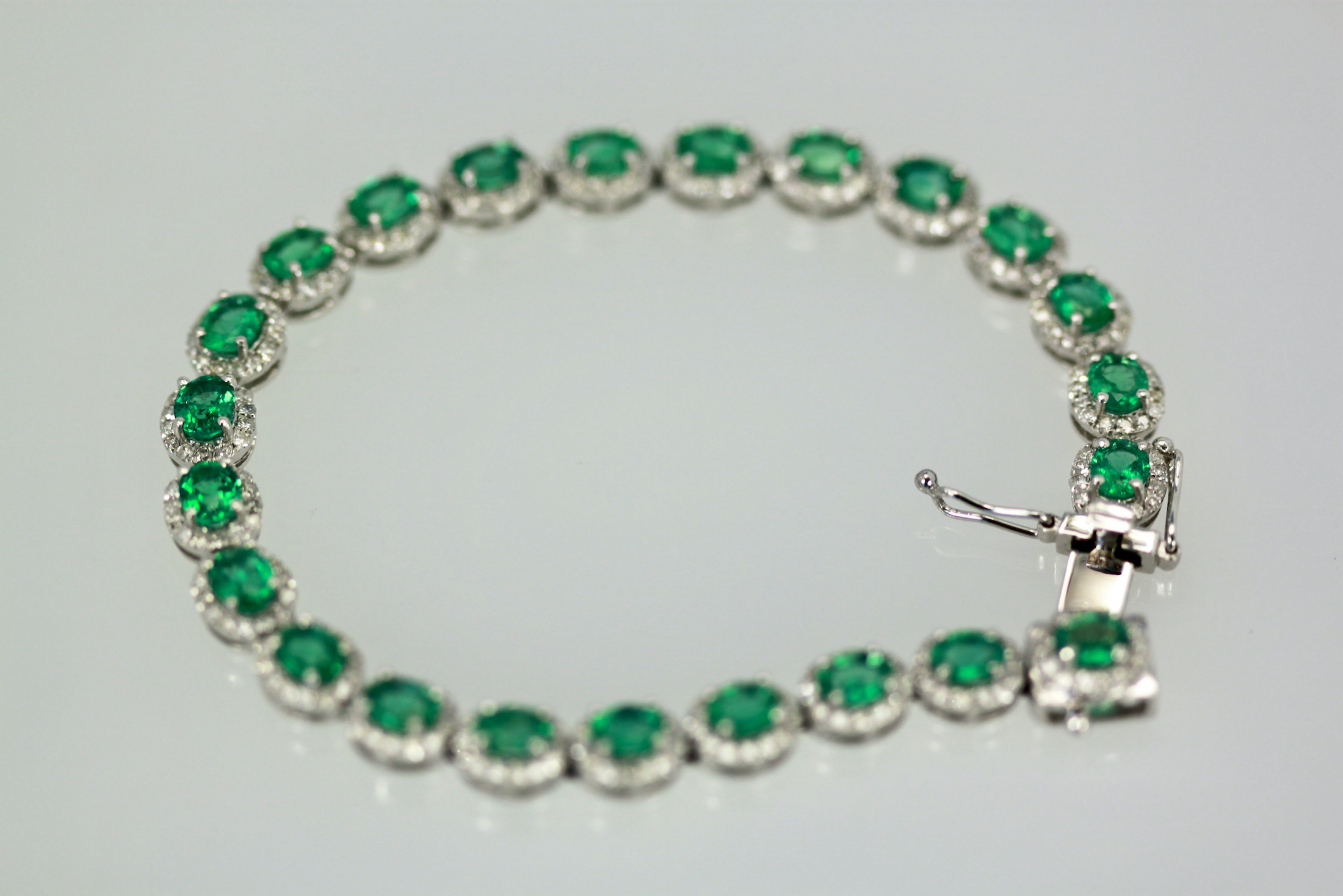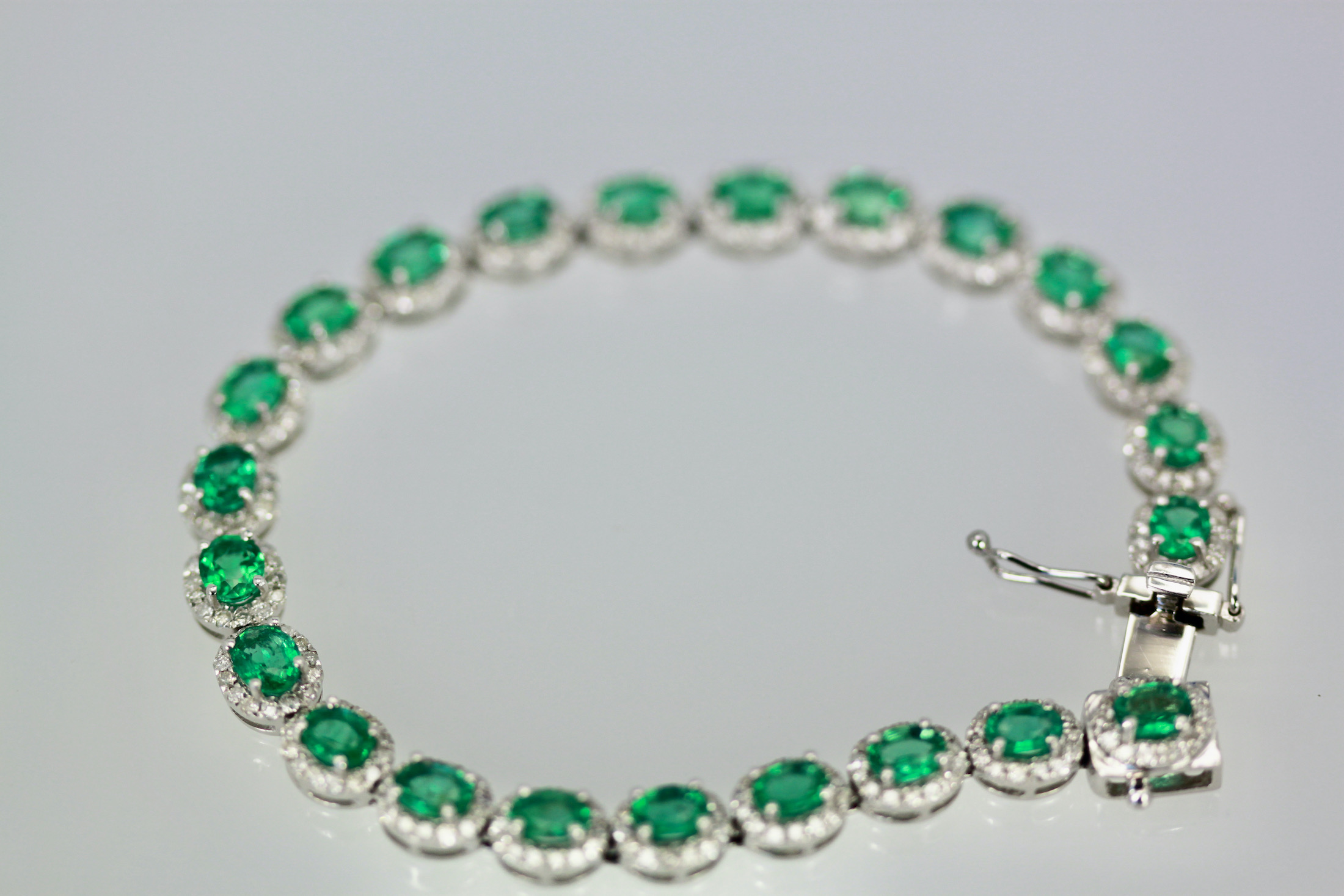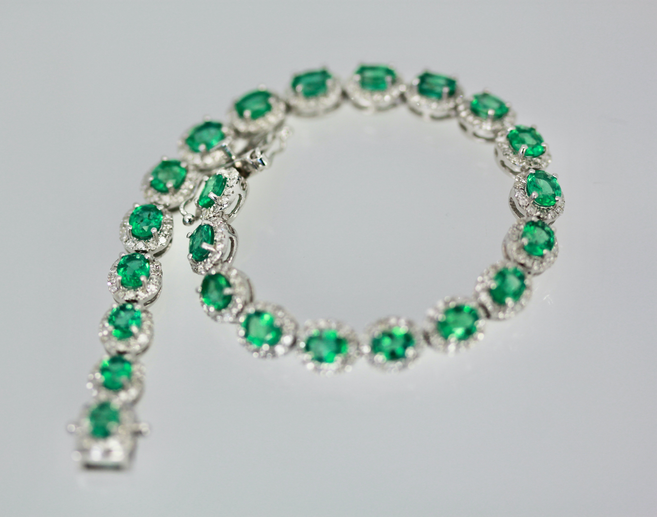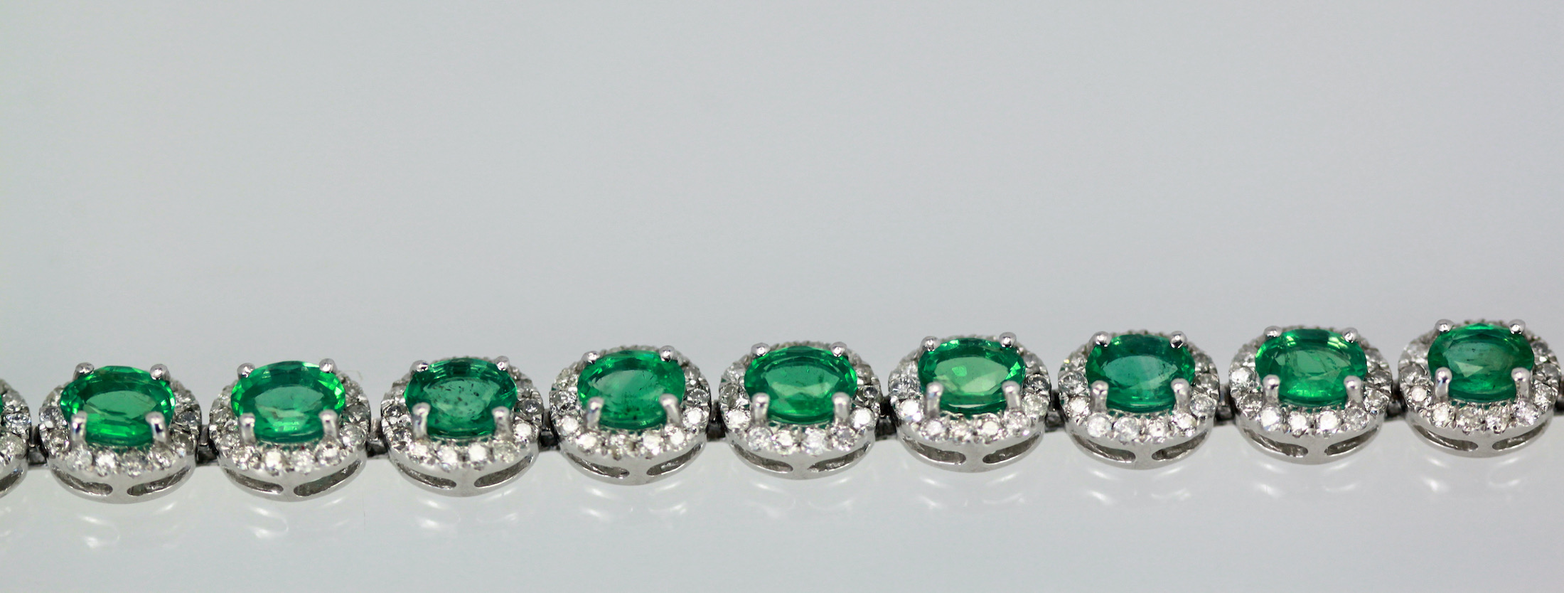 If you love Emeralds as I do you will love this bracelet. This gorgeous bracelet is done in perfectly matched Emeralds with a Diamond surround. The bracelet is 7" long, width is 5mm and weights 22.6 grams. The Emeralds are natural oval brilliant crown cut there are twenty three measuring 5x4 and totaling 6.55 carats, good to very good. Each Emerald is 0.40 carats each. The brilliant cut natural Diamonds are round, three hundred twenty two at 1.2mm for 2.29 carats, G, SI. Total carat weight 8.84 carats. This bracelet is special and under valued as it is priced to sell.