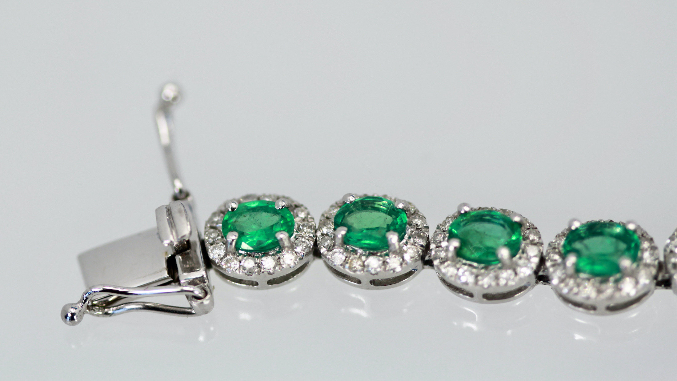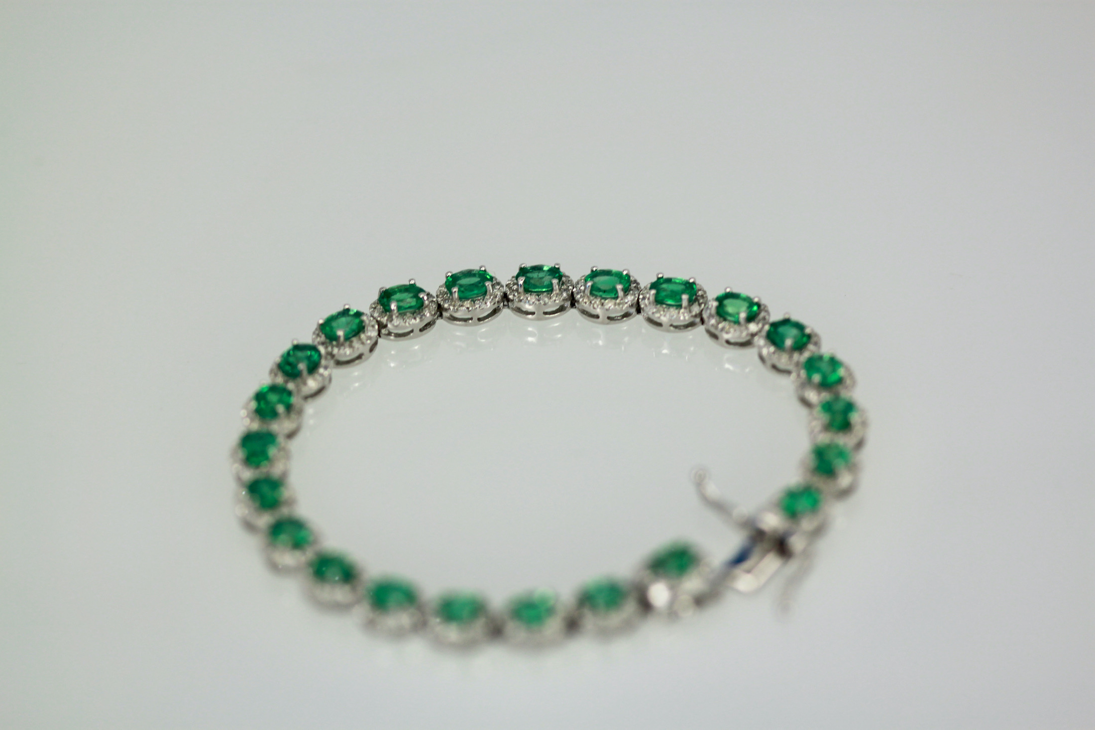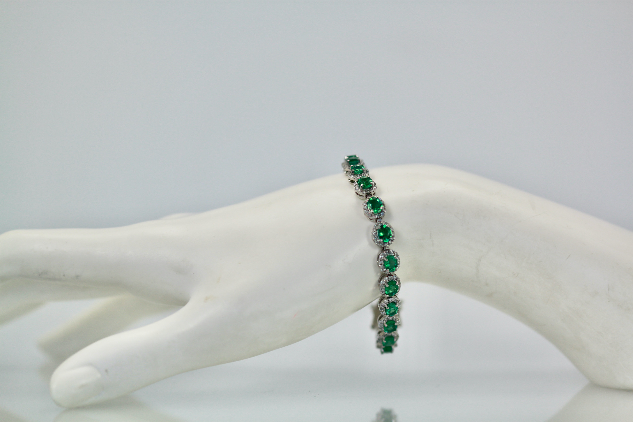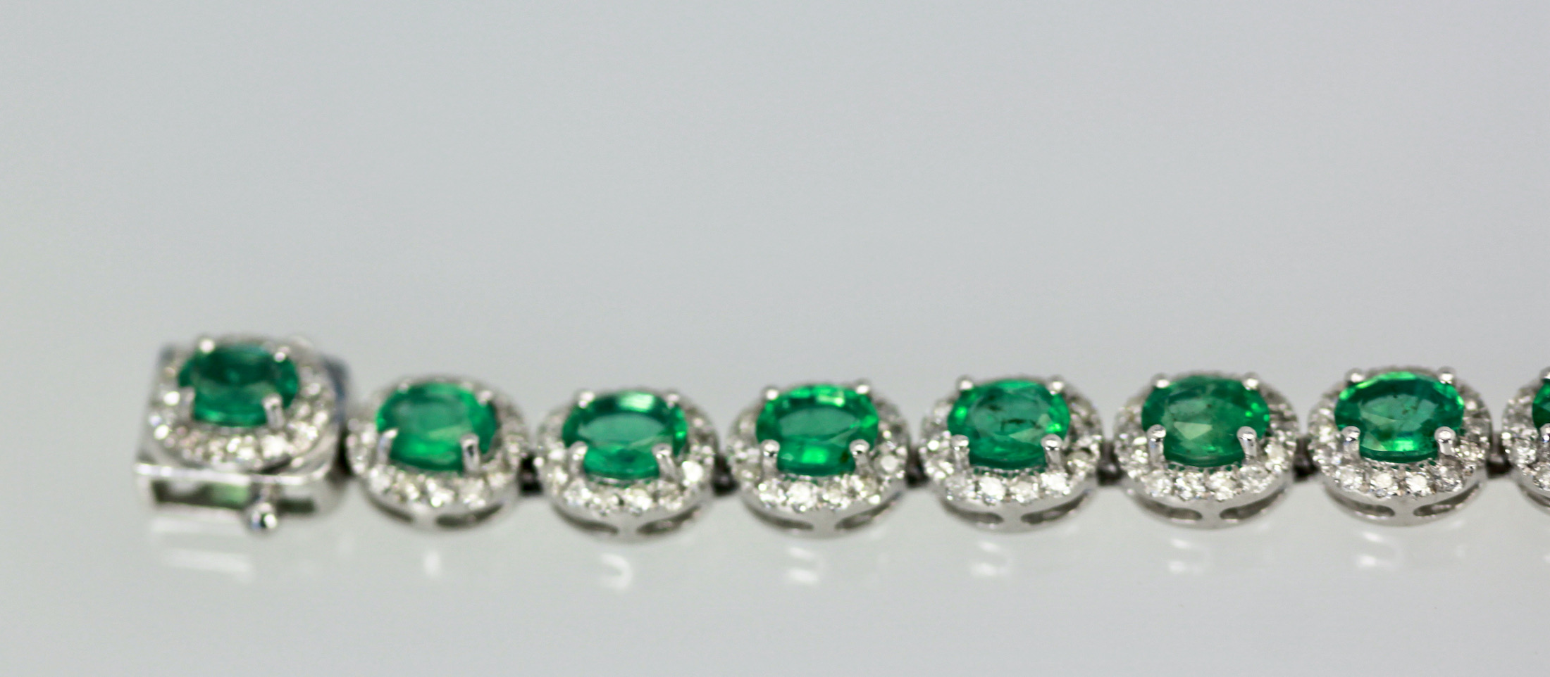 If you love Emeralds as I do you will love this bracelet. This gorgeous bracelet is done in perfectly matched Emeralds with a Diamond surround. The bracelet is 7" long, width is 5mm and weights 22.6 grams. The Emeralds are natural oval brilliant crown cut there are twenty three measuring 5x4 and totaling 6.55 carats, good to very good. Each Emerald is 0.40 carats each. The brilliant cut natural Diamonds are round, three hundred twenty two at 1.2mm for 2.29 carats, G, SI. Total carat weight 8.84 carats. This bracelet is special and under valued as it is priced to sell.