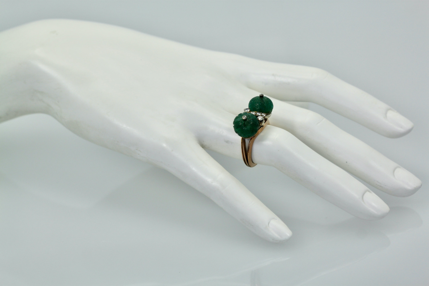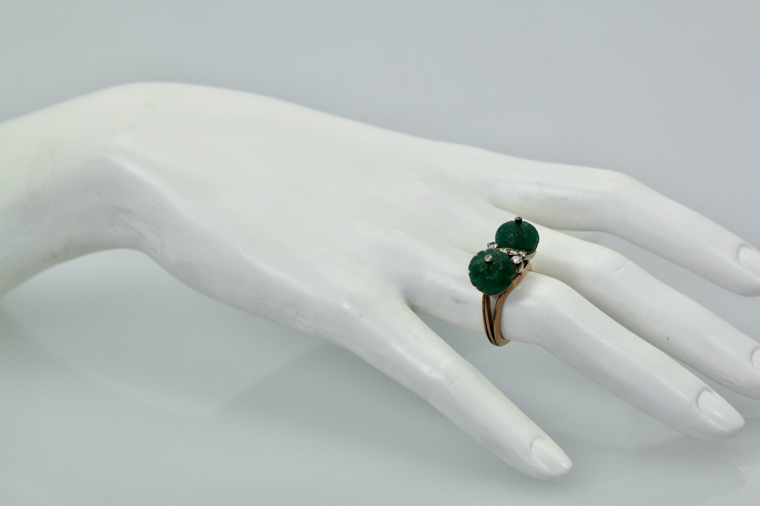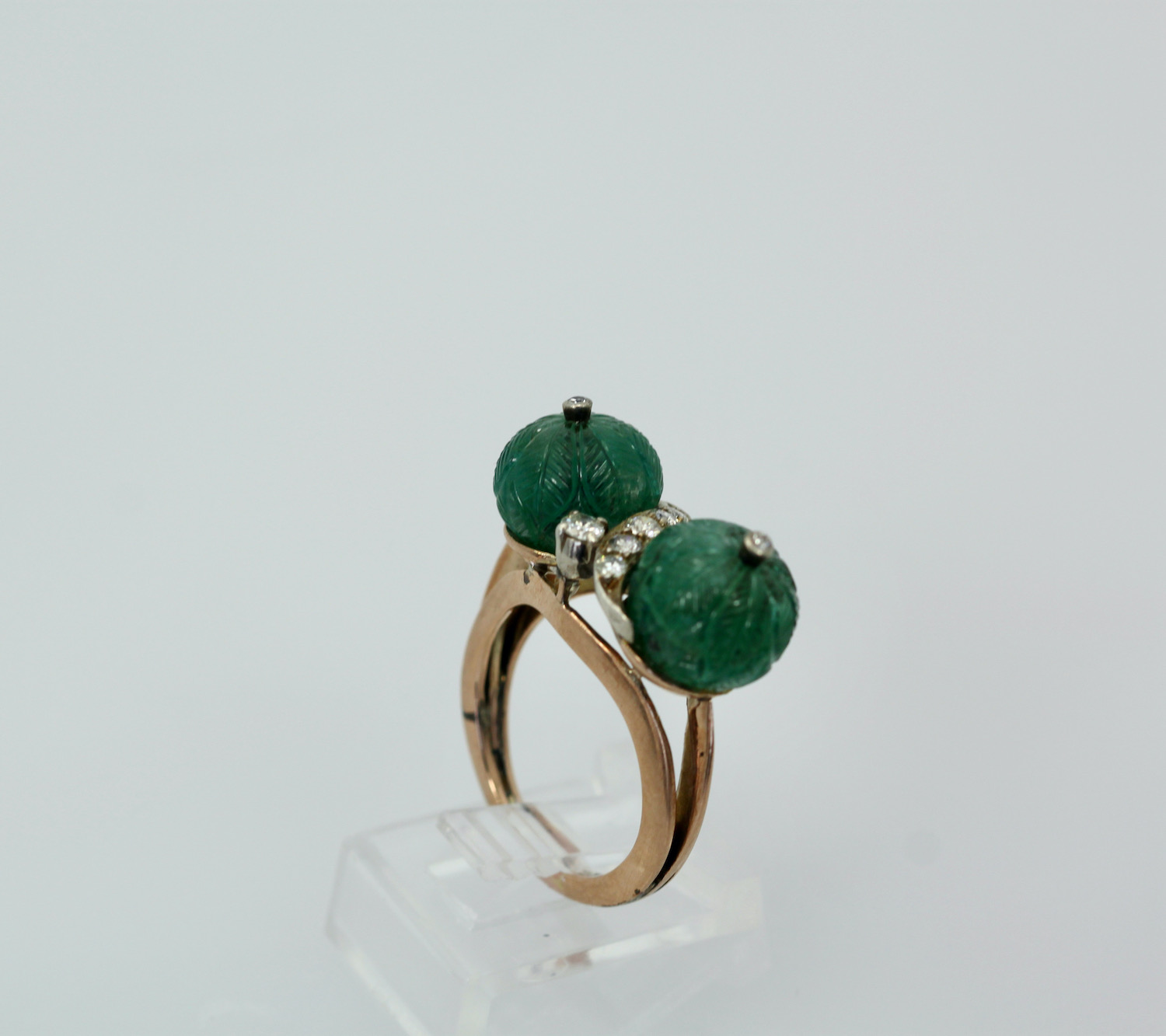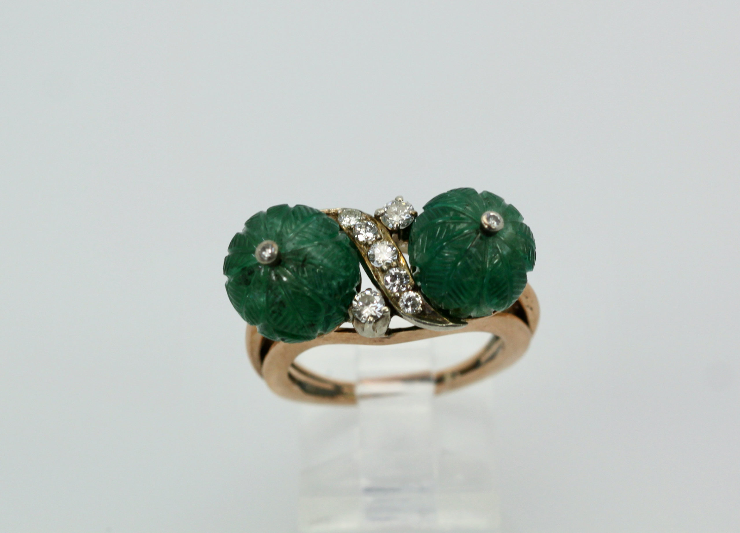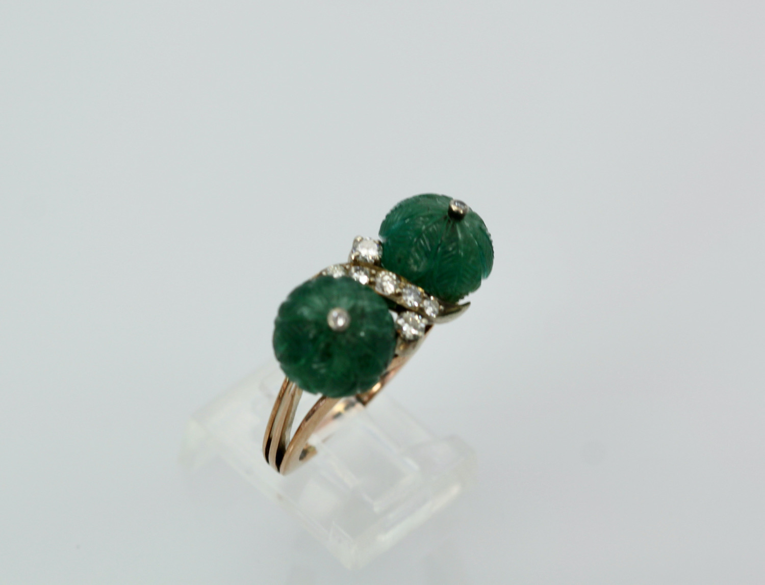 This Emerald Double Carved Diamond Ring is lovely and features two Emerald "Carved" Beads with a Diamond in the center. These Emerald beads have a beautiful carving of what seems to be melons very detailed and lovely. In addition there are 7 Diamonds in the center of the ring and the base is Rose gold in 14K. The Carved Emerald beads are 10.16 mm to 10.21 mm width is 24.22 length is 8.81mm and weights 7.7 grams. These beads and ring are lovely not expensive yet makes a statement. If you love Emeralds as I do this is a great piece to own and I would not wait or it might be too late as I have this posted on several sites.